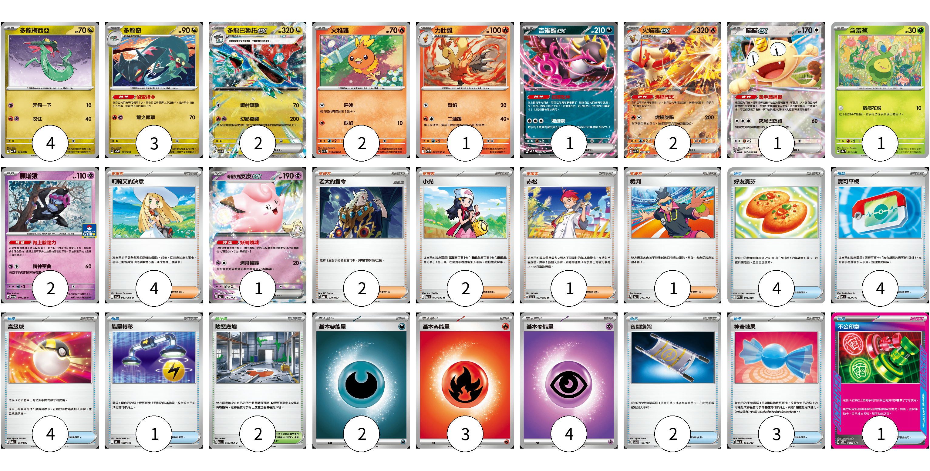 牌組構築方案 以此牌組為基礎新構築牌組 顯示卡面 顯示列表 寶可夢卡(20) 4 3 2 2 1 1 2 1 1 2 1 物品卡(19) 4 4 4 1 2 3 1 支援者卡(10) 4 2 2 1 1 競技場卡(2) 2 能量卡(9) 2 3 4 寶可夢卡(20) 卡牌名稱 張數 卡牌名稱 張數 多龍梅西亞 MC 546/742 04 多龍奇 M2a 133/193 03 多龍巴魯托ex M2a 134/193 02 火稚雞 SV10 018/098 02 力壯雞 SV10 019/098 01 吉雉雞ex MC 489/742 01 火焰雞ex SVM 016/175 02 喵喵ex M3 061/080 01 含羞苞 SV8a 001/187 01 願增猿 M-P 014/M-P 02 莉莉艾的皮皮ex MC 287/742 01 物品卡(19) 卡牌名稱 張數 卡牌名稱 張數 好友寶芬 SVTG 011/019 04 寶可平板 MC 662/742 04 高級球 MBD 014/022 04 能量轉移 MC 638/742 01 夜間擔架 SV8a 151/187 02 神奇糖果 MC 655/742 03 不公印章 MBD 011/022 01 支援者卡(10) 卡牌名稱 張數 卡牌名稱 張數 莉莉艾的決意 M1L 062/063 04 老大的指令 MBG 021/022 02 小光 M2 077/080 02 赤松 SV7 097/102 01 裁判 MC 711/742 01 競技場卡(2) 卡牌名稱 張數 卡牌名稱 張數 險惡廢墟 M1L 063/063 02 能量卡(9) 卡牌名稱 張數 卡牌名稱 張數 基本【惡】能量 MC DAR 02 基本【火】能量 MC FIR 03 基本【超】能量 MBD PSY 04 以此牌組為基礎新構築牌組 牌組編碼 bxZWdb-bgeyAS-UwVSOR copy 列印牌組單 牌組編碼已複製 分享至SNS