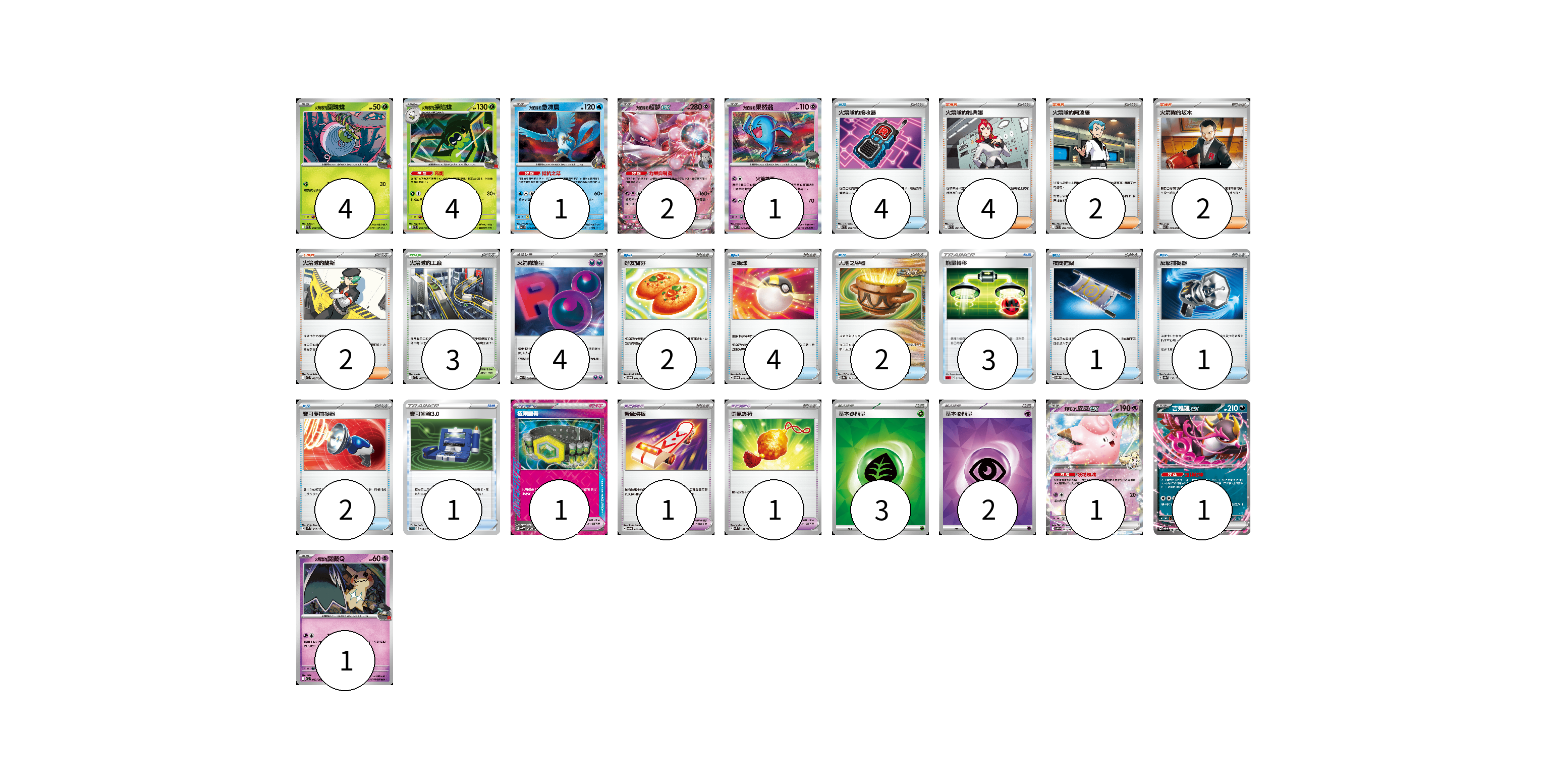 牌組構築方案 以此牌組為基礎新構築牌組 顯示卡面 顯示列表 寶可夢卡(15) 4 4 1 2 1 1 1 1 寶可夢道具(3) 1 1 1 物品卡(20) 4 2 4 2 3 1 1 2 1 支援者卡(10) 4 2 2 2 競技場卡(3) 3 能量卡(9) 4 3 2 寶可夢卡(15) 卡牌名稱 張數 卡牌名稱 張數 <火箭隊的>團珠蛛 SV10 008/098 04 <火箭隊的>操陷蛛 SV10 009/098 04 <火箭隊的>急凍鳥 SV10 022/098 01 <火箭隊的>超夢ex SV10 039/098 02 <火箭隊的>果然翁 SV10 040/098 01 莉莉艾的皮皮ex SV9 033/100 01 吉雉雞ex SVOD 004/020 01 <火箭隊的>謎擬Q SV10 042/098 01 寶可夢道具(3) 卡牌名稱 張數 卡牌名稱 張數 極限腰帶 SV5K 066/071 01 緊急滑板 SVOD 015/020 01 勇氣護符 SVM 142/175 01 物品卡(20) 卡牌名稱 張數 卡牌名稱 張數 火箭隊的接收器 SV10 090/098 04 好友寶芬 SVOD 011/020 02 高級球 SVOD 012/020 04 大地之容器 SV8a 143/187 02 能量轉移 SDL 011/021 03 夜間擔架 SVOM 016/021 01 反擊捕捉器 SV8a 139/187 01 寶可夢捕捉器 SVM 137/175 02 寶可齒輪3.0 SLD 014/020 01 支援者卡(10) 卡牌名稱 張數 卡牌名稱 張數 火箭隊的雅典娜 SV10 091/098 04 火箭隊的阿波羅 SV10 092/098 02 火箭隊的坂木 SV10 093/098 02 火箭隊的蘭斯 SV10 095/098 02 競技場卡(3) 卡牌名稱 張數 卡牌名稱 張數 火箭隊的工廠 SV10 097/098 03 能量卡(9) 卡牌名稱 張數 卡牌名稱 張數 火箭隊能量 SV10 098/098 04 基本【草】能量 SVK GRA 03 基本【超】能量 SVK PSY 02 以此牌組為基礎新構築牌組 牌組編碼 cAJAnM-WMYyPD-TgaSJg copy 列印牌組單 牌組編碼已複製 分享至SNS