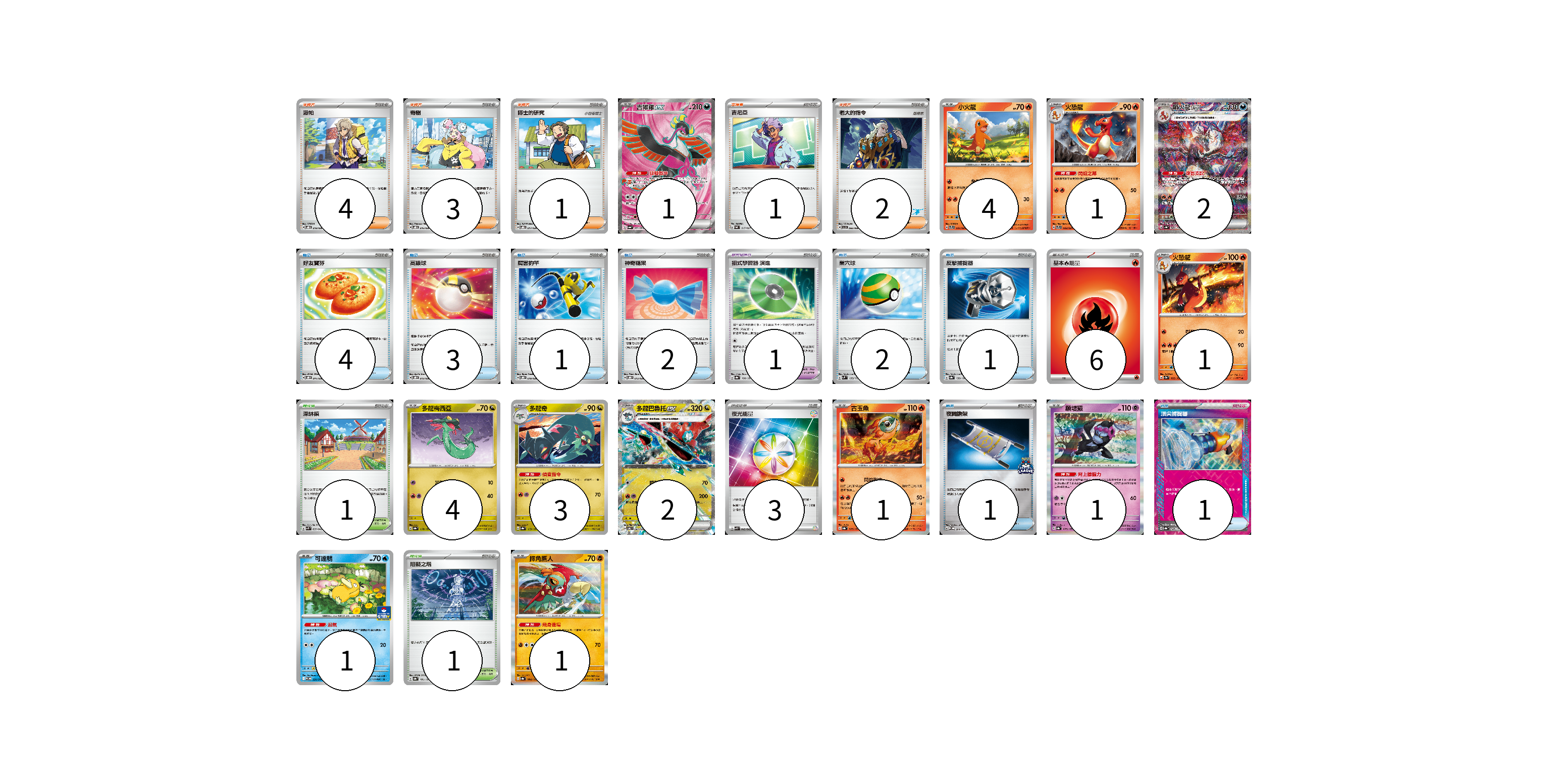 牌組構築方案 以此牌組為基礎新構築牌組 顯示卡面 顯示列表 寶可夢卡(22) 1 4 1 2 1 4 3 2 1 1 1 1 寶可夢道具(1) 1 物品卡(15) 4 3 1 2 2 1 1 1 支援者卡(11) 4 3 1 1 2 競技場卡(2) 1 1 能量卡(9) 6 3 寶可夢卡(22) 卡牌名稱 張數 卡牌名稱 張數 吉雉雞ex SV6a 081/064 01 小火龍 SVTL 001/021 04 火恐龍 SVTL 002/021 01 噴火龍ex SV4a 349/190 02 火恐龍 SV2a 005/165 01 多龍梅西亞 SV8a 118/187 04 多龍奇 SV8a 119/187 03 多龍巴魯托ex SV6 081/101 02 古玉魚 SV8a 025/187 01 願增猿 SV8a 075/187 01 可達鴨 SV-P 220/SV-P 01 摔角鷹人 SV8a 084/187 01 寶可夢道具(1) 卡牌名稱 張數 卡牌名稱 張數 招式學習器 演進 SV8a 160/187 01 物品卡(15) 卡牌名稱 張數 卡牌名稱 張數 好友寶芬 SVOD 011/020 04 高級球 SVOD 012/020 03 厲害釣竿 SVOD 010/020 01 神奇糖果 SVOD 013/020 02 巢穴球 SVM 133/175 02 反擊捕捉器 SV8a 139/187 01 夜間擔架 SV-P 204/SV-P 01 頂尖捕捉器 SV8a 148/187 01 支援者卡(11) 卡牌名稱 張數 卡牌名稱 張數 派帕 SVOD 018/020 04 奇樹 SVOD 016/020 03 博士的研究 SVOD 017/020 01 吉尼亞 SVAL 017/021 01 老大的指令 SVI 066/066 02 競技場卡(2) 卡牌名稱 張數 卡牌名稱 張數 深缽鎮 SVK 039/042 01 阻礙之塔 SV8a 181/187 01 能量卡(9) 卡牌名稱 張數 卡牌名稱 張數 基本火能量 sv-p FIR 06 夜光能量 SVK 042/042 03 以此牌組為基礎新構築牌組 牌組編碼 cDNOej-oZFsAC-dvEwmr copy 列印牌組單 牌組編碼已複製 分享至SNS
