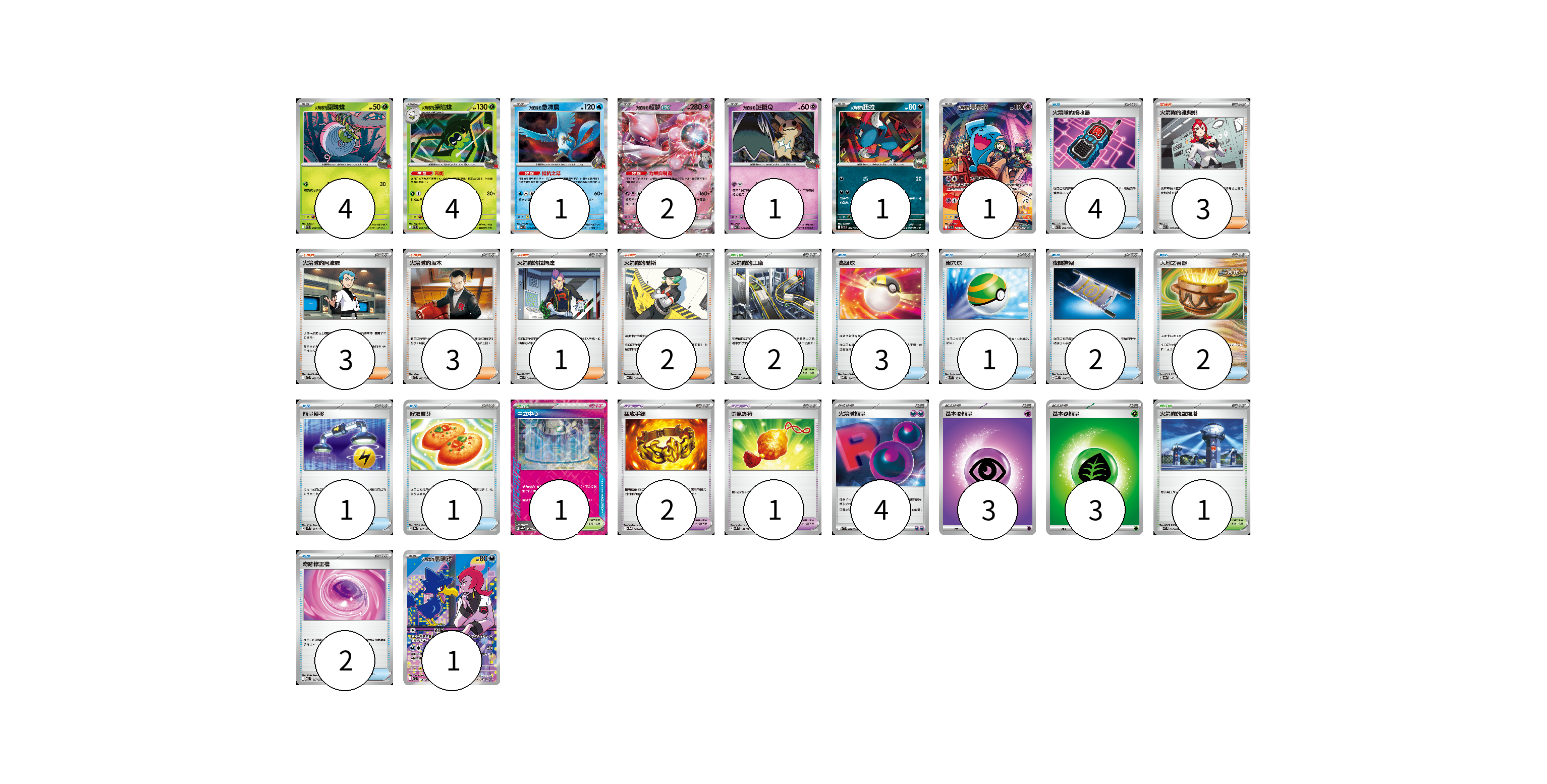 牌組構築方案 以此牌組為基礎新構築牌組 顯示卡面 顯示列表 寶可夢卡(15) 4 4 1 2 1 1 1 1 寶可夢道具(3) 2 1 物品卡(16) 4 3 1 2 2 1 1 2 支援者卡(12) 3 3 3 1 2 競技場卡(4) 2 1 1 能量卡(10) 4 3 3 寶可夢卡(15) 卡牌名稱 張數 卡牌名稱 張數 <火箭隊的>團珠蛛 SV10 008/098 04 <火箭隊的>操陷蛛 SV10 009/098 04 <火箭隊的>急凍鳥 SV10 022/098 01 <火箭隊的>超夢ex SV10 039/098 02 <火箭隊的>謎擬Q SV10 042/098 01 <火箭隊的>狃拉 SV10 072/098 01 <火箭隊的>果然翁 SV10 103/098 01 <火箭隊的>黑暗鴉 SV10 106/098 01 寶可夢道具(3) 卡牌名稱 張數 卡牌名稱 張數 猛攻手鐲 SV11W 082/086 02 勇氣護符 SVM 142/175 01 物品卡(16) 卡牌名稱 張數 卡牌名稱 張數 火箭隊的接收器 SV10 090/098 04 高級球 MBD 014/022 03 巢穴球 SVM 133/175 01 夜間擔架 MBD 016/022 02 大地之容器 SV8a 143/187 02 能量轉移 SVM 127/175 01 好友寶芬 SV8a 147/187 01 奇跡修正檔 MBD 017/022 02 支援者卡(12) 卡牌名稱 張數 卡牌名稱 張數 火箭隊的雅典娜 SV10 091/098 03 火箭隊的阿波羅 SV10 092/098 03 火箭隊的坂木 SV10 093/098 03 火箭隊的拉姆達 SV10 094/098 01 火箭隊的蘭斯 SV10 095/098 02 競技場卡(4) 卡牌名稱 張數 卡牌名稱 張數 火箭隊的工廠 SV10 097/098 02 中立中心 SV8a 184/187 01 火箭隊的監視塔 SV10 096/098 01 能量卡(10) 卡牌名稱 張數 卡牌名稱 張數 火箭隊能量 SV10 098/098 04 基本【超】能量 M-P PSY 03 基本【草】能量 M-P GRA 03 以此牌組為基礎新構築牌組 牌組編碼 cFWEzY-XacNwp-jjnjhI copy 列印牌組單 牌組編碼已複製 分享至SNS