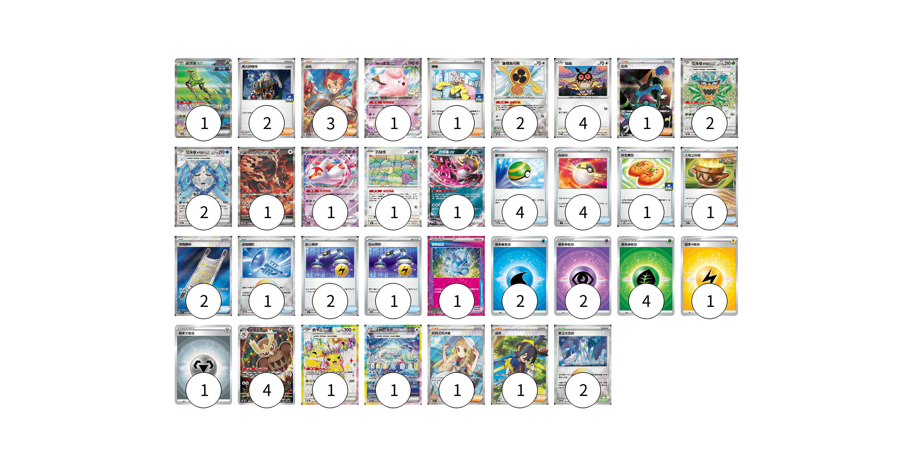 牌組構築方案 以此牌組為基礎新構築牌組 顯示卡面 顯示列表 寶可夢卡(22) 1 1 2 4 2 2 1 1 1 1 4 1 1 寶可夢道具(1) 1 物品卡(16) 4 4 1 1 2 1 2 1 支援者卡(9) 2 3 1 1 1 1 競技場卡(2) 2 能量卡(10) 2 2 4 1 1 寶可夢卡(22) 卡牌名稱 張數 卡牌名稱 張數 鐵斑葉ex SV5M 093/071 01 莉莉艾的皮皮ex SV9 033/100 01 旋轉洛托姆 SV8a 131/187 02 咕咕 SV7 076/102 04 厄鬼椪 碧草面具ex SV6 114/101 02 厄鬼椪 水井面具ex SV6 117/101 02 月月熊 赫月ex SV8a 225/187 01 拉帝亞斯ex SV7a 019/064 01 百變怪 SV4a 144/190 01 吉雉雞ex SV6a 038/064 01 貓頭夜鷹 SV7 114/102 04 皮卡丘ex SV8 122/106 01 太樂巴戈斯ex SV7 130/102 01 寶可夢道具(1) 卡牌名稱 張數 卡牌名稱 張數 璀璨結晶 SV7 094/102 01 物品卡(16) 卡牌名稱 張數 卡牌名稱 張數 巢穴球 SVTG 012/019 04 高級球 SV1V 070/078 04 好友寶芬 SV-P 212/SV-P 01 大地之容器 SVK 012/042 01 夜間擔架 M1L 083/063 02 玻璃喇叭 SV8a 140/187 01 能量轉移 SVK 008/042 02 能量轉移 SVC 011/021 01 支援者卡(9) 卡牌名稱 張數 卡牌名稱 張數 老大的指令 SV-P 178/SV-P 02 赤松 SV7 123/102 03 奇樹 SV-P 106/SV-P 01 牡丹 SV4a 354/190 01 莉莉艾的決意 M1L 086/063 01 烏栗 SV6 122/101 01 競技場卡(2) 卡牌名稱 張數 卡牌名稱 張數 零之大空洞 SV8a 182/187 02 能量卡(10) 卡牌名稱 張數 卡牌名稱 張數 基本【水】能量 SI WAT 02 基本【超】能量 SI PSY 02 基本【草】能量 SI GRA 04 基本【雷】能量 SI LIG 01 基本【鋼】能量 SI MET 01 以此牌組為基礎新構築牌組 牌組編碼 cGJAtw-jYGkYd-OuolVs copy 列印牌組單 牌組編碼已複製 分享至SNS
