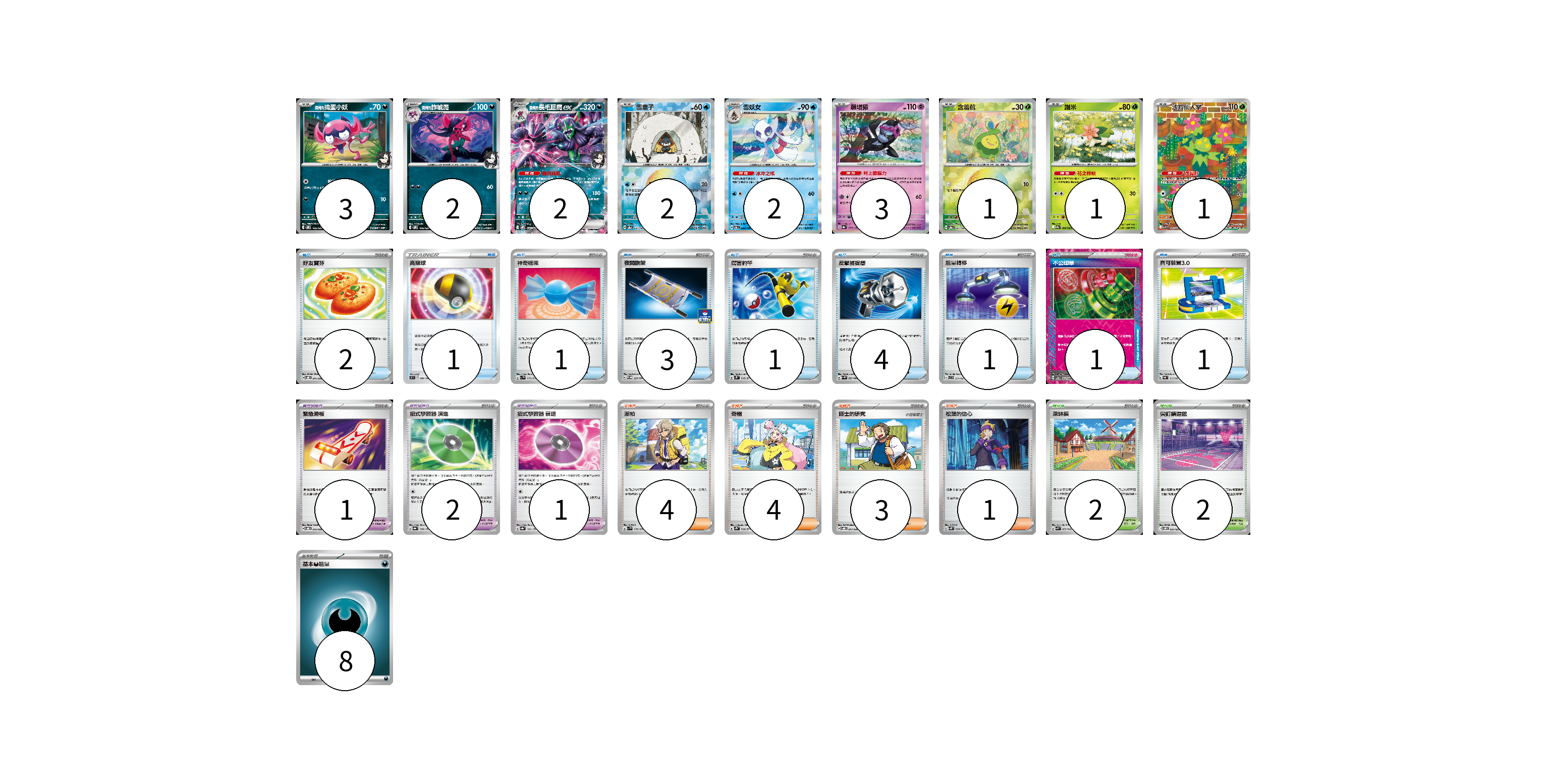 牌組構築方案 以此牌組為基礎新構築牌組 顯示卡面 顯示列表 寶可夢卡(17) 3 2 2 2 2 3 1 1 1 寶可夢道具(4) 1 2 1 物品卡(15) 2 1 1 3 1 4 1 1 1 支援者卡(12) 4 4 3 1 競技場卡(4) 2 2 能量卡(8) 8 寶可夢卡(17) 卡牌名稱 張數 卡牌名稱 張數 <瑪俐的>搗蛋小妖 SVOM 005/021 03 <瑪俐的>詐唬魔 SVOM 006/021 02 <瑪俐的>長毛巨魔ex SVOM 007/021 02 雪童子 SV8a 037/187 02 雪妖女 SV6 033/101 02 願增猿 SV8a 075/187 03 含羞苞 SV8a 001/187 01 謝米 SV9a 006/063 01 沙鈴仙人掌 SV9 101/100 01 寶可夢道具(4) 卡牌名稱 張數 卡牌名稱 張數 緊急滑板 SVOD 015/020 01 招式學習器 演進 SV8a 160/187 02 招式學習器 衰退 SV8a 161/187 01 物品卡(15) 卡牌名稱 張數 卡牌名稱 張數 好友寶芬 SVOD 011/020 02 高級球 S9 089/100 01 神奇糖果 SV1V 072/078 01 夜間擔架 SV-P 227/SV-P 03 厲害釣竿 SV2P 066/071 01 反擊捕捉器 SV4M 059/066 04 能量轉移 SVC 011/021 01 不公印章 SV5a 053/066 01 寶可裝置3.0 SVAL 015/021 01 支援者卡(12) 卡牌名稱 張數 卡牌名稱 張數 派帕 SV1V 076/078 04 奇樹 SV2D 069/071 04 博士的研究 SVOD 017/020 03 松葉的信心 SV5K 069/071 01 競技場卡(4) 卡牌名稱 張數 卡牌名稱 張數 深缽鎮 SVK 039/042 02 尖釘鎮道館 SVOM 021/021 02 能量卡(8) 卡牌名稱 張數 卡牌名稱 張數 基本【惡】能量 SVF DAR 08 以此牌組為基礎新構築牌組 牌組編碼 cHppWi-qwTYhA-bCdFEZ copy 列印牌組單 牌組編碼已複製 分享至SNS