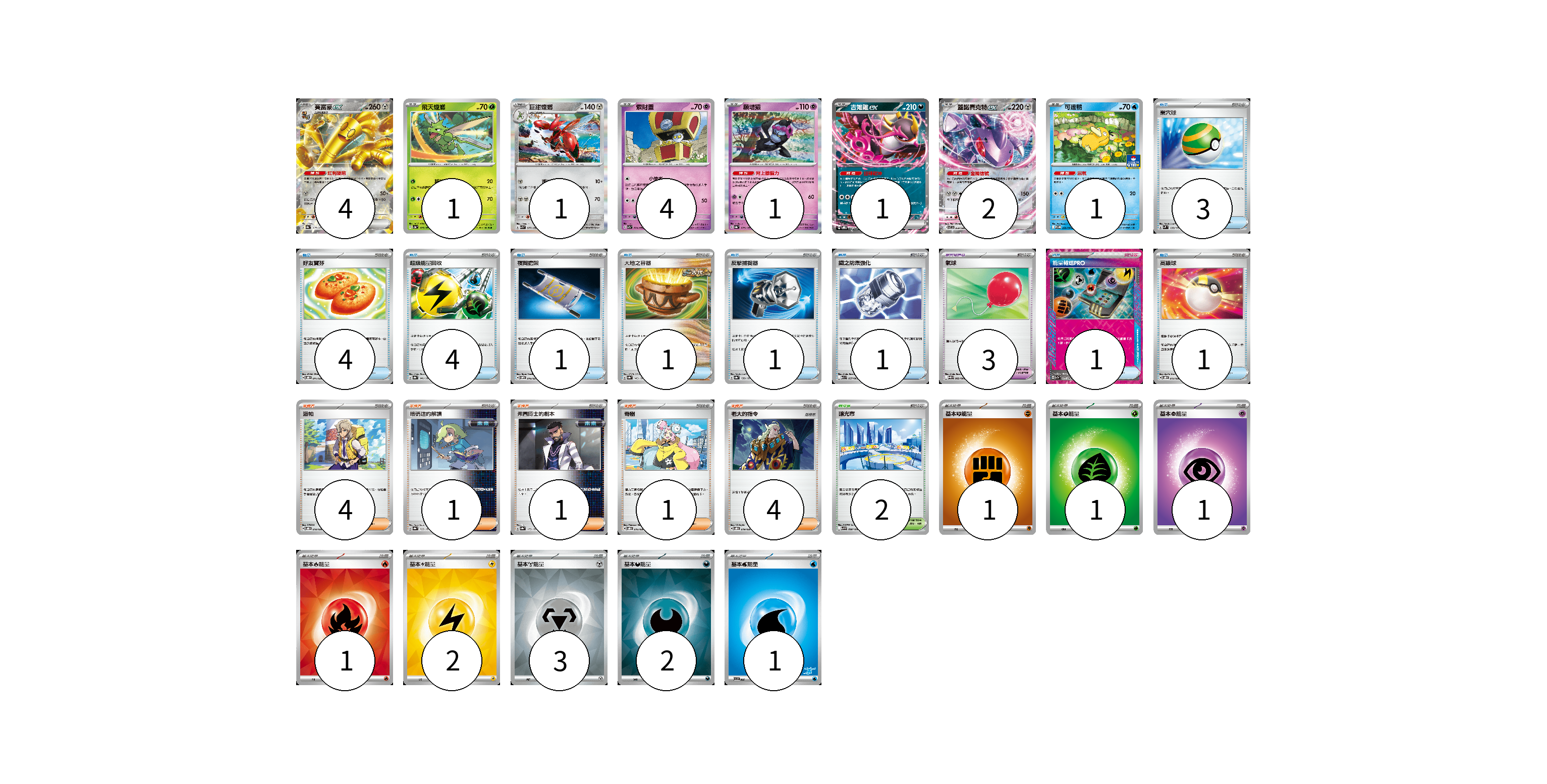 牌組構築方案 以此牌組為基礎新構築牌組 顯示卡面 顯示列表 寶可夢卡(15) 4 1 1 4 1 1 2 1 寶可夢道具(3) 3 物品卡(17) 3 4 4 1 1 1 1 1 1 支援者卡(11) 4 1 1 1 4 競技場卡(2) 2 能量卡(12) 1 1 1 1 2 3 2 1 寶可夢卡(15) 卡牌名稱 張數 卡牌名稱 張數 賽富豪ex SV8a 117/187 04 飛天螳螂 SV2a 123/165 01 巨鉗螳螂 SV3 077/108 01 索財靈 SV7a 024/064 04 願增猿 SV8a 075/187 01 吉雉雞ex SVOD 004/020 01 蓋諾賽克特ex SV11B 069/086 02 可達鴨 SV-P 220/SV-P 01 寶可夢道具(3) 卡牌名稱 張數 卡牌名稱 張數 氣球 SV11B 082/086 03 物品卡(17) 卡牌名稱 張數 卡牌名稱 張數 巢穴球 SVM 133/175 03 好友寶芬 SVOD 011/020 04 超級能量回收 SV8a 141/187 04 夜間擔架 SVOM 016/021 01 大地之容器 SV8a 143/187 01 反擊捕捉器 SV8a 139/187 01 鐵之防禦強化 M1L 057/063 01 能量輸送PRO SV7a 052/064 01 高級球 SVOD 012/020 01 支援者卡(11) 卡牌名稱 張數 卡牌名稱 張數 派帕 SVOD 018/020 04 暗碼迷的解讀 SV8a 165/187 01 弗圖博士的劇本 SV8a 175/187 01 奇樹 SVOD 016/020 01 老大的指令 SVOD 019/020 04 競技場卡(2) 卡牌名稱 張數 卡牌名稱 張數 釀光市 SV9 098/100 02 能量卡(12) 卡牌名稱 張數 卡牌名稱 張數 基本【鬥】能量 M-P FIG 01 基本【草】能量 M-P GRA 01 基本【超】能量 M-P PSY 01 基本【火】能量 SVQL FIR 01 基本【雷】能量 SVQP LIG 02 基本【鋼】能量 SVOD MET 03 基本【惡】能量 SVOM DAR 02 基本【水】能量 SVI WAT 01 以此牌組為基礎新構築牌組 牌組編碼 cIOiZQ-qGVhJR-GVgKKa copy 列印牌組單 牌組編碼已複製 分享至SNS