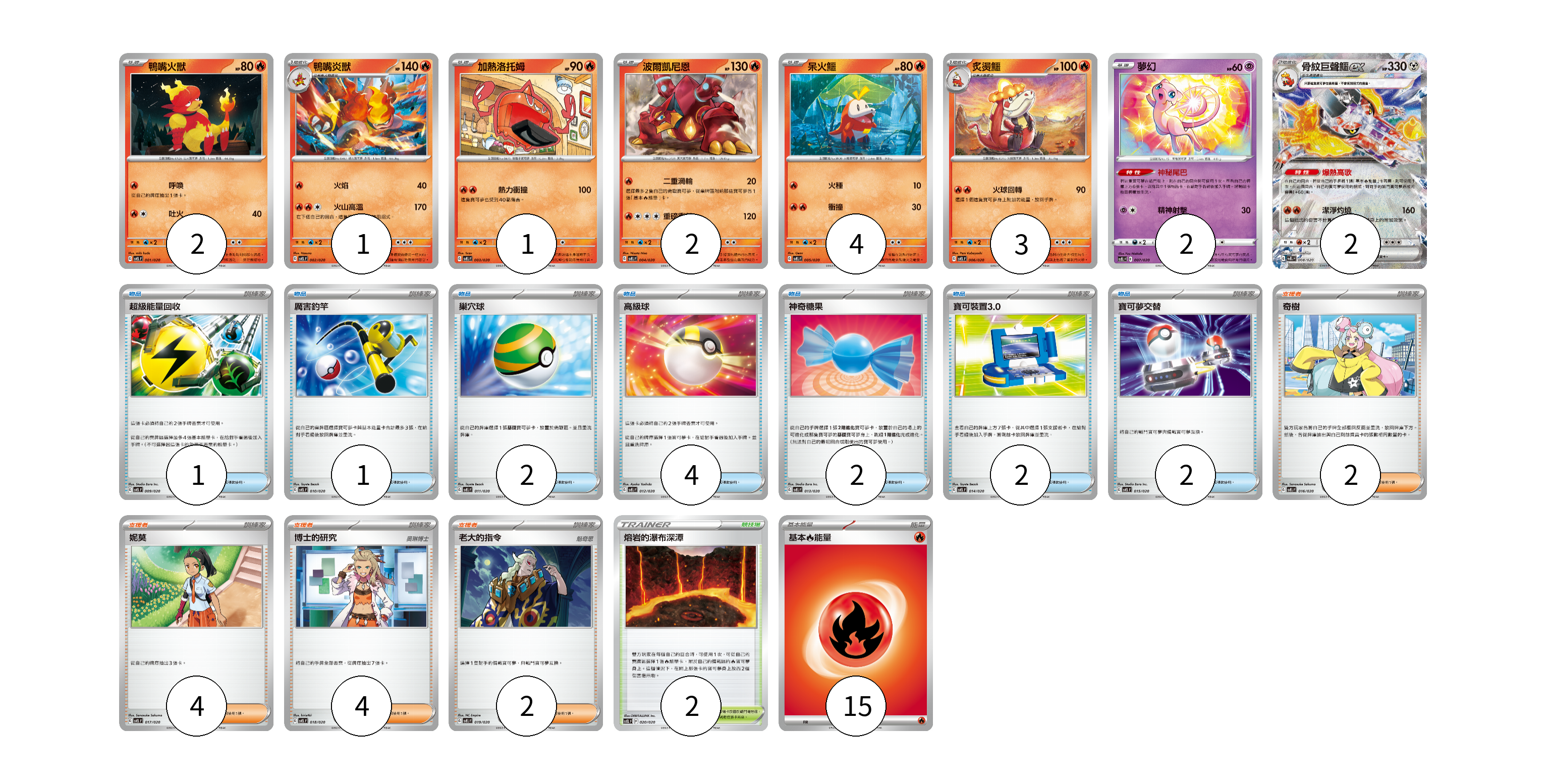 牌組構築方案 以此牌組為基礎新構築牌組 顯示卡面 顯示列表 寶可夢卡(18) 2 1 1 2 4 3 2 2 1 物品卡(13) 1 2 4 2 2 2 支援者卡(12) 2 4 4 2 競技場卡(2) 2 能量卡(15) 15 寶可夢卡(18) 卡牌名稱 張數 卡牌名稱 張數 鴨嘴火獸 SVEL 001/020 02 鴨嘴炎獸 SVEL 002/020 01 加熱洛托姆 SVEL 003/020 01 波爾凱尼恩 SVEL 004/020 02 呆火鱷 SVEL 005/020 04 炙燙鱷 SVEL 006/020 03 夢幻 SVEL 007/020 02 骨紋巨聲鱷ex SVEL 008/020 02 厲害釣竿 SVEL 010/020 01 物品卡(13) 卡牌名稱 張數 卡牌名稱 張數 超級能量回收 SVEL 009/020 01 巢穴球 SVEL 011/020 02 高級球 SVEL 012/020 04 神奇糖果 SVEL 013/020 02 寶可裝置3.0 SVEL 014/020 02 寶可夢交替 SVEL 015/020 02 支援者卡(12) 卡牌名稱 張數 卡牌名稱 張數 奇樹 SVEL 016/020 02 妮莫 SVEL 017/020 04 博士的研究 SVEL 018/020 04 老大的指令 SVEL 019/020 02 競技場卡(2) 卡牌名稱 張數 卡牌名稱 張數 熔岩的瀑布深潭 SVEL 020/020 02 能量卡(15) 卡牌名稱 張數 卡牌名稱 張數 基本【火】能量 SVEL FIR 15 以此牌組為基礎新構築牌組 牌組編碼 cKpYnL-FDEomM-uvFXEq copy 列印牌組單 牌組編碼已複製 分享至SNS