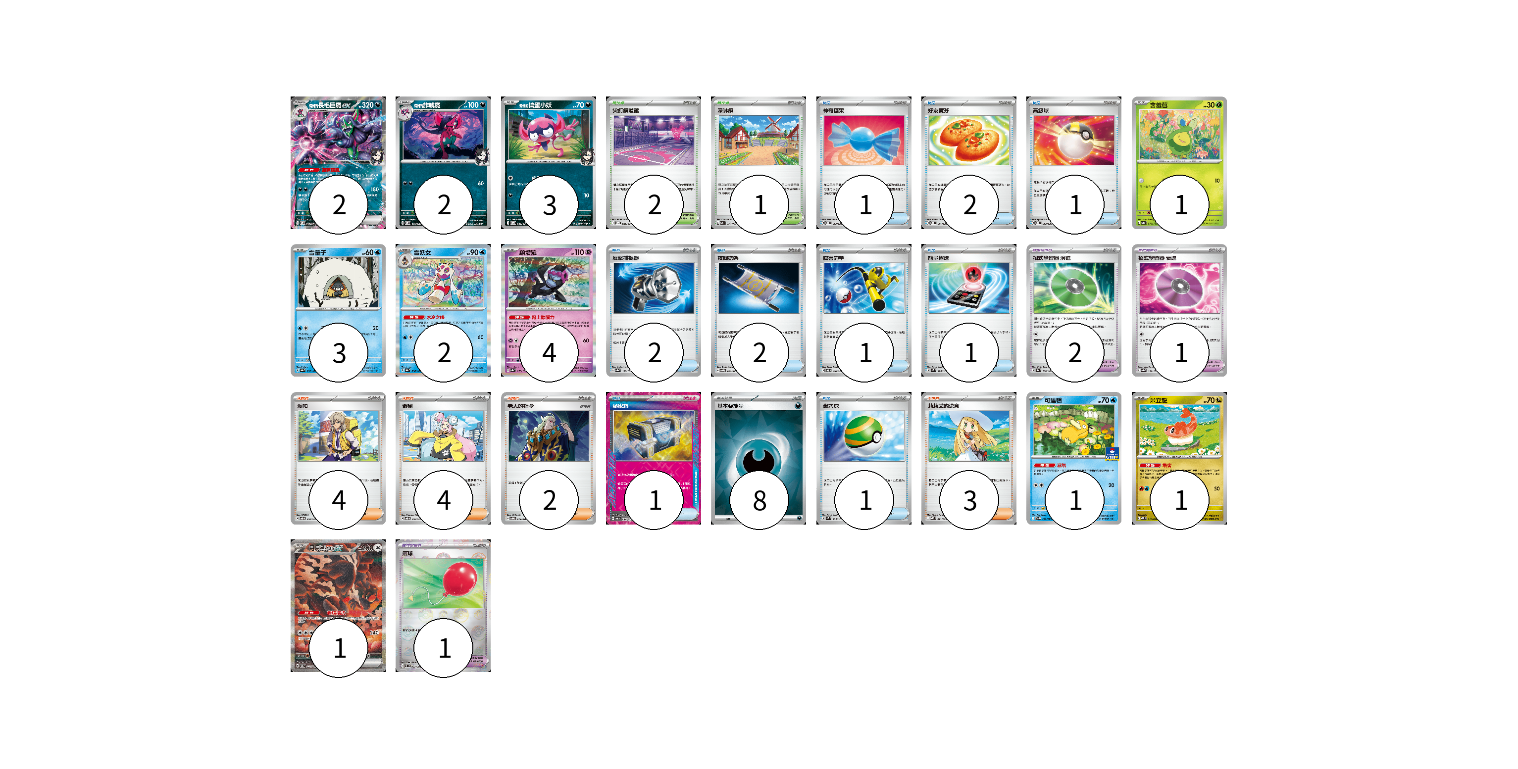 牌組構築方案 以此牌組為基礎新構築牌組 顯示卡面 顯示列表 寶可夢卡(20) 2 2 3 1 3 2 4 1 1 1 寶可夢道具(4) 2 1 1 物品卡(12) 1 2 1 2 2 1 1 1 1 支援者卡(13) 4 4 2 3 競技場卡(3) 2 1 能量卡(8) 8 寶可夢卡(20) 卡牌名稱 張數 卡牌名稱 張數 <瑪俐的>長毛巨魔ex SVOM 007/021 02 <瑪俐的>詐唬魔 SVOM 006/021 02 <瑪俐的>搗蛋小妖 SVOM 005/021 03 含羞苞 SV8a 001/187 01 雪童子 SV8a 037/187 03 雪妖女 SV8a 038/187 02 願增猿 SV8a 075/187 04 可達鴨 SV-P 220/SV-P 01 米立龍 MBD 010/022 01 月月熊 赫月ex SV8a 225/187 01 寶可夢道具(4) 卡牌名稱 張數 卡牌名稱 張數 招式學習器 演進 SV8a 160/187 02 招式學習器 衰退 SV8a 161/187 01 氣球 SV11B 082/086 01 物品卡(12) 卡牌名稱 張數 卡牌名稱 張數 神奇糖果 SVOD 013/020 01 好友寶芬 SVOD 011/020 02 高級球 SVOD 012/020 01 反擊捕捉器 SV8a 139/187 02 夜間擔架 SVOM 016/021 02 厲害釣竿 SVOD 010/020 01 能量輸送 SVM 128/175 01 秘密箱 SV6 092/101 01 巢穴球 SVM 133/175 01 支援者卡(13) 卡牌名稱 張數 卡牌名稱 張數 派帕 SVOD 018/020 04 奇樹 SVOD 016/020 04 老大的指令 SVOD 019/020 02 莉莉艾的決意 MBD 021/022 03 競技場卡(3) 卡牌名稱 張數 卡牌名稱 張數 尖釘鎮道館 SVOM 021/021 02 深缽鎮 SVK 039/042 01 能量卡(8) 卡牌名稱 張數 卡牌名稱 張數 基本【惡】能量 SVOM DAR 08 以此牌組為基礎新構築牌組 牌組編碼 cNIAgF-MLhEwd-ZBVfkn copy 列印牌組單 牌組編碼已複製 分享至SNS