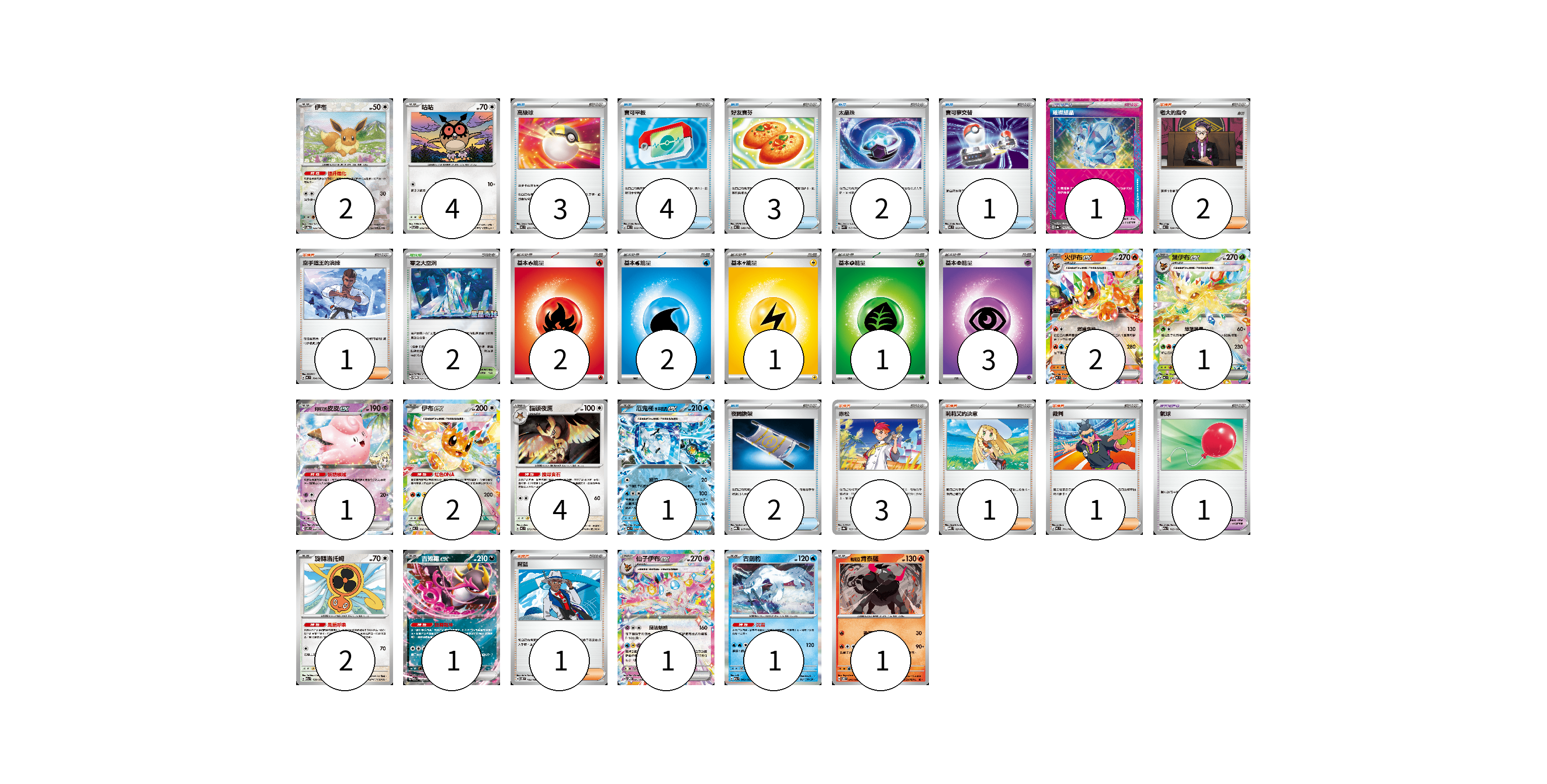牌組構築方案 以此牌組為基礎新構築牌組 顯示卡面 顯示列表 寶可夢卡(23) 2 4 2 1 1 2 4 1 2 1 1 1 1 寶可夢道具(2) 1 1 物品卡(15) 3 4 3 2 1 2 支援者卡(9) 2 1 3 1 1 1 競技場卡(2) 2 能量卡(9) 2 2 1 1 3 寶可夢卡(23) 卡牌名稱 張數 卡牌名稱 張數 伊布 SV8a 125/187 02 咕咕 SV7 076/102 04 火伊布ex MC 094/742 02 葉伊布ex MC 038/742 01 莉莉艾的皮皮ex SV9 033/100 01 伊布ex MC 566/742 02 貓頭夜鷹 MC 573/742 04 厄鬼椪 水井面具ex MC 224/742 01 旋轉洛托姆 M2a 139/193 02 吉雉雞ex M2a 114/193 01 仙子伊布ex SVPN 005/008 01 古劍豹 M2a 043/193 01 帕底亞 肯泰羅 SV8 011/106 01 寶可夢道具(2) 卡牌名稱 張數 卡牌名稱 張數 璀璨結晶 SV8a 152/187 01 氣球 M2a 165/193 01 物品卡(15) 卡牌名稱 張數 卡牌名稱 張數 高級球 MC 651/742 03 寶可平板 MC 662/742 04 好友寶芬 MC 648/742 03 太晶珠 SVK 013/042 02 寶可夢交替 MC 663/742 01 夜間擔架 MBG 017/022 02 支援者卡(9) 卡牌名稱 張數 卡牌名稱 張數 老大的指令 MC 724/742 02 空手道王的演練 MC 704/742 01 赤松 SV8a 163/187 03 莉莉艾的決意 MBD 021/022 01 裁判 MC 711/742 01 席藍 SV8 102/106 01 競技場卡(2) 卡牌名稱 張數 卡牌名稱 張數 零之大空洞 SV-P 151/SV-P 02 能量卡(9) 卡牌名稱 張數 卡牌名稱 張數 基本【火】能量 MC FIR 02 基本【水】能量 MC WAT 02 基本【雷】能量 MC LIG 01 基本【草】能量 MC GRA 01 基本【超】能量 MC PSY 03 以此牌組為基礎新構築牌組 牌組編碼 cPxAKE-xdSDtm-ukuBhW copy 列印牌組單 牌組編碼已複製 分享至SNS