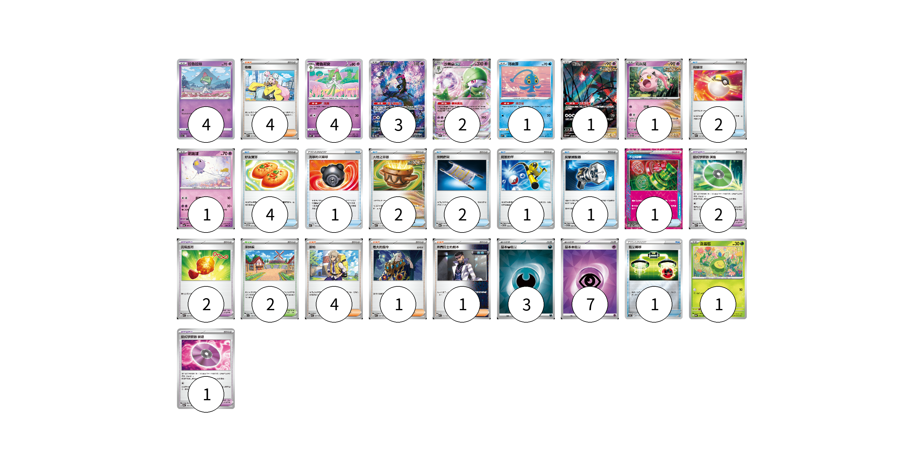 牌組構築方案 以此牌組為基礎新構築牌組 顯示卡面 顯示列表 寶可夢卡(18) 4 4 3 2 1 1 1 1 1 寶可夢道具(5) 2 2 1 物品卡(15) 2 4 1 2 2 1 1 1 1 支援者卡(10) 4 4 1 1 競技場卡(2) 2 能量卡(10) 3 7 寶可夢卡(18) 卡牌名稱 張數 卡牌名稱 張數 拉魯拉絲 S9a 032/067 04 奇魯莉安 SVTS 003/022 04 願增猿 SV6 107/101 03 沙奈朵ex SV4a 082/190 02 瑪納霏 SVF 003/038 01 振翼髮 SV5K 076/071 01 吼叫尾 SVTS 007/022 01 飄飄球 SV4a 083/190 01 含羞苞 SV8a 001/187 01 寶可夢道具(5) 卡牌名稱 張數 卡牌名稱 張數 招式學習器 演進 SVK 025/042 02 勇氣護符 SVK 024/042 02 招式學習器 衰退 SV8a 161/187 01 物品卡(15) 卡牌名稱 張數 卡牌名稱 張數 高級球 SVK 018/042 02 好友寶芬 SVTM 011/022 04 洗翠的沉重球 SVF 019/038 01 大地之容器 SVK 012/042 02 夜間擔架 SV6a 056/064 02 厲害釣竿 SVTH 008/018 01 反擊捕捉器 SVTS 009/022 01 不公印章 SV5a 053/066 01 能量轉移 SO 017/030 01 支援者卡(10) 卡牌名稱 張數 卡牌名稱 張數 奇樹 SVK 031/042 04 派帕 SVK 035/042 04 老大的指令 SVK 036/042 01 弗圖博士的劇本 SVK 034/042 01 競技場卡(2) 卡牌名稱 張數 卡牌名稱 張數 深缽鎮 SV1a 070/073 02 能量卡(10) 卡牌名稱 張數 卡牌名稱 張數 基本【惡】能量 SVK DAR 03 基本【超】能量 SVK PSY 07 以此牌組為基礎新構築牌組 牌組編碼 cRKGOD-PasXQZ-dLPxLO copy 列印牌組單 牌組編碼已複製 分享至SNS