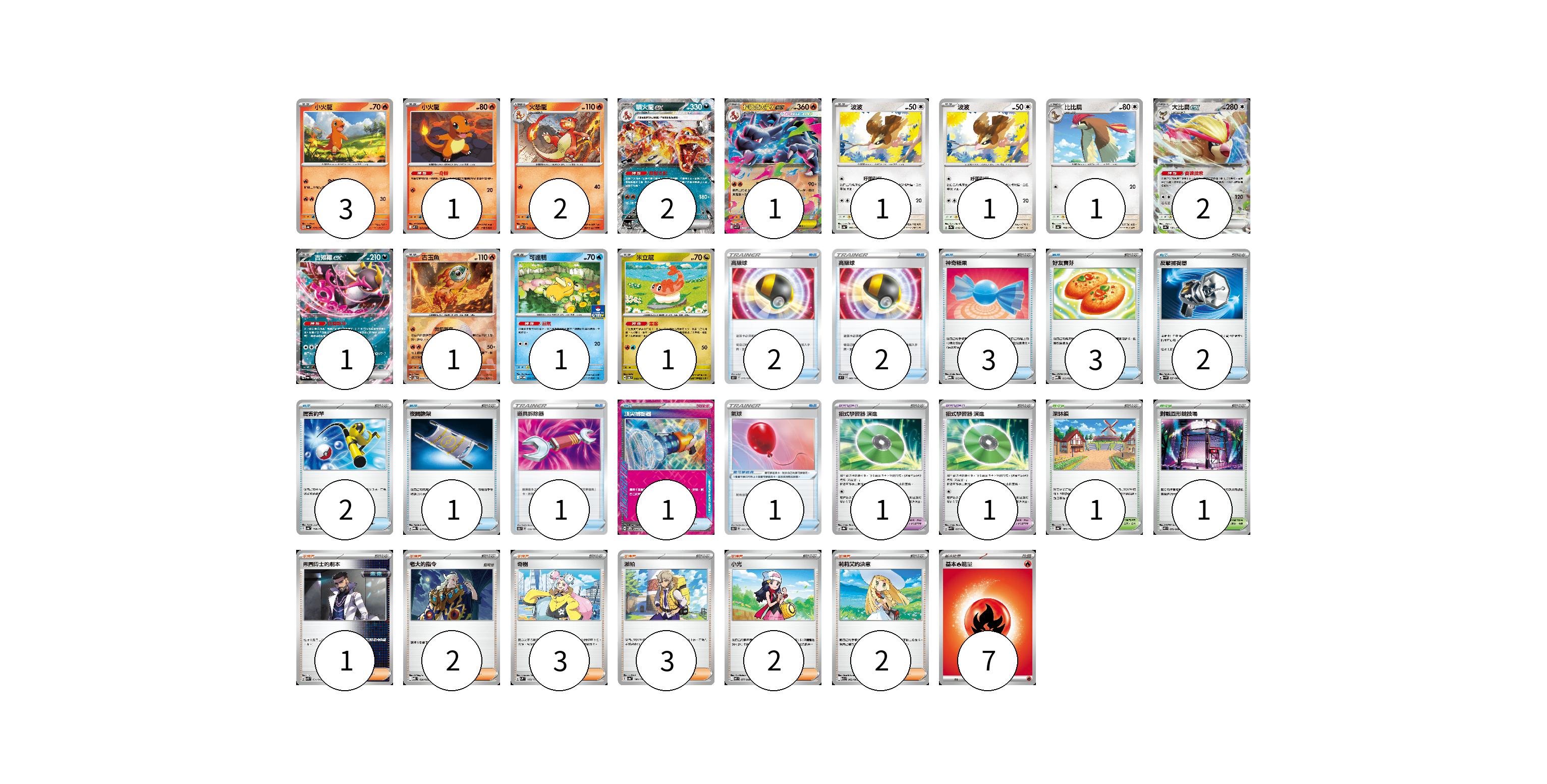 牌組構築方案 以此牌組為基礎新構築牌組 顯示卡面 顯示列表 寶可夢卡(18) 3 1 2 2 1 1 1 1 2 1 1 1 1 寶可夢道具(3) 1 1 1 物品卡(17) 2 2 3 3 2 2 1 1 1 支援者卡(13) 1 2 3 3 2 2 競技場卡(2) 1 1 能量卡(7) 7 寶可夢卡(18) 卡牌名稱 張數 卡牌名稱 張數 小火龍 SV4a 025/190 03 小火龍 M2 011/080 01 火恐龍 M2 012/080 02 噴火龍ex SV4a 115/190 02 超級噴火龍Xex M2 013/080 01 波波 SV4a 137/190 01 波波 SV2a 016/165 01 比比鳥 SV4a 138/190 01 大比鳥ex SV4a 139/190 02 吉雉雞ex SV6a 038/064 01 古玉魚 SV8a 025/187 01 可達鴨 SV-P 220/SV-P 01 米立龍 SV6 082/101 01 寶可夢道具(3) 卡牌名稱 張數 卡牌名稱 張數 氣球 S8b 145/184 01 招式學習器 演進 SV8a 160/187 01 招式學習器 演進 SVK 025/042 01 物品卡(17) 卡牌名稱 張數 卡牌名稱 張數 高級球 SK 015/030 02 高級球 S9 089/100 02 神奇糖果 MBG 013/022 03 好友寶芬 MBD 013/022 03 反擊捕捉器 SV4M 059/066 02 厲害釣竿 SV4a 158/190 02 夜間擔架 MBG 017/022 01 道具拆除器 S8b 138/184 01 頂尖捕捉器 SV5M 062/071 01 支援者卡(13) 卡牌名稱 張數 卡牌名稱 張數 弗圖博士的劇本 SVK 034/042 01 老大的指令 MBD 020/022 02 奇樹 SVM 160/175 03 派帕 SV4a 180/190 03 小光 M2 077/080 02 莉莉艾的決意 M1L 062/063 02 競技場卡(2) 卡牌名稱 張數 卡牌名稱 張數 深缽鎮 SV4a 185/190 01 對戰圓形競技場 M2 079/080 01 能量卡(7) 卡牌名稱 張數 卡牌名稱 張數 基本【火】能量 M-P FIR 07 以此牌組為基礎新構築牌組 牌組編碼 cSHcmM-cUOQjV-MFXGJu copy 列印牌組單 牌組編碼已複製 分享至SNS
