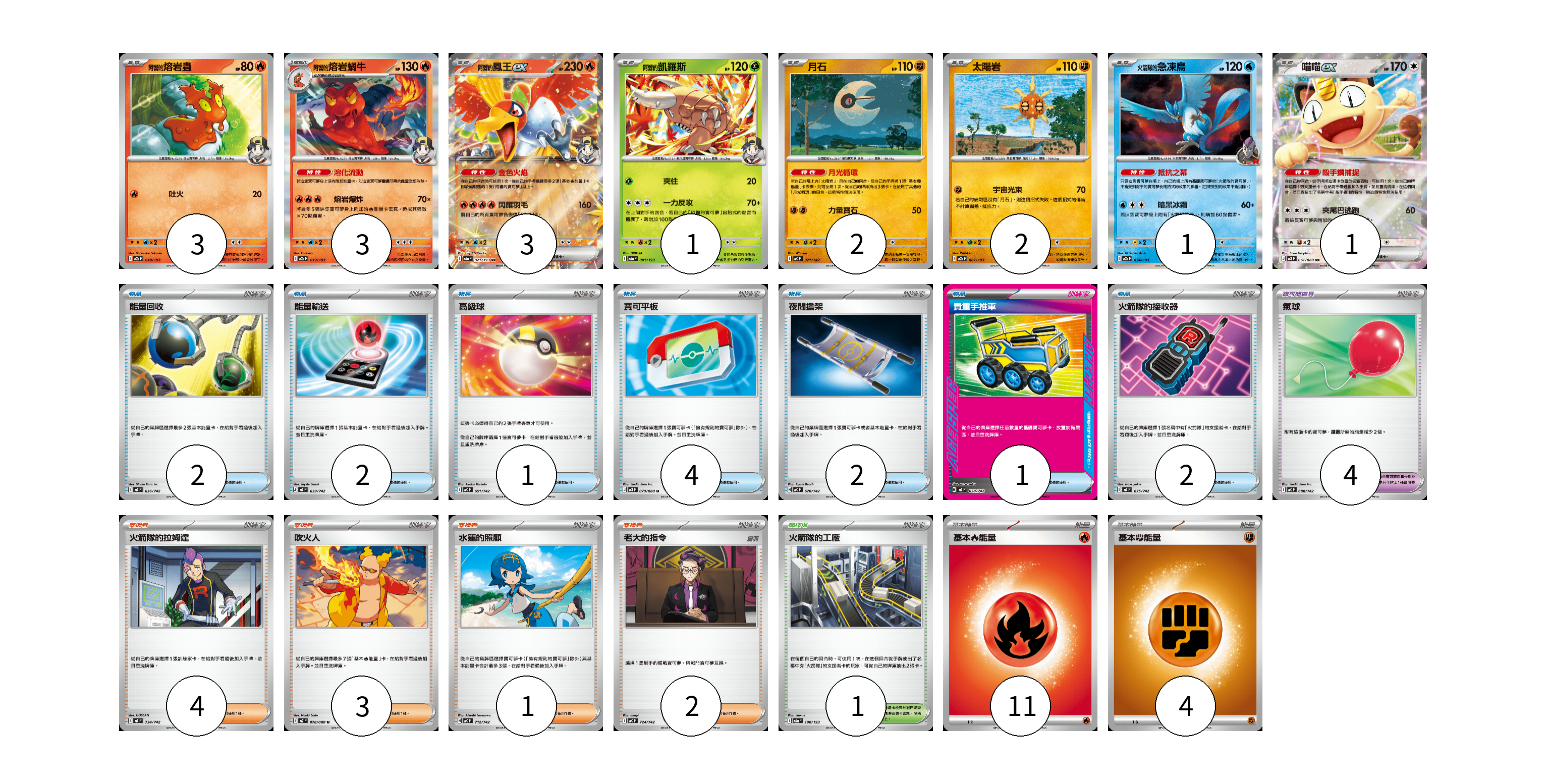 牌組構築方案 以此牌組為基礎新構築牌組 顯示卡面 顯示列表 寶可夢卡(16) 3 3 3 1 2 2 1 1 寶可夢道具(4) 4 物品卡(14) 2 2 1 4 2 1 2 支援者卡(10) 4 3 1 2 競技場卡(1) 1 能量卡(15) 11 4 寶可夢卡(16) 卡牌名稱 張數 卡牌名稱 張數 <阿響的>熔岩蟲 M2a 018/193 03 <阿響的>熔岩蝸牛 M2a 019/193 03 <阿響的>鳳王ex M2a 021/193 03 <阿響的>凱羅斯 M2a 001/193 01 月石 MC 371/742 02 太陽岩 M2a 087/193 02 <火箭隊的>急凍鳥 M2a 034/193 01 喵喵ex M3 061/080 01 寶可夢道具(4) 卡牌名稱 張數 卡牌名稱 張數 氣球 MC 688/742 04 物品卡(14) 卡牌名稱 張數 卡牌名稱 張數 能量回收 MC 636/742 02 能量輸送 MC 639/742 02 高級球 MC 651/742 01 寶可平板 M3 070/080 04 夜間擔架 MC 670/742 02 貴重手推車 MC 658/742 01 火箭隊的接收器 MC 675/742 02 支援者卡(10) 卡牌名稱 張數 卡牌名稱 張數 火箭隊的拉姆達 MC 734/742 04 吹火人 M2 078/080 03 水蓮的照顧 MC 712/742 01 老大的指令 MC 724/742 02 競技場卡(1) 卡牌名稱 張數 卡牌名稱 張數 火箭隊的工廠 M2a 190/193 01 能量卡(15) 卡牌名稱 張數 卡牌名稱 張數 基本【火】能量 MC FIR 11 基本【鬥】能量 MC FIG 04 以此牌組為基礎新構築牌組 牌組編碼 cURqBQ-QSflwJ-sYMjjt copy 列印牌組單 牌組編碼已複製 分享至SNS