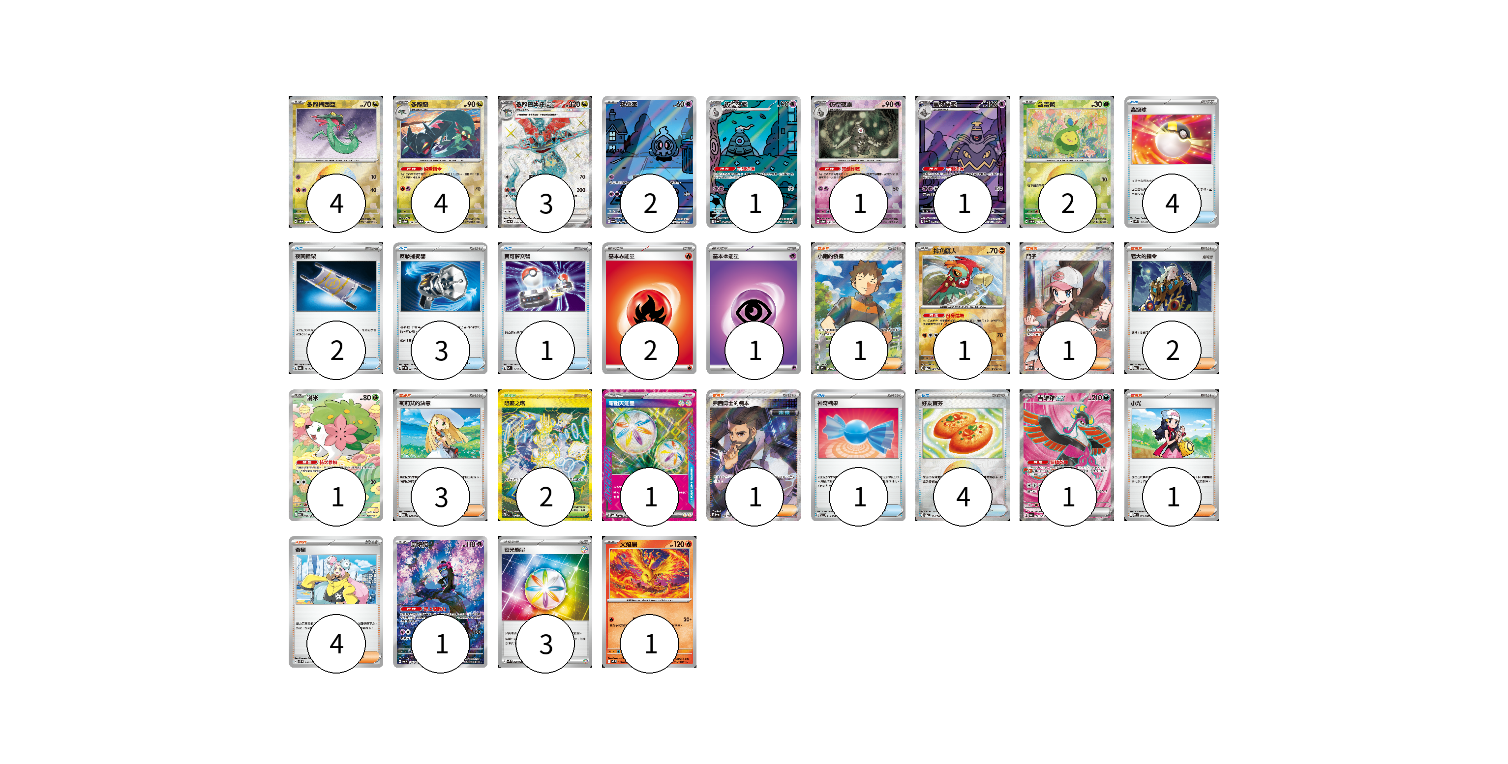 牌組構築方案 以此牌組為基礎新構築牌組 顯示卡面 顯示列表 寶可夢卡(23) 4 4 3 2 1 1 1 2 1 1 1 1 1 物品卡(15) 4 2 3 1 1 4 支援者卡(13) 1 1 2 3 1 1 4 競技場卡(2) 2 能量卡(7) 2 1 1 3 寶可夢卡(23) 卡牌名稱 張數 卡牌名稱 張數 多龍梅西亞 SV8a 118/187 04 多龍奇 SV8a 119/187 04 多龍巴魯托ex SV6 120/101 03 夜巡靈 SV6a 068/064 02 彷徨夜靈 SV6a 069/064 01 彷徨夜靈 SV8a 065/187 01 黑夜魔靈 SV6a 070/064 01 含羞苞 SV8a 001/187 02 摔角鷹人 SV8a 084/187 01 謝米 SV9a 066/063 01 吉雉雞ex SV6a 081/064 01 願增猿 SV6 107/101 01 火焰鳥 M2 014/080 01 物品卡(15) 卡牌名稱 張數 卡牌名稱 張數 高級球 SVAL 013/021 04 夜間擔架 SV8a 151/187 02 反擊捕捉器 SV4M 059/066 03 寶可夢交替 SVM 136/175 01 神奇糖果 SVEL 013/020 01 好友寶芬 SV8a 147/187 04 支援者卡(13) 卡牌名稱 張數 卡牌名稱 張數 小剛的發掘 SV9 123/100 01 鬥子 SV11W 166/086 01 老大的指令 MBD 020/022 02 莉莉艾的決意 MBD 021/022 03 弗圖博士的劇本 SV4M 086/066 01 小光 M2 077/080 01 奇樹 SVTS 018/022 04 競技場卡(2) 卡牌名稱 張數 卡牌名稱 張數 阻礙之塔 SV10 132/098 02 能量卡(7) 卡牌名稱 張數 卡牌名稱 張數 基本【火】能量 SVTL FIR 02 基本【超】能量 SVTS PSY 01 新衝天能量 SV5K 071/071 01 夜光能量 SVK 042/042 03 以此牌組為基礎新構築牌組 牌組編碼 cUVybU-QcWIsU-hfEVMw copy 列印牌組單 牌組編碼已複製 分享至SNS