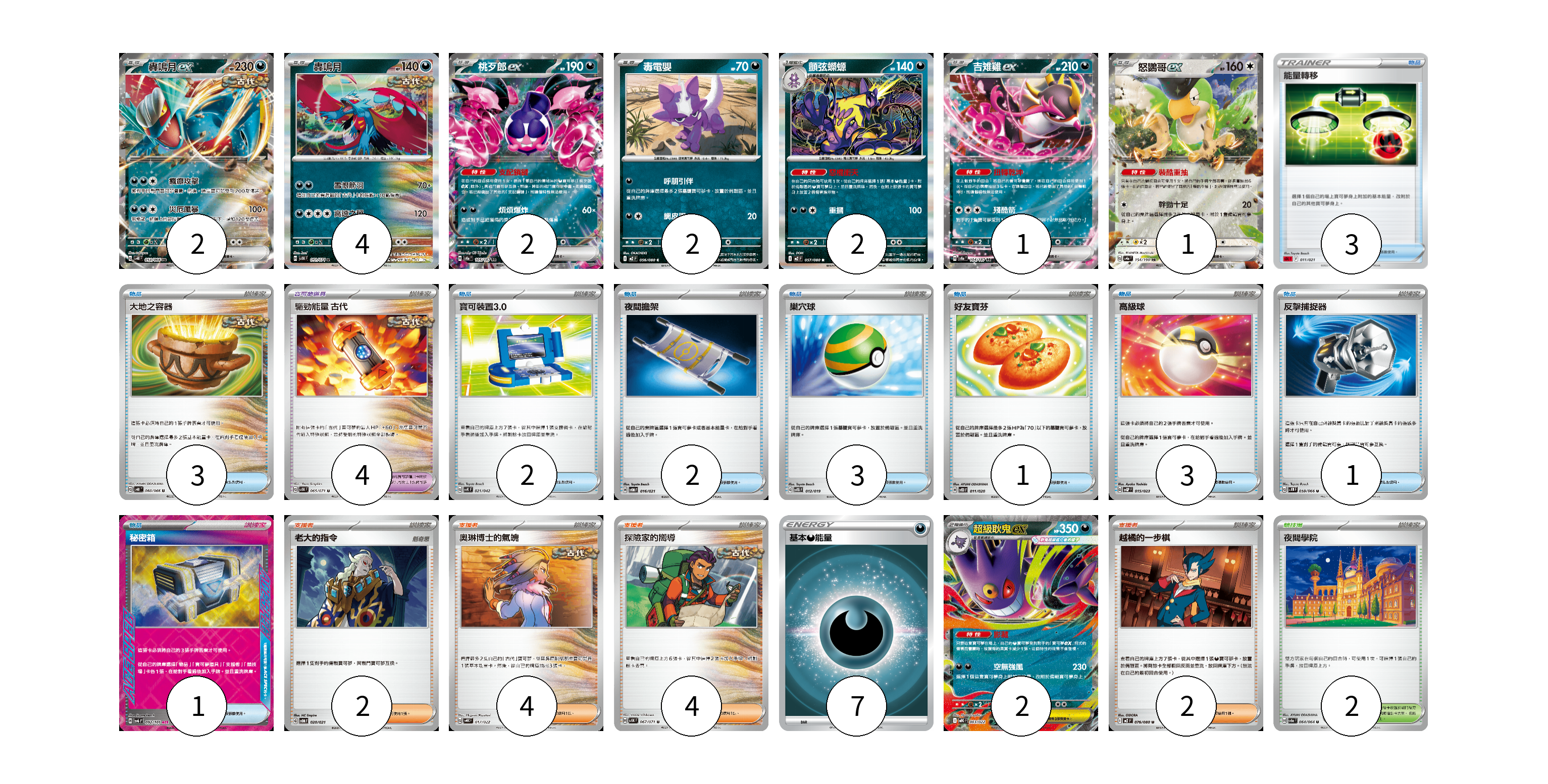 牌組構築方案 以此牌組為基礎新構築牌組 顯示卡面 顯示列表 寶可夢卡(16) 2 4 2 2 2 1 1 2 寶可夢道具(4) 4 物品卡(19) 3 3 2 2 3 1 3 1 1 支援者卡(12) 2 4 4 2 競技場卡(2) 2 能量卡(7) 7 寶可夢卡(16) 卡牌名稱 張數 卡牌名稱 張數 轟鳴月ex SV4K 054/066 02 轟鳴月 SV5K 051/071 04 桃歹郎ex SV8a 105/187 02 毒電嬰 M2 056/080 02 顫弦蠑螈 M2 057/080 02 吉雉雞ex SV8a 104/187 01 怒鸚哥ex SV4a 154/190 01 超級耿鬼ex MBG 003/022 02 寶可夢道具(4) 卡牌名稱 張數 卡牌名稱 張數 驅勁能量 古代 SV5K 065/071 04 物品卡(19) 卡牌名稱 張數 卡牌名稱 張數 能量轉移 SDL 011/021 03 大地之容器 SV4K 060/066 03 寶可裝置3.0 SVK 021/042 02 夜間擔架 SVOM 016/021 02 巢穴球 SVTG 012/019 03 好友寶芬 SVOD 011/020 01 高級球 SVQP 015/023 03 反擊捕捉器 SV4M 059/066 01 秘密箱 SV6 092/101 01 支援者卡(12) 卡牌名稱 張數 卡牌名稱 張數 老大的指令 SVOM 020/021 02 奧琳博士的氣魄 SVHK 017/022 04 探險家的嚮導 SV5K 067/071 04 越橘的一步棋 M2 076/080 02 競技場卡(2) 卡牌名稱 張數 卡牌名稱 張數 夜間學院 SV6a 064/064 02 能量卡(7) 卡牌名稱 張數 卡牌名稱 張數 基本【惡】能量 SI DAR 07 以此牌組為基礎新構築牌組 牌組編碼 cXYbSe-euElOm-kQAyjx copy 列印牌組單 牌組編碼已複製 分享至SNS