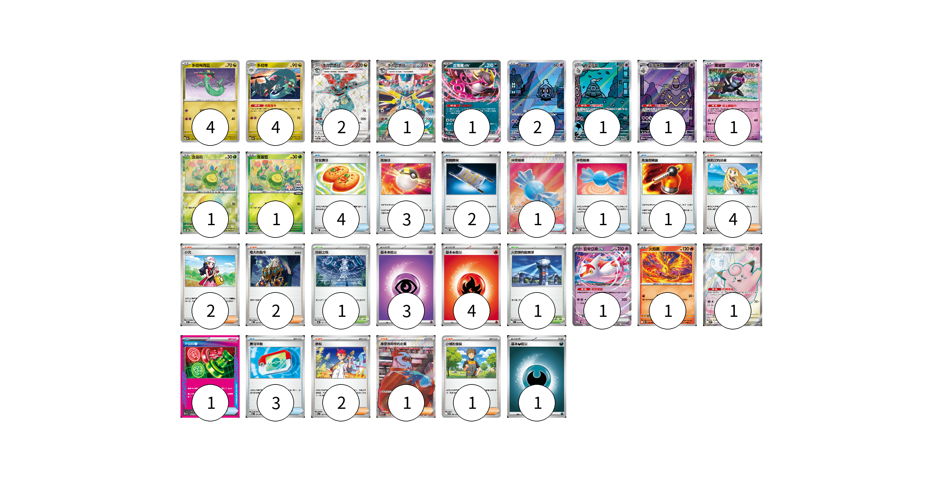 牌組構築方案 以此牌組為基礎新構築牌組 顯示卡面 顯示列表 寶可夢卡(22) 4 4 2 1 1 2 1 1 1 1 1 1 1 1 物品卡(16) 4 3 2 1 1 1 1 3 支援者卡(12) 4 2 2 2 1 1 競技場卡(2) 1 1 能量卡(8) 3 4 1 寶可夢卡(22) 卡牌名稱 張數 卡牌名稱 張數 多龍梅西亞 SV8a 118/187 04 多龍奇 SV8a 119/187 04 多龍巴魯托ex SV6 120/101 02 多龍巴魯托ex SV8a 221/187 01 吉雉雞ex SVOD 004/020 01 夜巡靈 SV6a 068/064 02 彷徨夜靈 SV6a 069/064 01 黑夜魔靈 SV6a 070/064 01 願增猿 SV6 055/101 01 含羞苞 SV8a 001/187 01 含羞苞 M-P 037/M-P 01 拉帝亞斯ex MBD 003/022 01 火焰鳥 M2 014/080 01 莉莉艾的皮皮ex SV9 115/100 01 物品卡(16) 卡牌名稱 張數 卡牌名稱 張數 好友寶芬 MBD 013/022 04 高級球 MBD 014/022 03 夜間擔架 MBD 016/022 02 神奇糖果 M1S 082/063 01 神奇糖果 MBG 013/022 01 高溫燃燒器 M2 074/080 01 不公印章 MC 633/742 01 寶可平板 M3 070/080 03 支援者卡(12) 卡牌名稱 張數 卡牌名稱 張數 莉莉艾的決意 MBD 021/022 04 小光 M2 077/080 02 老大的指令 MBD 020/022 02 赤松 MC 696/742 02 庫瑟洛斯奇的企圖 SV6a 086/064 01 小剛的發掘 SV9 096/100 01 競技場卡(2) 卡牌名稱 張數 卡牌名稱 張數 阻礙之塔 SV8a 181/187 01 火箭隊的監視塔 SV10 096/098 01 能量卡(8) 卡牌名稱 張數 卡牌名稱 張數 基本【超】能量 MBD PSY 03 基本【火】能量 M-P FIR 04 基本【惡】能量 MC DAR 01 以此牌組為基礎新構築牌組 牌組編碼 cXbpCP-aHwaWm-binxRP copy 列印牌組單 牌組編碼已複製 分享至SNS