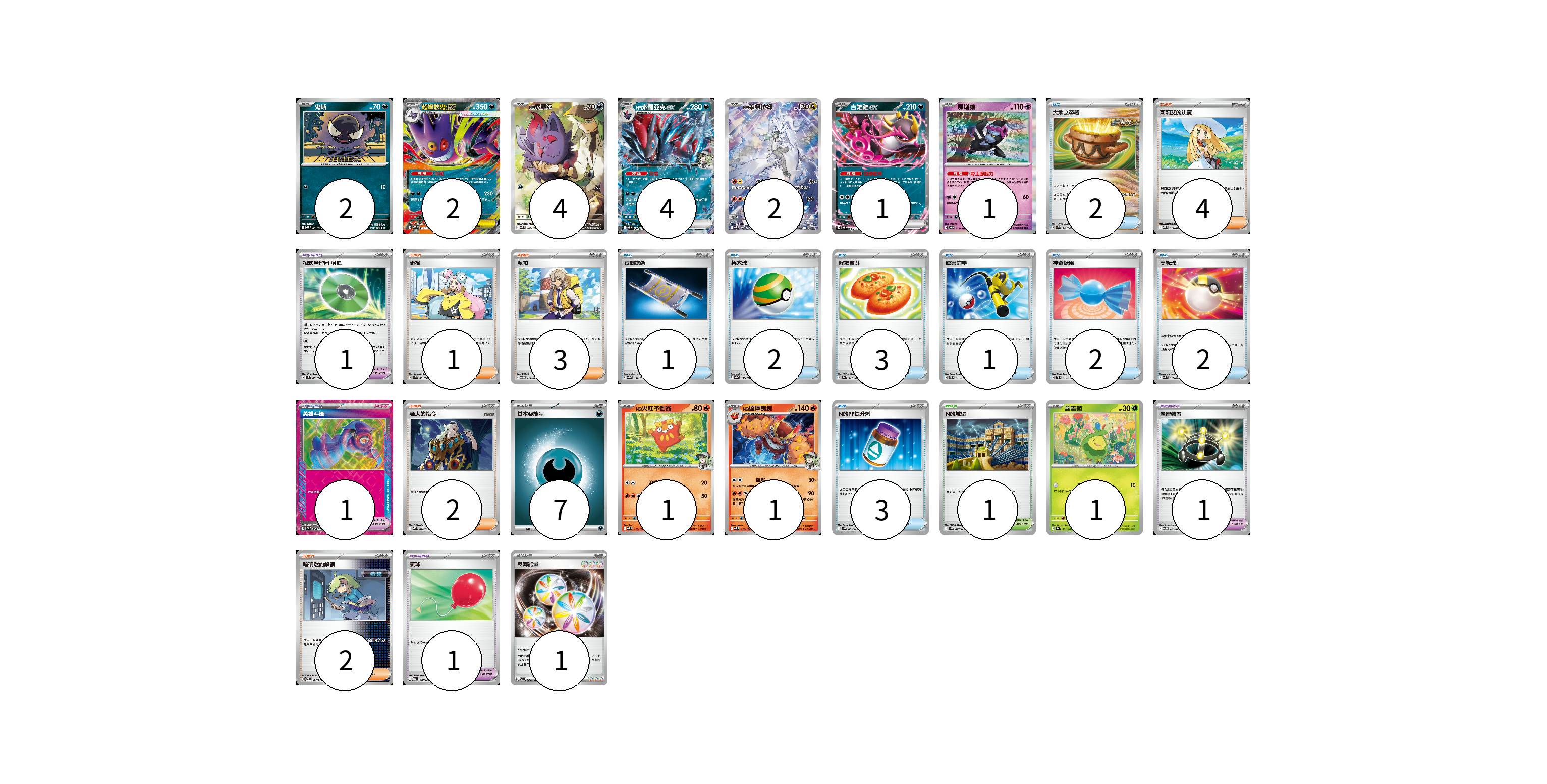 牌組構築方案 以此牌組為基礎新構築牌組 顯示卡面 顯示列表 寶可夢卡(19) 2 2 4 4 2 1 1 1 1 1 寶可夢道具(4) 1 1 1 1 物品卡(16) 2 1 2 3 1 2 2 3 支援者卡(12) 4 1 3 2 2 競技場卡(1) 1 能量卡(8) 7 1 寶可夢卡(19) 卡牌名稱 張數 卡牌名稱 張數 鬼斯 MBG 001/022 02 超級耿鬼ex MBG 003/022 02 N的索羅亞 SV9 108/100 04 N的索羅亞克ex SV9 061/100 04 N的萊希拉姆 SV9 109/100 02 吉雉雞ex SVOD 004/020 01 願增猿 SV6 055/101 01 N的火紅不倒翁 SV9 015/100 01 N的達摩狒狒 SV9 016/100 01 含羞苞 SV8a 001/187 01 寶可夢道具(4) 卡牌名稱 張數 卡牌名稱 張數 招式學習器 演進 SV4M 063/066 01 英雄斗篷 SV5M 064/071 01 學習裝置 SVTM 016/022 01 氣球 MBD 018/022 01 物品卡(16) 卡牌名稱 張數 卡牌名稱 張數 大地之容器 SVK 012/042 02 夜間擔架 SV8a 151/187 01 巢穴球 SV4a 159/190 02 好友寶芬 SV8a 147/187 03 厲害釣竿 SVTR 012/021 01 神奇糖果 SVTL 013/021 02 高級球 SVK 018/042 02 N的PP提升劑 SV9 089/100 03 支援者卡(12) 卡牌名稱 張數 卡牌名稱 張數 莉莉艾的決意 MBD 021/022 04 奇樹 SVK 031/042 01 派帕 SVTM 019/022 03 老大的指令 MBD 020/022 02 暗碼迷的解讀 SV5M 067/071 02 競技場卡(1) 卡牌名稱 張數 卡牌名稱 張數 N的城堡 SV9 097/100 01 能量卡(8) 卡牌名稱 張數 卡牌名稱 張數 基本【惡】能量 M-P DAR 07 反轉能量 SVD 139/139 01 以此牌組為基礎新構築牌組 牌組編碼 cYDLBY-DbOoRT-vYyIky copy 列印牌組單 牌組編碼已複製 分享至SNS