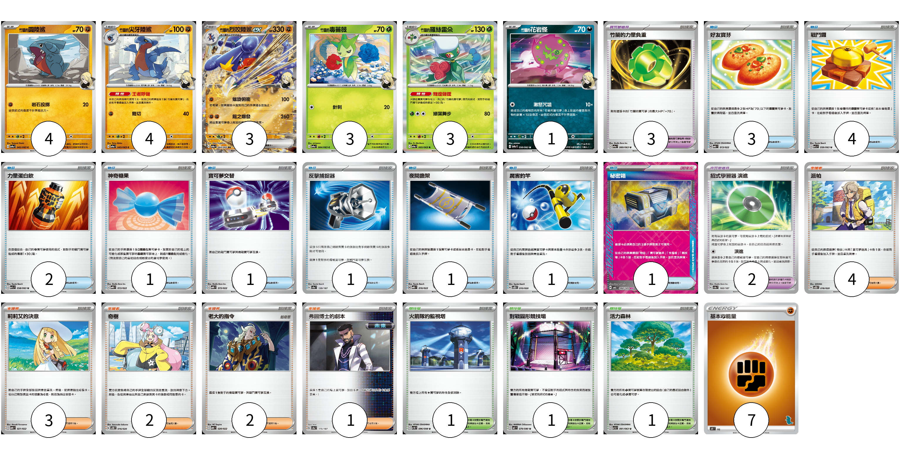 牌組構築方案 以此牌組為基礎新構築牌組 顯示卡面 顯示列表 寶可夢卡(18) 4 4 3 3 3 1 寶可夢道具(5) 3 2 物品卡(15) 3 4 2 1 1 1 1 1 1 支援者卡(12) 4 3 2 2 1 競技場卡(3) 1 1 1 能量卡(7) 7 寶可夢卡(18) 卡牌名稱 張數 卡牌名稱 張數 <竹蘭的>圓陸鯊 SV9a 042/063 04 <竹蘭的>尖牙陸鯊 SV9a 043/063 04 <竹蘭的>烈咬陸鯊ex SV9a 044/063 03 <竹蘭的>毒薔薇 SV9a 004/063 03 <竹蘭的>羅絲雷朵 SV9a 005/063 03 <竹蘭的>花岩怪 SV9a 050/063 01 寶可夢道具(5) 卡牌名稱 張數 卡牌名稱 張數 竹蘭的力量負重 SV9a 060/063 03 招式學習器 演進 SV8a 160/187 02 物品卡(15) 卡牌名稱 張數 卡牌名稱 張數 好友寶芬 MBD 013/022 03 戰鬥鑼 M1L 059/063 04 力量蛋白飲 M1L 058/063 02 神奇糖果 MBG 013/022 01 寶可夢交替 MBG 015/022 01 反擊捕捉器 SV8a 139/187 01 夜間擔架 MBD 016/022 01 厲害釣竿 SVOD 010/020 01 秘密箱 SV6 092/101 01 支援者卡(12) 卡牌名稱 張數 卡牌名稱 張數 派帕 SVOD 018/020 04 莉莉艾的決意 MBD 021/022 03 奇樹 SVOD 016/020 02 老大的指令 MBD 020/022 02 弗圖博士的劇本 SV8a 175/187 01 競技場卡(3) 卡牌名稱 張數 卡牌名稱 張數 火箭隊的監視塔 SV10 096/098 01 對戰圓形競技場 M2 079/080 01 活力森林 M1S 061/063 01 能量卡(7) 卡牌名稱 張數 卡牌名稱 張數 基本鬥能量 SH FIG 07 以此牌組為基礎新構築牌組 牌組編碼 cZLWkS-ssaQgc-OfmNWf copy 列印牌組單 牌組編碼已複製 分享至SNS