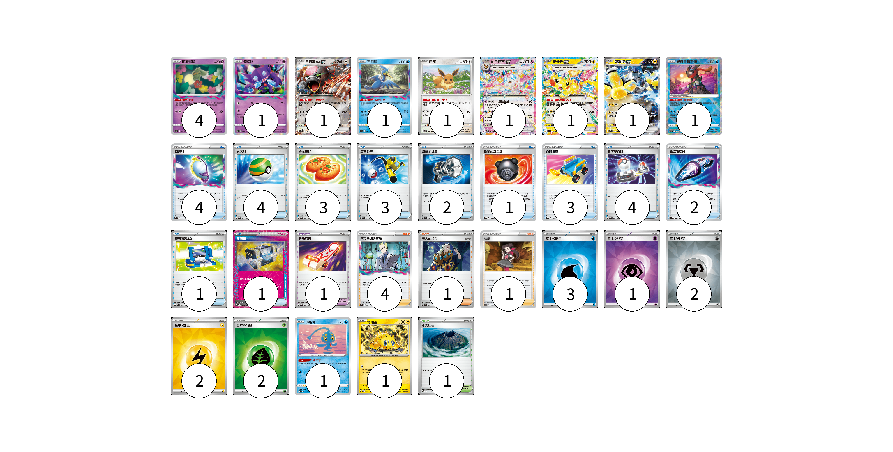 牌組構築方案 以此牌組為基礎新構築牌組 顯示卡面 顯示列表 寶可夢卡(14) 4 1 1 1 1 1 1 1 1 1 1 寶可夢道具(1) 1 物品卡(28) 4 4 3 3 2 1 3 4 2 1 1 支援者卡(6) 4 1 1 競技場卡(1) 1 能量卡(10) 3 1 2 2 2 寶可夢卡(14) 卡牌名稱 張數 卡牌名稱 張數 花療環環 S11 049/100 04 勾魂眼 S11 044/100 01 月月熊 赫月 ex SV5a 052/066 01 古月鳥 S11 033/100 01 伊布 SVPN 008/008 01 仙子伊布ex SVPN 005/008 01 皮卡丘ex SV8 033/106 01 鐵臂膀ex SVTR 007/021 01 光輝甲賀忍蛙 S9a 026/067 01 瑪納霏 SVF 003/038 01 電電蟲 SV7 032/102 01 寶可夢道具(1) 卡牌名稱 張數 卡牌名稱 張數 緊急滑板 SVK 023/042 01 物品卡(28) 卡牌名稱 張數 卡牌名稱 張數 幻想門 S12a 141/172 04 巢穴球 SVK 016/042 04 好友寶芬 SVK 015/042 03 厲害釣竿 SVK 011/042 03 反擊捕捉器 SVK 009/042 02 洗翠的沉重球 SVF 019/038 01 交替推車 SVTR 009/021 03 寶可夢交替 SVK 022/042 04 放逐吸塵器 SVF 023/038 02 寶可裝置3.0 SVK 021/042 01 秘密箱 SV6 092/101 01 支援者卡(6) 卡牌名稱 張數 卡牌名稱 張數 阿克羅瑪的實驗 S12a 148/172 04 老大的指令 SVK 036/042 01 杜娟 S9a 065/067 01 競技場卡(1) 卡牌名稱 張數 卡牌名稱 張數 引力山岳 SV8 106/106 01 能量卡(10) 卡牌名稱 張數 卡牌名稱 張數 基本【水】能量 SVK WAT 03 基本【超】能量 SVK PSY 01 基本【鋼】能量 SVK MET 02 基本【雷】能量 SVK LIG 02 基本【草】能量 SVK GRA 02 以此牌組為基礎新構築牌組 牌組編碼 cZvXRu-ITYPfy-MbWEKu copy 列印牌組單 牌組編碼已複製 分享至SNS