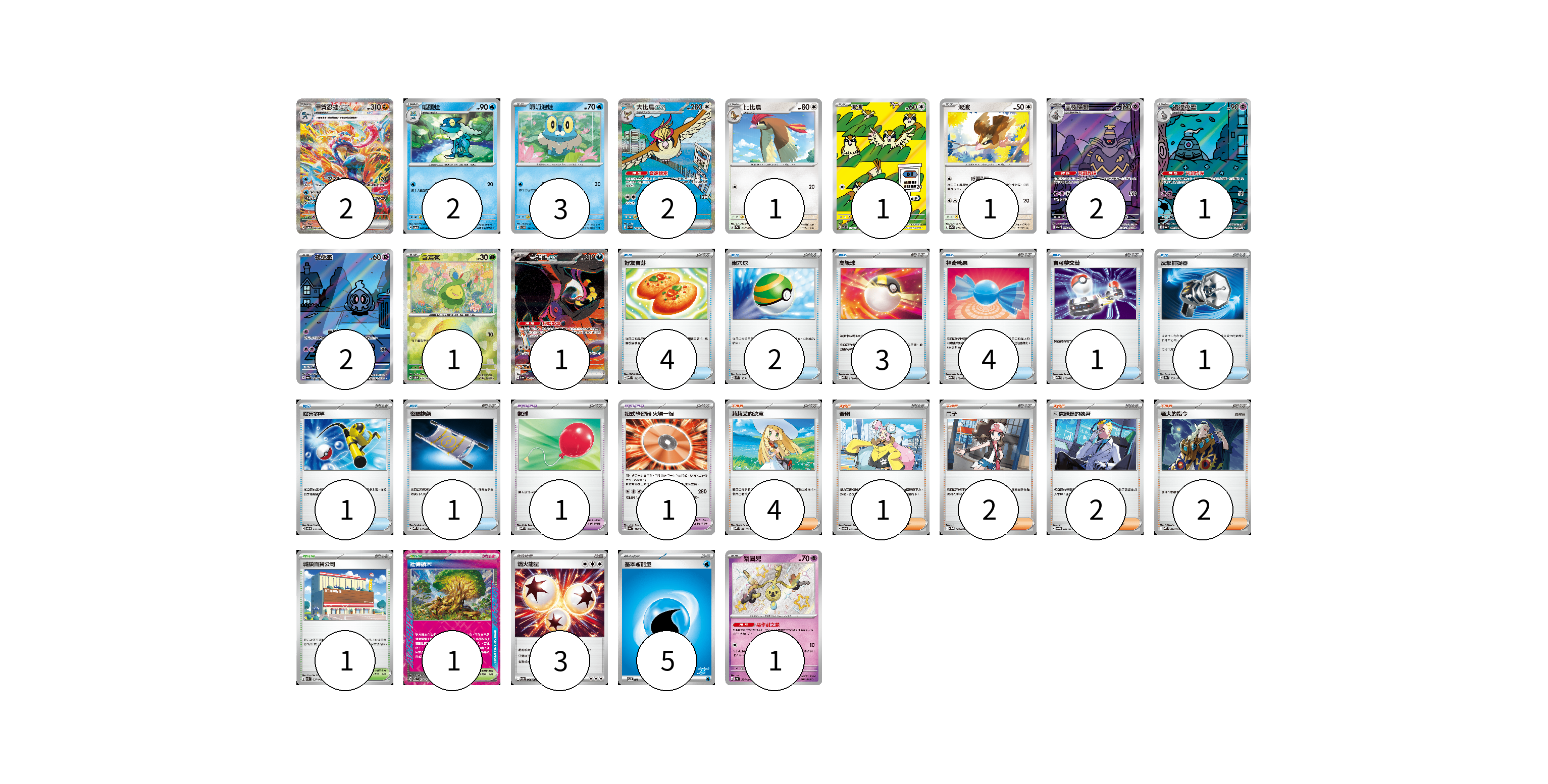 牌組構築方案 以此牌組為基礎新構築牌組 顯示卡面 顯示列表 寶可夢卡(20) 2 2 3 2 1 1 1 2 1 2 1 1 1 寶可夢道具(2) 1 1 物品卡(17) 4 2 3 4 1 1 1 1 支援者卡(11) 4 1 2 2 2 競技場卡(2) 1 1 能量卡(8) 3 5 寶可夢卡(20) 卡牌名稱 張數 卡牌名稱 張數 甲賀忍蛙ex SV5a 090/066 02 呱頭蛙 SV5a 024/066 02 呱呱泡蛙 SVD 027/139 03 大比鳥ex SV3 136/108 02 比比鳥 SV2a 017/165 01 波波 SV3 118/108 01 波波 SV2a 016/165 01 黑夜魔靈 SV6a 070/064 02 彷徨夜靈 SV6a 069/064 01 夜巡靈 SV6a 068/064 02 含羞苞 SV8a 001/187 01 吉雉雞ex SV6a 089/064 01 鑰圈兒 SV4a 264/190 01 寶可夢道具(2) 卡牌名稱 張數 卡牌名稱 張數 氣球 MBD 018/022 01 招式學習器 火場一爆 SV4a 170/190 01 物品卡(17) 卡牌名稱 張數 卡牌名稱 張數 好友寶芬 MBD 013/022 04 巢穴球 SVM 133/175 02 高級球 MBD 014/022 03 神奇糖果 MBG 013/022 04 寶可夢交替 MBG 015/022 01 反擊捕捉器 SV8a 139/187 01 厲害釣竿 SVOD 010/020 01 夜間擔架 MBD 016/022 01 支援者卡(11) 卡牌名稱 張數 卡牌名稱 張數 莉莉艾的決意 MBD 021/022 04 奇樹 SVOD 016/020 01 鬥子 SV11W 085/086 02 阿克羅瑪的執著 SVOM 017/021 02 老大的指令 MBD 020/022 02 競技場卡(2) 卡牌名稱 張數 卡牌名稱 張數 城鎮百貨公司 SVK 037/042 01 壯偉碩木 SV7 101/102 01 能量卡(8) 卡牌名稱 張數 卡牌名稱 張數 燃火能量 SV11W 086/086 03 基本【水】能量 SVI WAT 05 以此牌組為基礎新構築牌組 牌組編碼 caoZuk-QuAcDI-KcFHso copy 列印牌組單 牌組編碼已複製 分享至SNS
