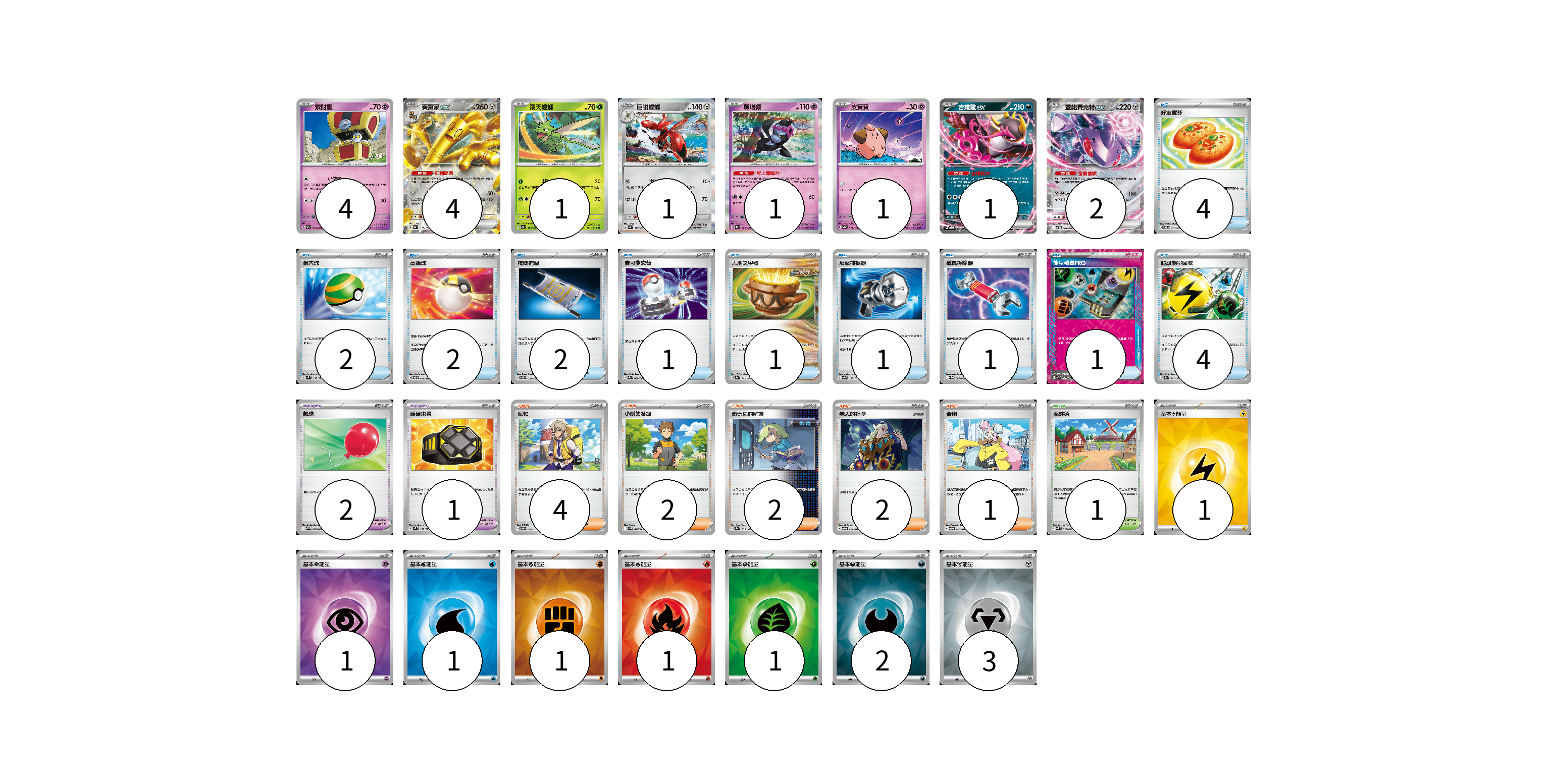 牌組構築方案 以此牌組為基礎新構築牌組 顯示卡面 顯示列表 寶可夢卡(15) 4 4 1 1 1 1 1 2 寶可夢道具(3) 2 1 物品卡(19) 4 2 2 2 1 1 1 1 1 4 支援者卡(11) 4 2 2 2 1 競技場卡(1) 1 能量卡(11) 1 1 1 1 1 1 2 3 寶可夢卡(15) 卡牌名稱 張數 卡牌名稱 張數 索財靈 SV7a 024/064 04 賽富豪ex SV8a 117/187 04 飛天螳螂 SV2a 123/165 01 巨鉗螳螂 SV4a 129/190 01 願增猿 SV8a 075/187 01 皮寶寶 SV4a 077/190 01 吉雉雞ex SVOD 004/020 01 蓋諾賽克特ex SV11B 069/086 02 寶可夢道具(3) 卡牌名稱 張數 卡牌名稱 張數 氣球 SV11B 082/086 02 硬硬束帶 SVM 139/175 01 物品卡(19) 卡牌名稱 張數 卡牌名稱 張數 好友寶芬 SVOD 011/020 04 巢穴球 SVM 133/175 02 高級球 SVOD 012/020 02 夜間擔架 SVOM 016/021 02 寶可夢交替 SV9a 058/063 01 大地之容器 SV8a 143/187 01 反擊捕捉器 SV8a 139/187 01 道具拆除器 SV11W 080/086 01 能量輸送PRO SV7a 052/064 01 超級能量回收 SV8a 141/187 04 支援者卡(11) 卡牌名稱 張數 卡牌名稱 張數 派帕 SVOD 018/020 04 小剛的發掘 SV9 096/100 02 暗碼迷的解讀 SV8a 165/187 02 老大的指令 SVOD 019/020 02 奇樹 SVOD 016/020 01 競技場卡(1) 卡牌名稱 張數 卡牌名稱 張數 深缽鎮 SVK 039/042 01 能量卡(11) 卡牌名稱 張數 卡牌名稱 張數 基本【雷】能量 SVK LIG 01 基本【超】能量 SVK PSY 01 基本【水】能量 SVK WAT 01 基本【鬥】能量 SVK FIG 01 基本【火】能量 SVK FIR 01 基本【草】能量 SVK GRA 01 基本【惡】能量 SVK DAR 02 基本【鋼】能量 SVK MET 03 以此牌組為基礎新構築牌組 牌組編碼 ccbMOi-HvksQa-ZmQTnI copy 列印牌組單 牌組編碼已複製 分享至SNS