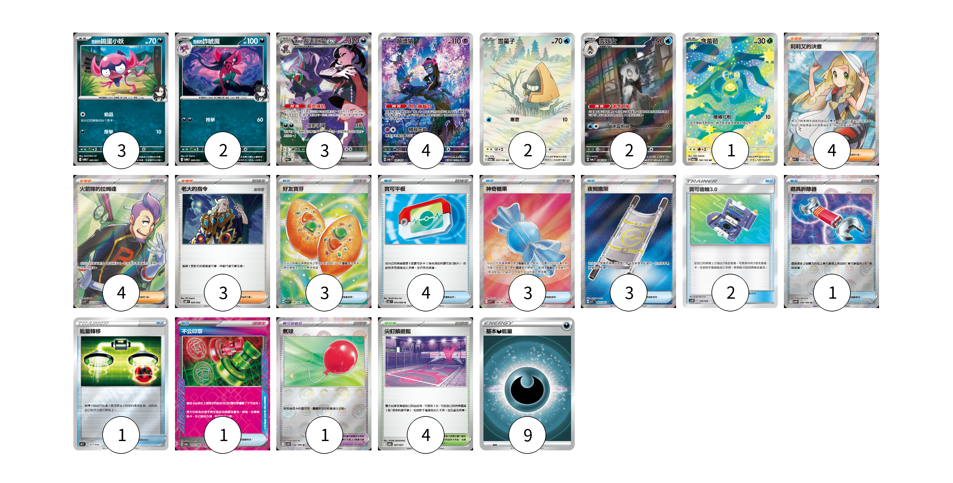 牌組構築方案 以此牌組為基礎新構築牌組 顯示卡面 顯示列表 寶可夢卡(17) 3 2 3 4 2 2 1 寶可夢道具(1) 1 物品卡(18) 3 4 3 3 2 1 1 1 支援者卡(11) 4 4 3 競技場卡(4) 4 能量卡(9) 9 寶可夢卡(17) 卡牌名稱 張數 卡牌名稱 張數 <瑪俐的>搗蛋小妖 SVOM 005/021 03 <瑪俐的>詐唬魔 SVOM 006/021 02 <瑪俐的>長毛巨魔ex M2a 243/193 03 願增猿 SV6 107/101 04 雪童子 M2a 200/193 02 雪妖女 SV6 104/101 02 含羞苞 M2a 196/193 01 寶可夢道具(1) 卡牌名稱 張數 卡牌名稱 張數 氣球 SV11B 082/086 01 物品卡(18) 卡牌名稱 張數 卡牌名稱 張數 好友寶芬 M1S 081/063 03 寶可平板 M3 070/080 04 神奇糖果 M1S 082/063 03 夜間擔架 M1L 083/063 03 寶可齒輪3.0 AS6D 150/168 02 道具拆除器 SV11W 080/086 01 能量轉移 SO 017/030 01 不公印章 SV5a 053/066 01 支援者卡(11) 卡牌名稱 張數 卡牌名稱 張數 莉莉艾的決意 M1L 086/063 04 火箭隊的拉姆達 SV10 122/098 04 老大的指令 MBD 020/022 03 競技場卡(4) 卡牌名稱 張數 卡牌名稱 張數 尖釘鎮道館 SVOM 021/021 04 能量卡(9) 卡牌名稱 張數 卡牌名稱 張數 基本惡能量 SLD DAR 09 以此牌組為基礎新構築牌組 牌組編碼 cfSxjR-ocDDkP-oNCvuI copy 列印牌組單 牌組編碼已複製 分享至SNS