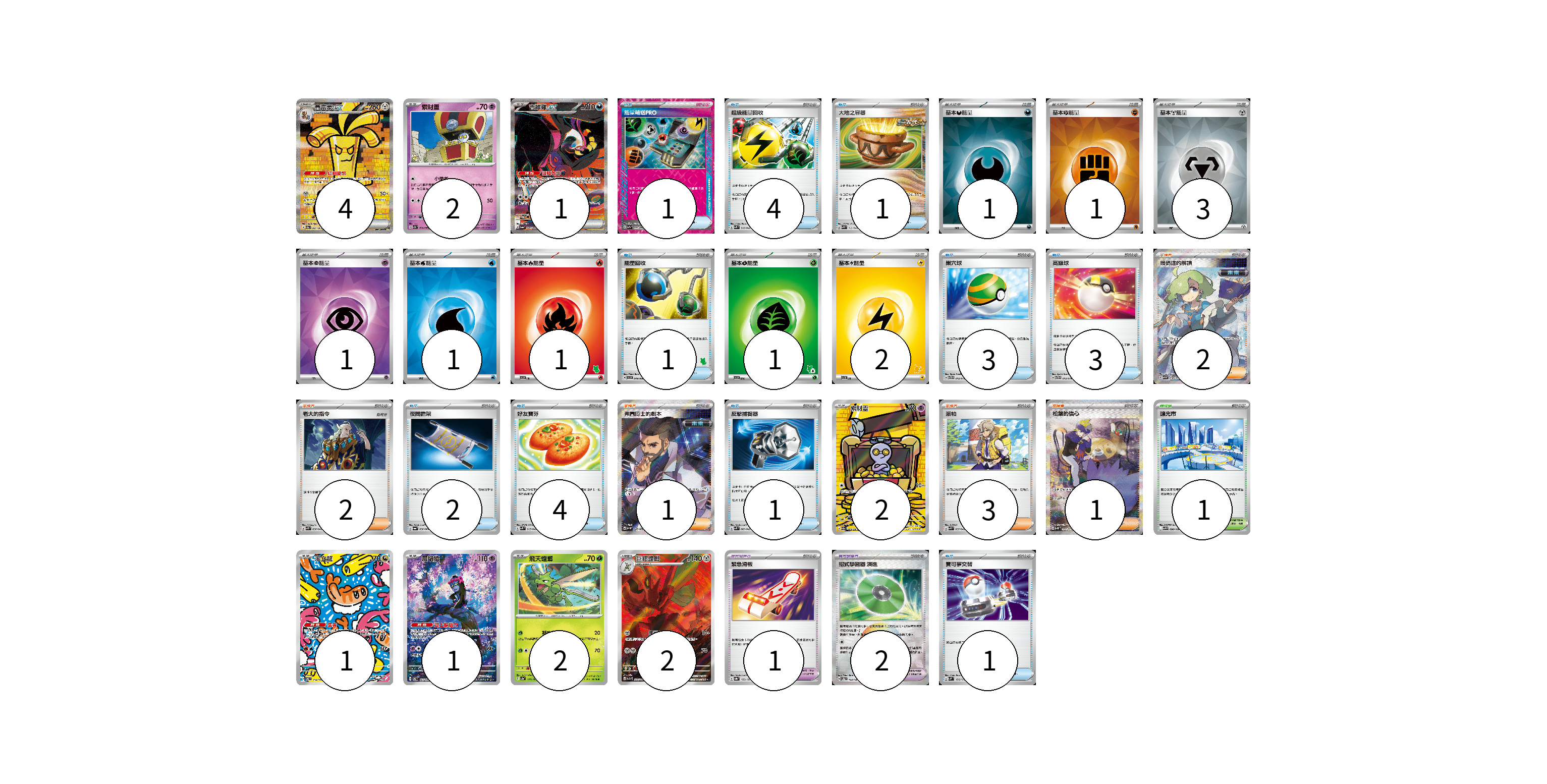牌組構築方案 以此牌組為基礎新構築牌組 顯示卡面 顯示列表 寶可夢卡(15) 4 2 1 2 1 1 2 2 寶可夢道具(3) 1 2 物品卡(21) 1 4 1 1 3 3 2 4 1 1 支援者卡(9) 2 2 1 3 1 競技場卡(1) 1 能量卡(11) 1 1 3 1 1 1 1 2 寶可夢卡(15) 卡牌名稱 張數 卡牌名稱 張數 賽富豪ex SV3a 087/062 04 索財靈 SV7a 024/064 02 吉雉雞ex SV6a 089/064 01 索財靈 SV3a 068/062 02 米立龍 SV6 112/101 01 願增猿 SV6 107/101 01 飛天螳螂 SV2a 123/165 02 巨鉗螳螂 SV3 116/108 02 寶可夢道具(3) 卡牌名稱 張數 卡牌名稱 張數 緊急滑板 SV8a 153/187 01 招式學習器 演進 SV8a 160/187 02 物品卡(21) 卡牌名稱 張數 卡牌名稱 張數 能量輸送PRO SV7a 052/064 01 超級能量回收 SVK 010/042 04 大地之容器 SVK 012/042 01 能量回收 SVI 049/066 01 巢穴球 SVTG 012/019 03 高級球 SVTG 013/019 03 夜間擔架 SV6a 056/064 02 好友寶芬 SVK 015/042 04 反擊捕捉器 SVK 009/042 01 寶可夢交替 SVM 136/175 01 支援者卡(9) 卡牌名稱 張數 卡牌名稱 張數 暗碼迷的解讀 SV5M 090/071 02 老大的指令 SVK 036/042 02 弗圖博士的劇本 SV4M 086/066 01 派帕 SVK 035/042 03 松葉的信心 SV5K 097/071 01 競技場卡(1) 卡牌名稱 張數 卡牌名稱 張數 釀光市 SV9 098/100 01 能量卡(11) 卡牌名稱 張數 卡牌名稱 張數 基本【惡】能量 SVK DAR 01 基本【鬥】能量 SVK FIG 01 基本【鋼】能量 SVK MET 03 基本【超】能量 SVK PSY 01 基本【水】能量 SVK WAT 01 基本【火】能量 SVI FIR 01 基本【草】能量 SVI GRA 01 基本【雷】能量 SVI LIG 02 以此牌組為基礎新構築牌組 牌組編碼 cftsxh-buqMoy-BHvSBq copy 列印牌組單 牌組編碼已複製 分享至SNS