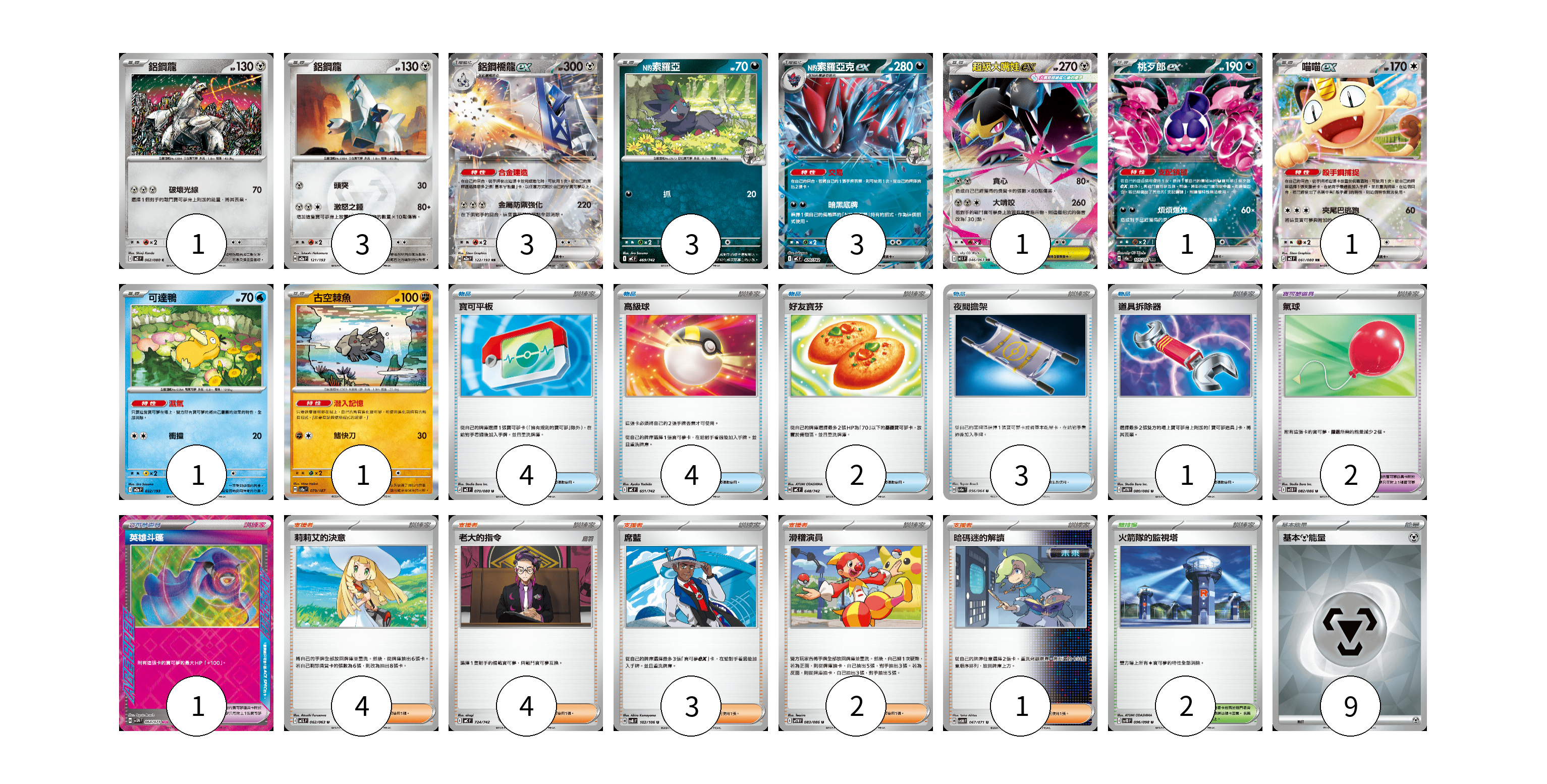 牌組構築方案 以此牌組為基礎新構築牌組 顯示卡面 顯示列表 寶可夢卡(18) 1 3 3 3 3 1 1 1 1 1 寶可夢道具(3) 2 1 物品卡(14) 4 4 2 3 1 支援者卡(14) 4 4 3 2 1 競技場卡(2) 2 能量卡(9) 9 寶可夢卡(18) 卡牌名稱 張數 卡牌名稱 張數 鋁鋼龍 M2 062/080 01 鋁鋼龍 M2a 121/193 03 鋁鋼橋龍ex M2a 122/193 03 <N的>索羅亞 MC 469/742 03 <N的>索羅亞克ex MC 470/742 03 超級大嘴娃ex M1L 046/063 01 桃歹郎ex SV8a 105/187 01 喵喵ex M3 061/080 01 可達鴨 M2a 032/193 01 古空棘魚 SV8a 079/187 01 寶可夢道具(3) 卡牌名稱 張數 卡牌名稱 張數 氣球 SV11B 082/086 02 英雄斗篷 SV5M 064/071 01 物品卡(14) 卡牌名稱 張數 卡牌名稱 張數 寶可平板 M3 070/080 04 高級球 MC 651/742 04 好友寶芬 MC 648/742 02 夜間擔架 SV6a 056/064 03 道具拆除器 SV11W 080/086 01 支援者卡(14) 卡牌名稱 張數 卡牌名稱 張數 莉莉艾的決意 M1L 062/063 04 老大的指令 MC 724/742 04 席藍 SV8 102/106 03 滑稽演員 SV11W 083/086 02 暗碼迷的解讀 SV5M 067/071 01 競技場卡(2) 卡牌名稱 張數 卡牌名稱 張數 火箭隊的監視塔 SV10 096/098 02 能量卡(9) 卡牌名稱 張數 卡牌名稱 張數 基本【鋼】能量 SVM MET 09 以此牌組為基礎新構築牌組 牌組編碼 cinawM-YPVwLI-anOOYl copy 列印牌組單 牌組編碼已複製 分享至SNS