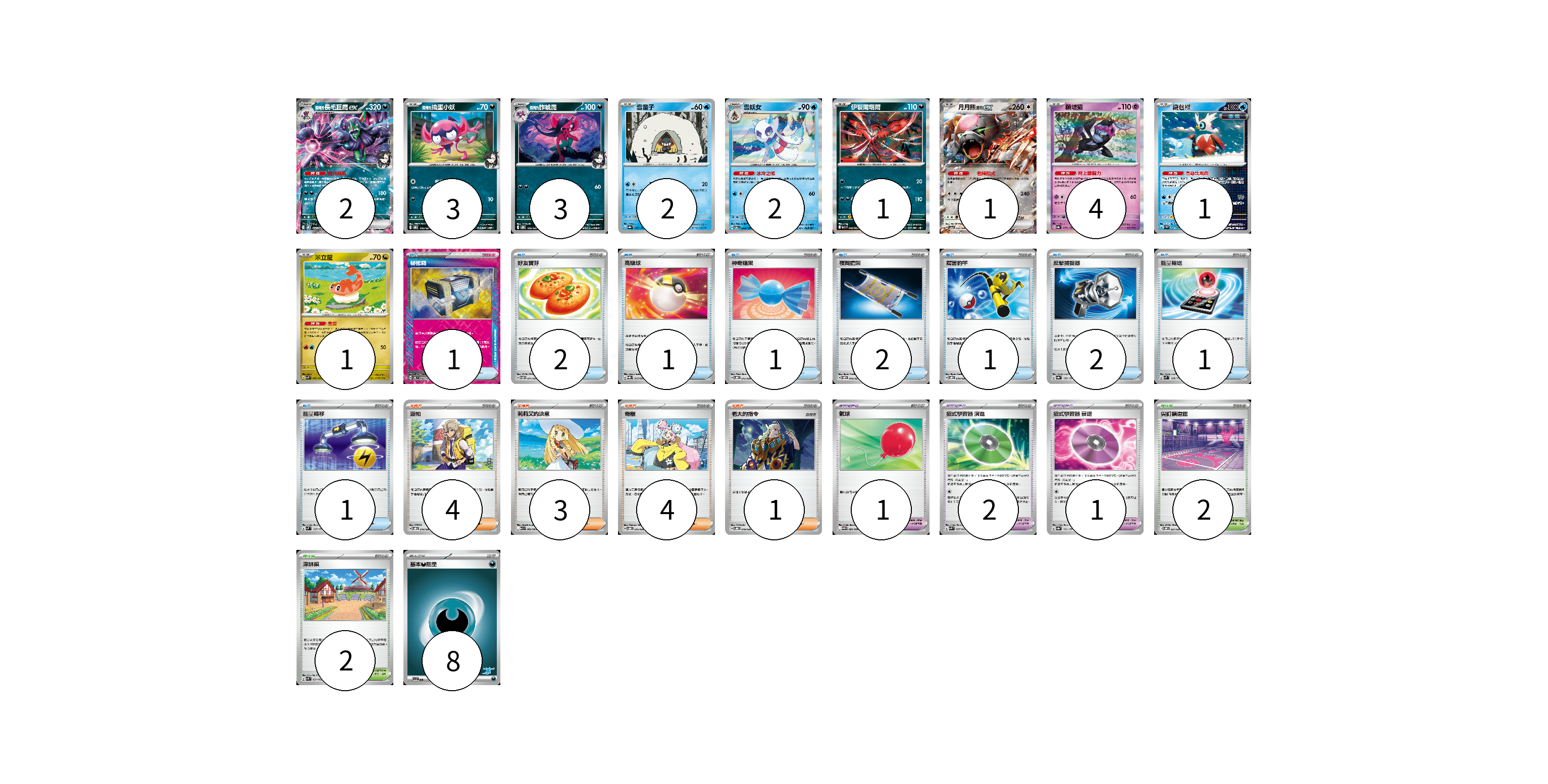 牌組構築方案 以此牌組為基礎新構築牌組 顯示卡面 顯示列表 寶可夢卡(20) 2 3 3 2 2 1 1 4 1 1 寶可夢道具(4) 1 2 1 物品卡(12) 1 2 1 1 2 1 2 1 1 支援者卡(12) 4 3 4 1 競技場卡(4) 2 2 能量卡(8) 8 寶可夢卡(20) 卡牌名稱 張數 卡牌名稱 張數 <瑪俐的>長毛巨魔ex SVOM 007/021 02 <瑪俐的>搗蛋小妖 SVOM 005/021 03 <瑪俐的>詐唬魔 SVOM 006/021 03 雪童子 SV8a 037/187 02 雪妖女 SV6 033/101 02 伊裴爾塔爾 M1L 040/063 01 月月熊 赫月 ex SV5a 052/066 01 願增猿 SV8a 075/187 04 鐵包袱 SV4M 020/066 01 米立龍 SVK 002/042 01 寶可夢道具(4) 卡牌名稱 張數 卡牌名稱 張數 氣球 SV11B 082/086 01 招式學習器 演進 SVK 025/042 02 招式學習器 衰退 SV8a 161/187 01 物品卡(12) 卡牌名稱 張數 卡牌名稱 張數 秘密箱 SV6 092/101 01 好友寶芬 SVTM 011/022 02 高級球 SVQL 015/022 01 神奇糖果 SVOD 013/020 01 夜間擔架 SVOM 016/021 02 厲害釣竿 SVOD 010/020 01 反擊捕捉器 SV8a 139/187 02 能量輸送 SVM 128/175 01 能量轉移 SVM 127/175 01 支援者卡(12) 卡牌名稱 張數 卡牌名稱 張數 派帕 SVOD 018/020 04 莉莉艾的決意 M1L 062/063 03 奇樹 SVOD 016/020 04 老大的指令 SVOD 019/020 01 競技場卡(4) 卡牌名稱 張數 卡牌名稱 張數 尖釘鎮道館 SVOM 021/021 02 深缽鎮 SVK 039/042 02 能量卡(8) 卡牌名稱 張數 卡牌名稱 張數 基本【惡】能量 SVI DAR 08 以此牌組為基礎新構築牌組 牌組編碼 cjWBCJ-PtOKsO-VMORIU copy 列印牌組單 牌組編碼已複製 分享至SNS