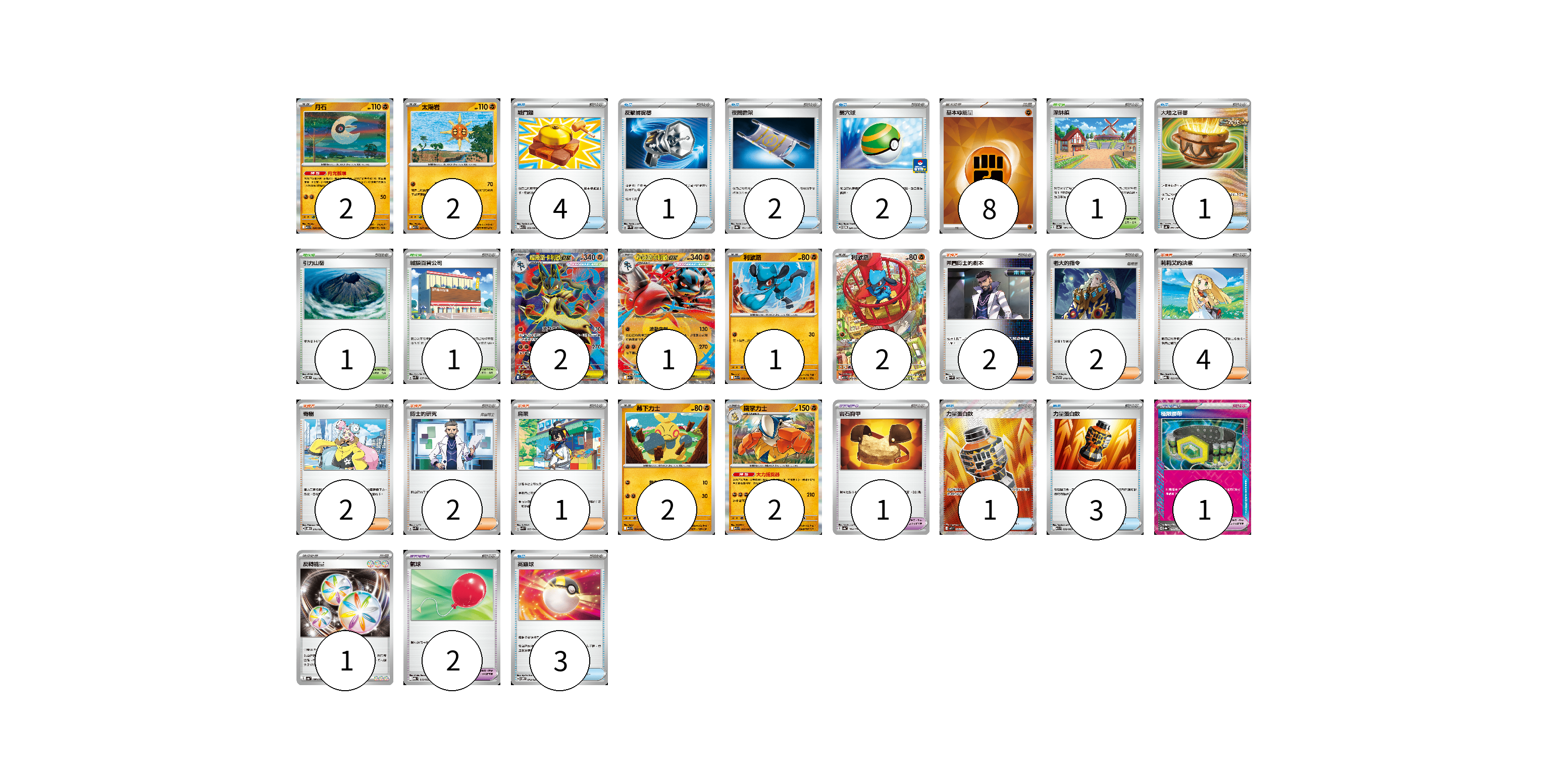 牌組構築方案 以此牌組為基礎新構築牌組 顯示卡面 顯示列表 寶可夢卡(14) 2 2 2 1 1 2 2 2 寶可夢道具(4) 1 1 2 物品卡(17) 4 1 2 2 1 1 3 3 支援者卡(13) 2 2 4 2 2 1 競技場卡(3) 1 1 1 能量卡(9) 8 1 寶可夢卡(14) 卡牌名稱 張數 卡牌名稱 張數 月石 M1L 026/063 02 太陽岩 M1L 027/063 02 超級路卡利歐ex M1L 078/063 02 超級路卡利歐ex M1L 029/063 01 利歐路 M1L 028/063 01 利歐路 M1L 068/063 02 幕下力士 M1L 024/063 02 鐵掌力士 M1L 025/063 02 寶可夢道具(4) 卡牌名稱 張數 卡牌名稱 張數 岩石胸甲 SV4a 164/190 01 極限腰帶 SV8a 159/187 01 氣球 MBG 019/022 02 物品卡(17) 卡牌名稱 張數 卡牌名稱 張數 戰鬥鑼 M1L 059/063 04 反擊捕捉器 SV4M 059/066 01 夜間擔架 SV8a 151/187 02 巢穴球 SV-P 091/SV-P 02 大地之容器 SV4K 060/066 01 力量蛋白飲 M1L 081/063 01 力量蛋白飲 M1L 058/063 03 高級球 SVOM 013/021 03 支援者卡(13) 卡牌名稱 張數 卡牌名稱 張數 弗圖博士的劇本 SV4M 065/066 02 老大的指令 SVTG 019/019 02 莉莉艾的決意 MBG 022/022 04 奇樹 SVOD 016/020 02 博士的研究 SVK 033/042 02 烏栗 SVK 029/042 01 競技場卡(3) 卡牌名稱 張數 卡牌名稱 張數 深缽鎮 SV4a 185/190 01 引力山岳 SV8 106/106 01 城鎮百貨公司 SVK 037/042 01 能量卡(9) 卡牌名稱 張數 卡牌名稱 張數 基本【鬥】能量 SVK FIG 08 反轉能量 SV4a 189/190 01 以此牌組為基礎新構築牌組 牌組編碼 cmUOhG-zuRKEp-vsrOFF copy 列印牌組單 牌組編碼已複製 分享至SNS