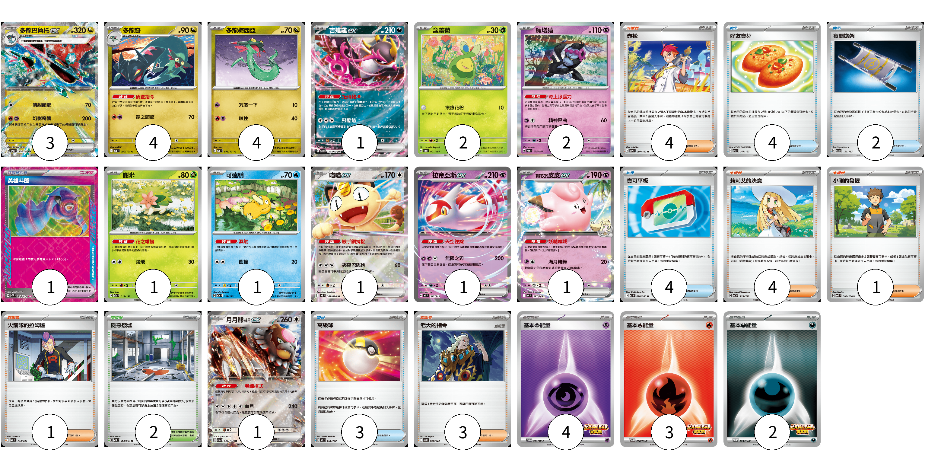 牌組構築方案 以此牌組為基礎新構築牌組 顯示卡面 顯示列表 寶可夢卡(22) 3 4 4 1 2 2 1 1 1 1 1 1 寶可夢道具(1) 1 物品卡(13) 4 2 4 3 支援者卡(13) 4 4 1 1 3 競技場卡(2) 2 能量卡(9) 4 3 2 寶可夢卡(22) 卡牌名稱 張數 卡牌名稱 張數 多龍巴魯托ex SV6 081/101 03 多龍奇 SV6 080/101 04 多龍梅西亞 SV6 079/101 04 吉雉雞ex SV6a 038/064 01 含羞苞 SV8a 001/187 02 願增猿 SV8a 075/187 02 謝米 M2a 012/193 01 可達鴨 M2a 032/193 01 喵喵ex M3 061/080 01 拉帝亞斯ex MC 312/742 01 <莉莉艾的>皮皮ex MC 287/742 01 月月熊 赫月ex SV8a 134/187 01 寶可夢道具(1) 卡牌名稱 張數 卡牌名稱 張數 英雄斗篷 SV5M 064/071 01 物品卡(13) 卡牌名稱 張數 卡牌名稱 張數 好友寶芬 SV8a 147/187 04 夜間擔架 SV8a 151/187 02 寶可平板 M3 070/080 04 高級球 MC 651/742 03 支援者卡(13) 卡牌名稱 張數 卡牌名稱 張數 赤松 SV7 097/102 04 莉莉艾的決意 MC 729/742 04 小剛的發掘 SV9 096/100 01 火箭隊的拉姆達 MC 734/742 01 老大的指令 MBD 020/022 03 競技場卡(2) 卡牌名稱 張數 卡牌名稱 張數 險惡廢墟 M1L 063/063 02 能量卡(9) 卡牌名稱 張數 卡牌名稱 張數 基本【超】能量 SV-P 261/SV-P 04 基本【火】能量 SV-P 258/SV-P 03 基本【惡】能量 SV-P 263/SV-P 02 以此牌組為基礎新構築牌組 牌組編碼 cmuMMp-rKRFgN-JFehaZ copy 列印牌組單 牌組編碼已複製 分享至SNS