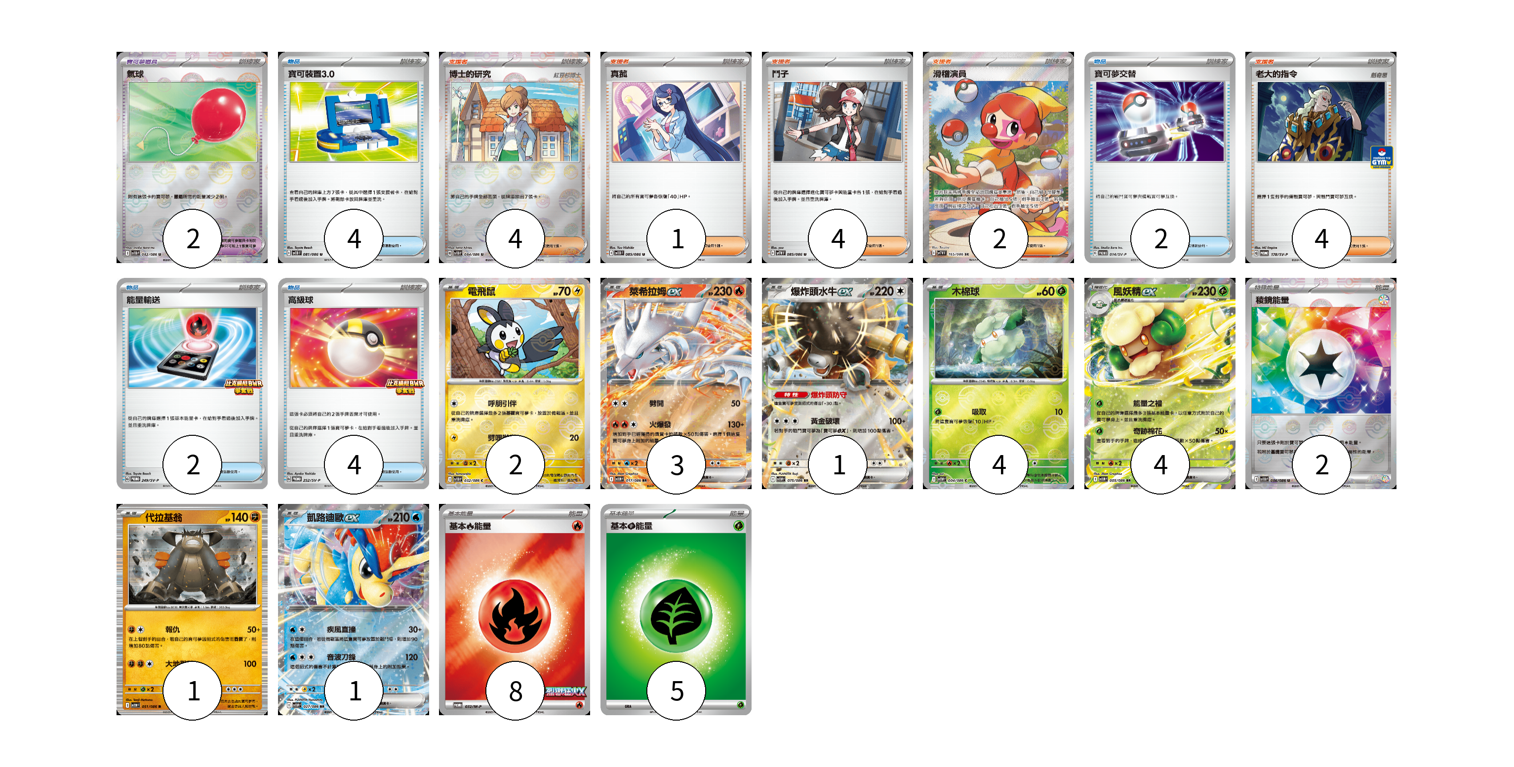 牌組構築方案 以此牌組為基礎新構築牌組 顯示卡面 顯示列表 寶可夢卡(16) 2 3 1 4 4 1 1 寶可夢道具(2) 2 物品卡(12) 4 2 2 4 支援者卡(15) 4 1 4 2 4 能量卡(15) 2 8 5 寶可夢卡(16) 卡牌名稱 張數 卡牌名稱 張數 電飛鼠 SV11B 032/086 02 萊希拉姆ex SV11W 017/086 03 爆炸頭水牛ex SV11W 075/086 01 木棉球 SV11W 004/086 04 風妖精ex SV11W 005/086 04 代拉基翁 SV11W 051/086 01 凱路迪歐ex SV11W 027/086 01 寶可夢道具(2) 卡牌名稱 張數 卡牌名稱 張數 氣球 SV11B 082/086 02 物品卡(12) 卡牌名稱 張數 卡牌名稱 張數 寶可裝置3.0 SV11B 081/086 04 寶可夢交替 SV-P 014/SV-P 02 能量輸送 SV-P 249/SV-P 02 高級球 SV-P 252/SV-P 04 支援者卡(15) 卡牌名稱 張數 卡牌名稱 張數 博士的研究 SV11B 084/086 04 真菰 SV11B 085/086 01 鬥子 SV11W 085/086 04 滑稽演員 SV11W 165/086 02 老大的指令 SV-P 178/SV-P 04 能量卡(15) 卡牌名稱 張數 卡牌名稱 張數 稜鏡能量 SV11B 086/086 02 基本【火】能量 M-P 032/M-P 08 基本【草】能量 M-P GRA 05 以此牌組為基礎新構築牌組 牌組編碼 coIBYr-usRNVq-HWqZig copy 列印牌組單 牌組編碼已複製 分享至SNS