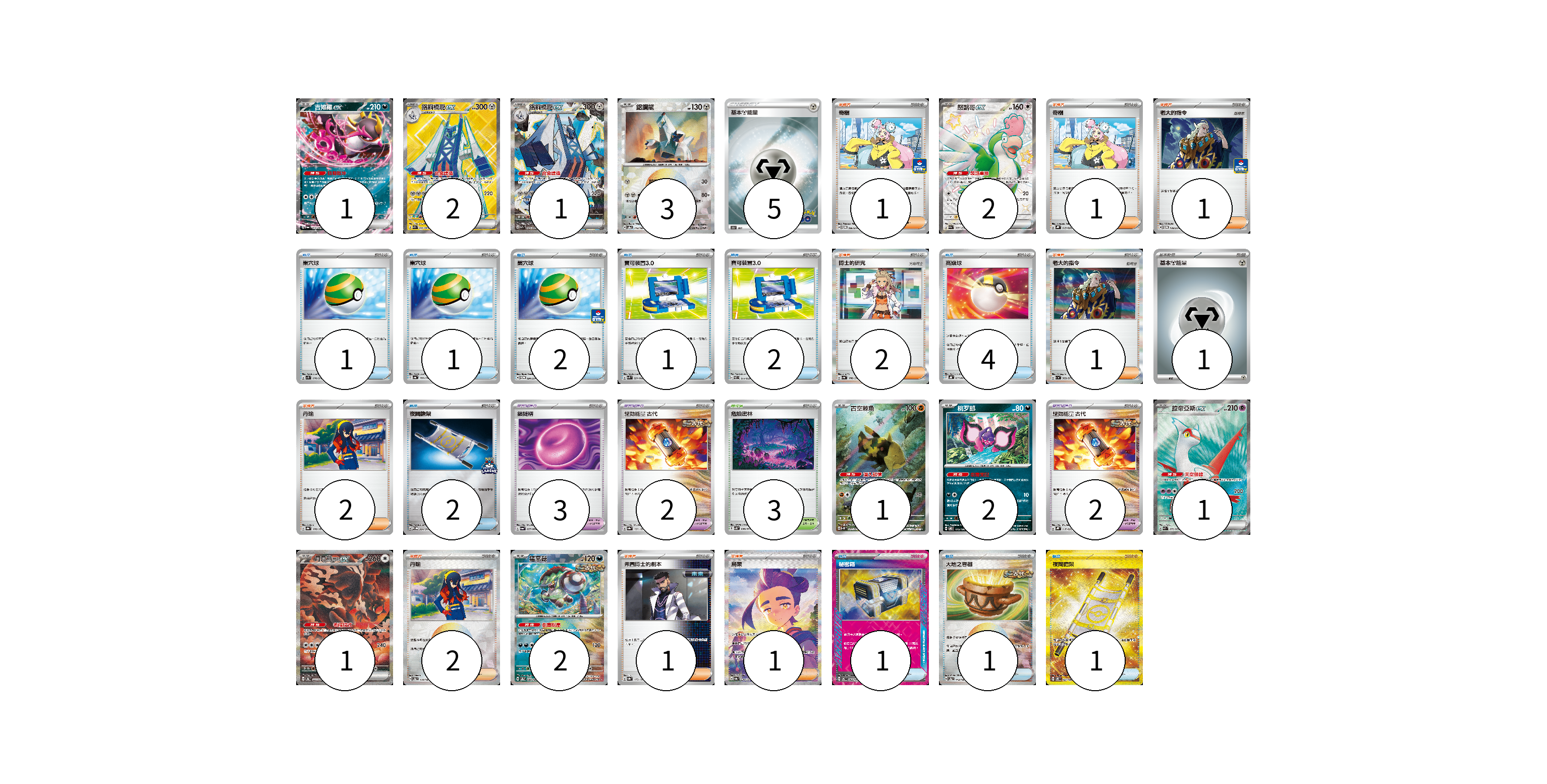 牌組構築方案 以此牌組為基礎新構築牌組 顯示卡面 顯示列表 寶可夢卡(16) 1 2 1 3 2 1 2 1 1 2 寶可夢道具(7) 3 2 2 物品卡(16) 1 1 2 1 2 4 2 1 1 1 支援者卡(12) 1 1 1 2 1 2 2 1 1 競技場卡(3) 3 能量卡(6) 5 1 寶可夢卡(16) 卡牌名稱 張數 卡牌名稱 張數 吉雉雞ex SV6a 038/064 01 鋁鋼橋龍ex SV7a 080/064 02 鋁鋼橋龍ex SV7a 088/064 01 鋁鋼龍 SV8a 112/187 03 怒鸚哥ex SV4a 337/190 02 古空棘魚 SV5K 077/071 01 桃歹郎 SV8 075/106 02 拉帝亞斯ex SV7a 078/064 01 月月熊 赫月ex SV8a 225/187 01 猛惡菇 SV8a 099/187 02 寶可夢道具(7) 卡牌名稱 張數 卡牌名稱 張數 鎖鏈糬 SV6a 057/064 03 驅勁能量 古代 SV8a 157/187 02 驅勁能量 古代 SVHK 016/022 02 物品卡(16) 卡牌名稱 張數 卡牌名稱 張數 巢穴球 SV1S 070/078 01 巢穴球 SV4a 159/190 01 巢穴球 SV-P 091/SV-P 02 寶可裝置3.0 SVK 021/042 01 寶可裝置3.0 SVEL 014/020 02 高級球 SVHK 013/022 04 夜間擔架 SV-P 204/SV-P 02 秘密箱 SV6 092/101 01 大地之容器 SV8a 143/187 01 夜間擔架 SV8 137/106 01 支援者卡(12) 卡牌名稱 張數 卡牌名稱 張數 奇樹 SV-P 106/SV-P 01 奇樹 SVHK 019/022 01 老大的指令 SV-P 178/SV-P 01 博士的研究 SV4a 176/190 02 老大的指令 SV1a 069/073 01 丹瑜 SV8a 170/187 02 丹瑜 SV8a 170/187 02 弗圖博士的劇本 SV8a 175/187 01 烏栗 SV8a 230/187 01 競技場卡(3) 卡牌名稱 張數 卡牌名稱 張數 危險密林 SV5K 070/071 03 能量卡(6) 卡牌名稱 張數 卡牌名稱 張數 基本鋼能量 S10b MET 05 基本【鋼】能量 SVB MET 01 以此牌組為基礎新構築牌組 牌組編碼 crAoIX-zECYkk-OkjKlM copy 列印牌組單 牌組編碼已複製 分享至SNS