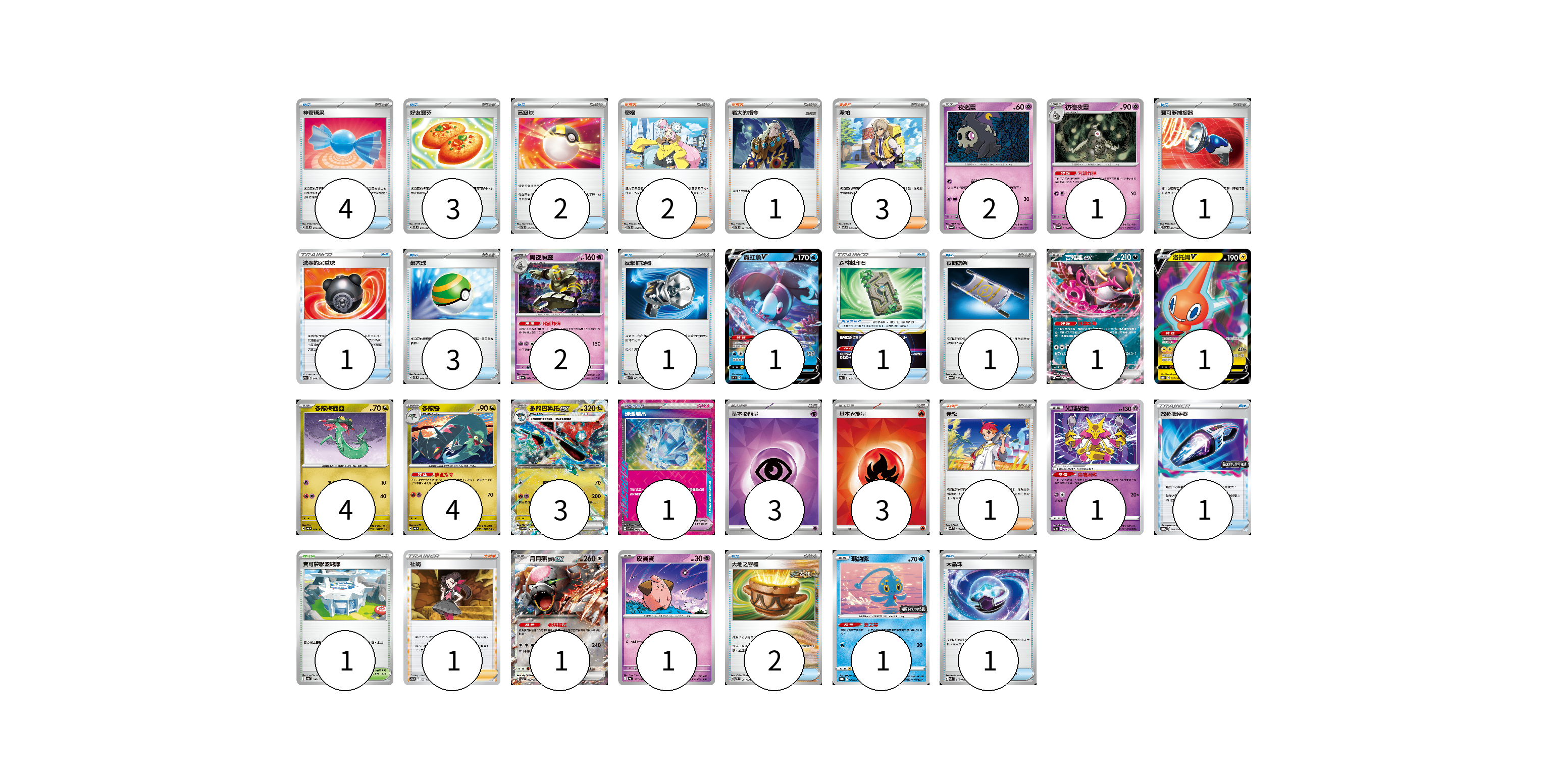 牌組構築方案 以此牌組為基礎新構築牌組 顯示卡面 顯示列表 寶可夢卡(23) 2 1 2 1 1 1 4 4 3 1 1 1 1 寶可夢道具(3) 2 1 物品卡(21) 4 3 2 1 1 3 1 1 1 1 2 1 支援者卡(6) 1 3 1 1 競技場卡(1) 1 能量卡(6) 3 3 寶可夢卡(23) 卡牌名稱 張數 卡牌名稱 張數 夜巡靈 SV6a 018/064 02 彷徨夜靈 SV6a 019/064 01 黑夜魔靈 SV6a 020/064 02 霓虹魚V S9 030/100 01 吉雉雞ex SV6a 038/064 01 洛托姆V S11 037/100 01 多龍梅西亞 SV6 079/101 04 多龍奇 SV6 080/101 04 多龍巴魯托ex SV6 081/101 03 光輝胡地 SVTM 006/022 01 月月熊 赫月 ex SV5a 052/066 01 皮寶寶 SV4a 077/190 01 瑪納霏 SV-P 135/SV-P 01 寶可夢道具(3) 卡牌名稱 張數 卡牌名稱 張數 奇樹 SVTL 018/021 02 璀璨結晶 SV7 094/102 01 物品卡(21) 卡牌名稱 張數 卡牌名稱 張數 神奇糖果 SVTL 013/021 04 好友寶芬 SVTL 010/021 03 高級球 SVTL 012/021 02 寶可夢捕捉器 SV5a 057/066 01 洗翠的沉重球 SVF 019/038 01 巢穴球 SVTL 011/021 03 反擊捕捉器 SVK 009/042 01 森林封印石 SVF 024/038 01 夜間擔架 SV6a 056/064 01 放逐吸塵器 SV-P 139/SV-P 01 大地之容器 SVTS 011/022 02 太晶珠 SVK 013/042 01 支援者卡(6) 卡牌名稱 張數 卡牌名稱 張數 老大的指令 SVTL 021/021 01 派帕 SVTL 020/021 03 赤松 SVK 027/042 01 杜娟 S12a 157/172 01 競技場卡(1) 卡牌名稱 張數 卡牌名稱 張數 寶可夢聯盟總部 SV4a 186/190 01 能量卡(6) 卡牌名稱 張數 卡牌名稱 張數 基本【超】能量 SVK PSY 03 基本【火】能量 SVK FIR 03 以此牌組為基礎新構築牌組 牌組編碼 crXzOZ-ddGjtk-JcjgSM copy 列印牌組單 牌組編碼已複製 分享至SNS