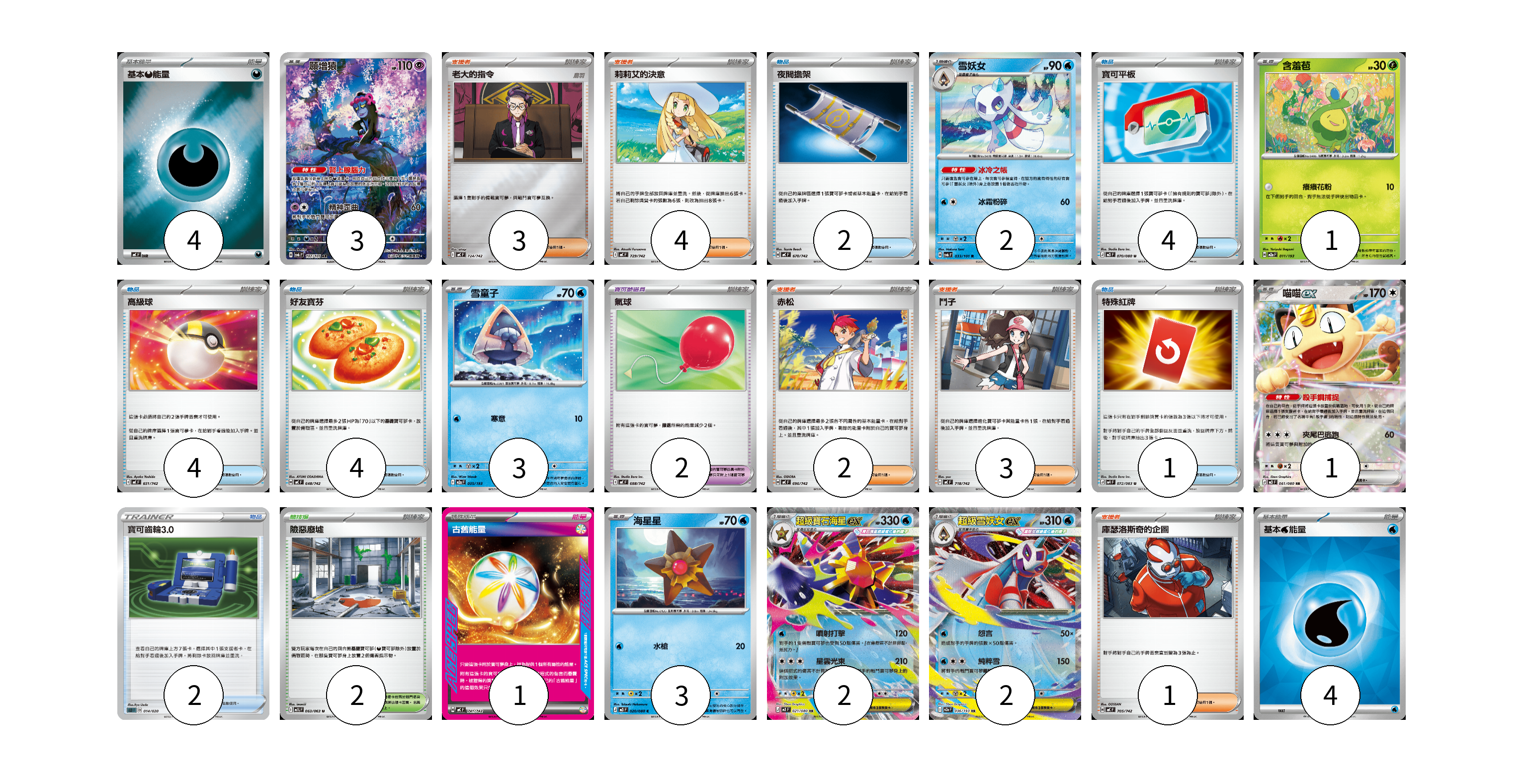 牌組構築方案 以此牌組為基礎新構築牌組 顯示卡面 顯示列表 寶可夢卡(17) 3 2 1 3 1 3 2 2 寶可夢道具(2) 2 物品卡(17) 2 4 4 4 1 2 支援者卡(13) 3 4 2 3 1 競技場卡(2) 2 能量卡(9) 4 1 4 寶可夢卡(17) 卡牌名稱 張數 卡牌名稱 張數 願增猿 SV6 107/101 03 雪妖女 SV6 033/101 02 含羞苞 M2a 011/193 01 雪童子 M2a 035/193 03 喵喵ex M3 061/080 01 海星星 M3 020/080 03 超級寶石海星ex M3 021/080 02 超級雪妖女ex M2a 036/193 02 寶可夢道具(2) 卡牌名稱 張數 卡牌名稱 張數 氣球 MC 688/742 02 物品卡(17) 卡牌名稱 張數 卡牌名稱 張數 夜間擔架 MC 670/742 02 寶可平板 M3 070/080 04 高級球 MC 651/742 04 好友寶芬 MC 648/742 04 特殊紅牌 M4 072/083 01 寶可齒輪3.0 SLD 014/020 02 支援者卡(13) 卡牌名稱 張數 卡牌名稱 張數 老大的指令 MC 724/742 03 莉莉艾的決意 MC 729/742 04 赤松 MC 696/742 02 鬥子 MC 718/742 03 庫瑟洛斯奇的企圖 MC 705/742 01 競技場卡(2) 卡牌名稱 張數 卡牌名稱 張數 險惡廢墟 M1L 063/063 02 能量卡(9) 卡牌名稱 張數 卡牌名稱 張數 基本【惡】能量 MC DAR 04 古舊能量 MC 741/742 01 基本【水】能量 SVM WAT 04 以此牌組為基礎新構築牌組 牌組編碼 cuHDMQ-NnQHFk-fYfsFa copy 列印牌組單 牌組編碼已複製 分享至SNS