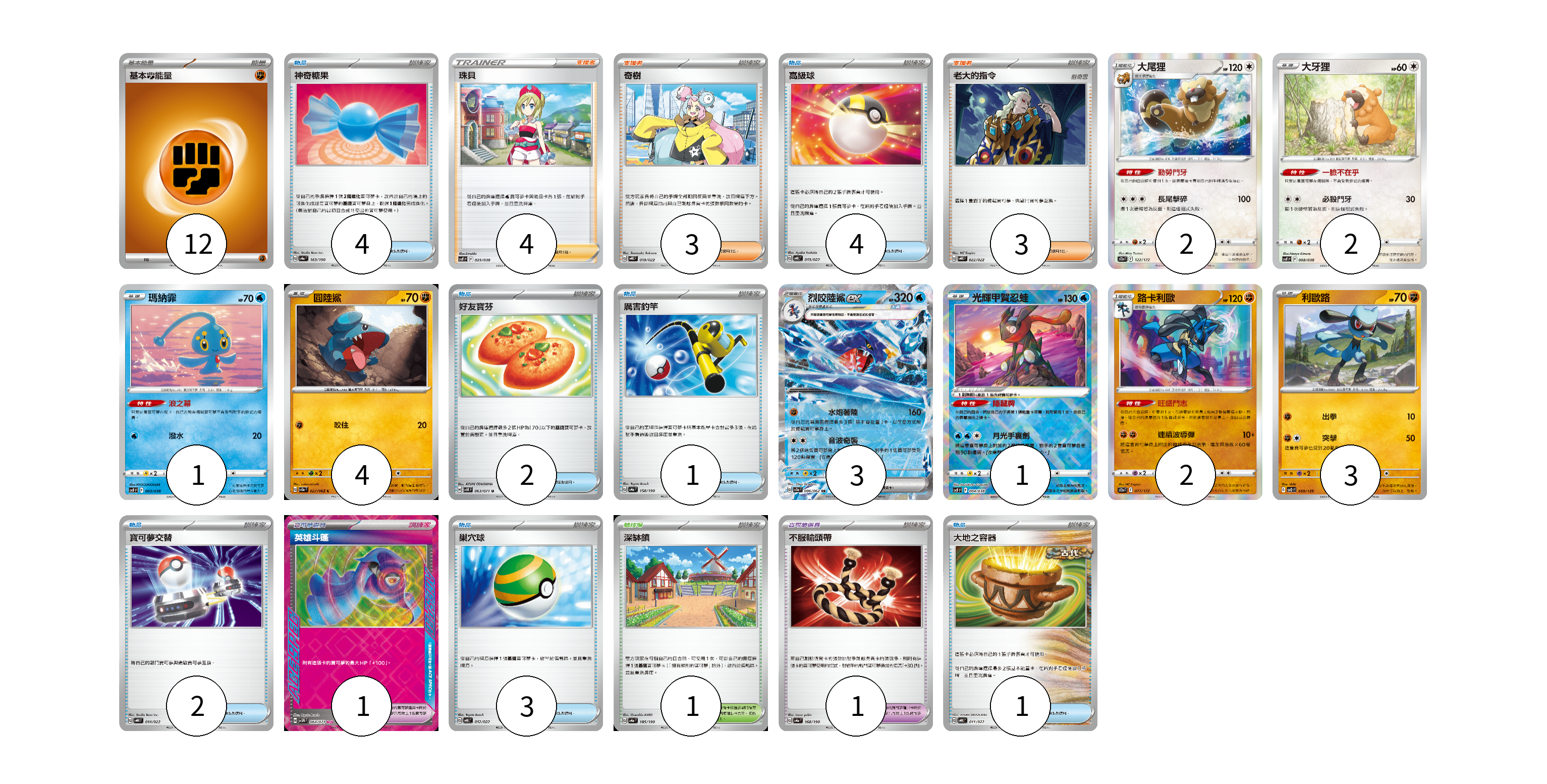 牌組構築方案 以此牌組為基礎新構築牌組 顯示卡面 顯示列表 寶可夢卡(18) 2 2 1 4 3 1 2 3 寶可夢道具(2) 1 1 物品卡(17) 4 4 2 1 2 3 1 支援者卡(10) 4 3 3 競技場卡(1) 1 能量卡(12) 12 寶可夢卡(18) 卡牌名稱 張數 卡牌名稱 張數 大尾狸 S12a 122/172 02 大牙狸 SVF 008/038 02 瑪納霏 SVF 003/038 01 圓陸鯊 SV3a 027/062 04 烈咬陸鯊ex SV3a 006/062 03 光輝甲賀忍蛙 SVF 004/038 01 路卡利歐 S12a 077/172 02 利歐路 SVD 059/139 03 寶可夢道具(2) 卡牌名稱 張數 卡牌名稱 張數 英雄斗篷 SV5M 064/071 01 不服輸頭帶 SV4a 168/190 01 物品卡(17) 卡牌名稱 張數 卡牌名稱 張數 神奇糖果 SV4a 163/190 04 高級球 SVHK 013/022 04 好友寶芬 SV5K 063/071 02 厲害釣竿 SV4a 158/190 01 寶可夢交替 SVHK 014/022 02 巢穴球 SVHK 012/022 03 大地之容器 SVHK 011/022 01 支援者卡(10) 卡牌名稱 張數 卡牌名稱 張數 珠貝 SVF 025/038 04 奇樹 SVHK 019/022 03 老大的指令 SVHK 022/022 03 競技場卡(1) 卡牌名稱 張數 卡牌名稱 張數 深缽鎮 SV4a 185/190 01 能量卡(12) 卡牌名稱 張數 卡牌名稱 張數 基本【鬥】能量 SVHK FIG 12 以此牌組為基礎新構築牌組 牌組編碼 cvbWAn-xvkbMh-bKONvb copy 列印牌組單 牌組編碼已複製 分享至SNS