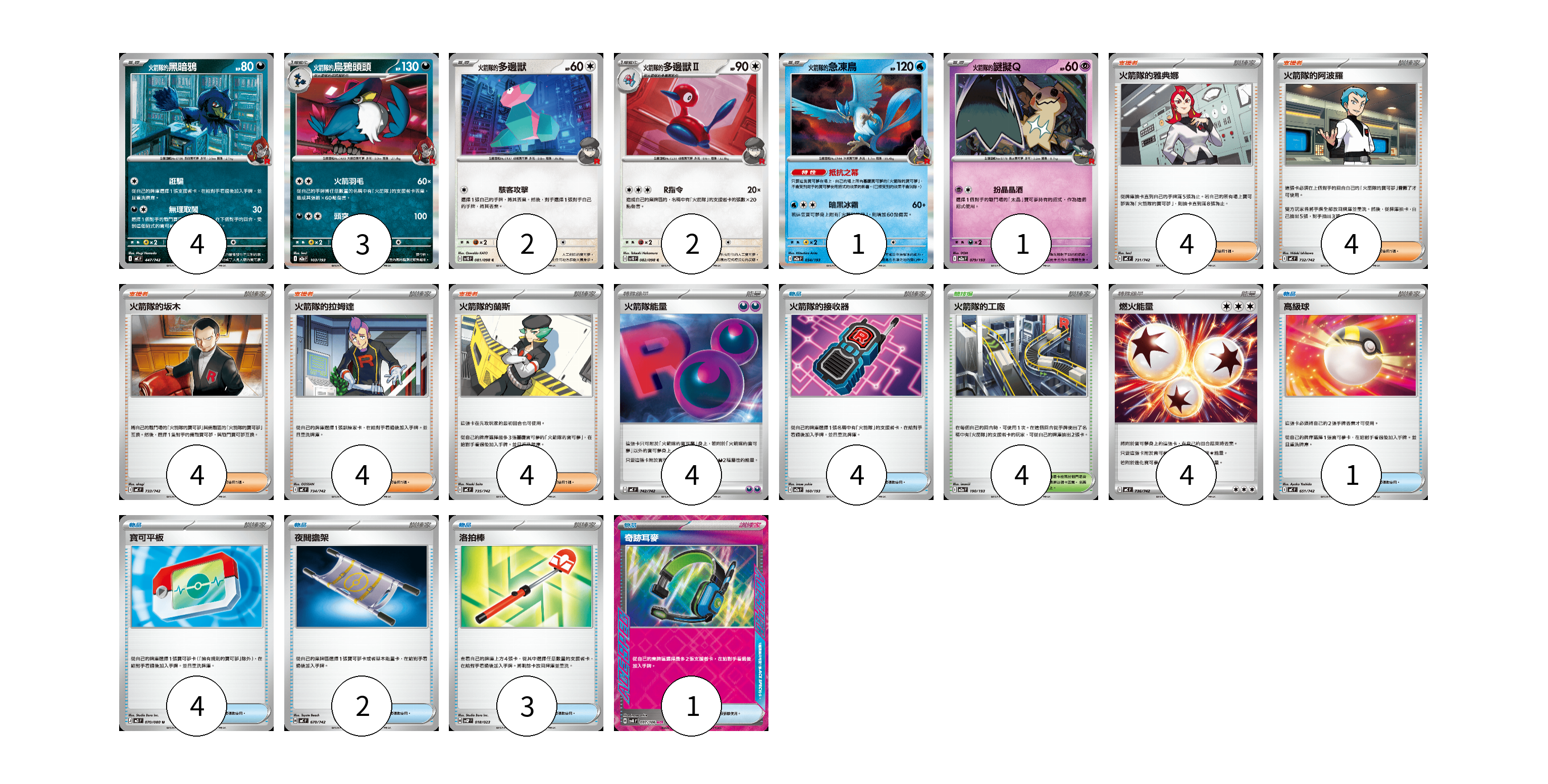 牌組構築方案 以此牌組為基礎新構築牌組 顯示卡面 顯示列表 寶可夢卡(13) 4 3 2 2 1 1 物品卡(15) 4 1 4 2 3 1 支援者卡(20) 4 4 4 4 4 競技場卡(4) 4 能量卡(8) 4 4 寶可夢卡(13) 卡牌名稱 張數 卡牌名稱 張數 <火箭隊的>黑暗鴉 MC 447/742 04 火箭隊的烏鴉頭頭 M2a 103/193 03 <火箭隊的>多邊獸 SV10 081/098 02 <火箭隊的>多邊獸Ⅱ SV10 082/098 02 <火箭隊的>急凍鳥 M2a 034/193 01 <火箭隊的>謎擬Q M2a 079/193 01 物品卡(15) 卡牌名稱 張數 卡牌名稱 張數 火箭隊的接收器 M2a 160/193 04 高級球 MC 651/742 01 寶可平板 M3 070/080 04 夜間擔架 MC 670/742 02 洛拍棒 SVQP 018/023 03 奇跡耳麥 SV8 097/106 01 支援者卡(20) 卡牌名稱 張數 卡牌名稱 張數 火箭隊的雅典娜 MC 731/742 04 火箭隊的阿波羅 MC 732/742 04 火箭隊的坂木 MC 733/742 04 火箭隊的拉姆達 MC 734/742 04 火箭隊的蘭斯 MC 735/742 04 競技場卡(4) 卡牌名稱 張數 卡牌名稱 張數 火箭隊的工廠 M2a 190/193 04 能量卡(8) 卡牌名稱 張數 卡牌名稱 張數 火箭隊能量 MC 742/742 04 燃火能量 MC 736/742 04 以此牌組為基礎新構築牌組 牌組編碼 cvpgBA-irsZeY-FRTCQG copy 列印牌組單 牌組編碼已複製 分享至SNS
