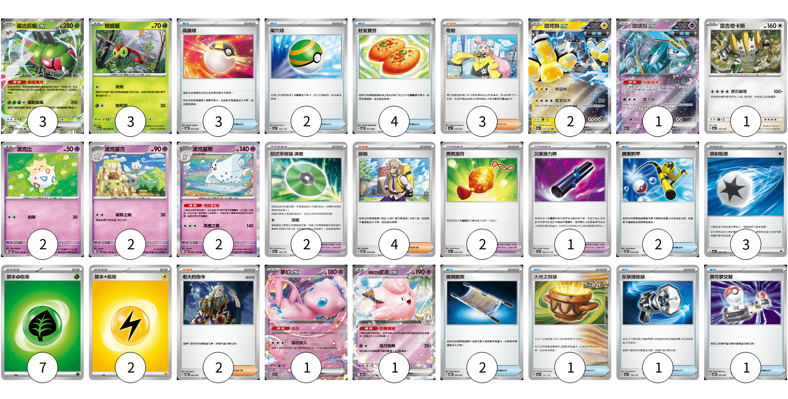 牌組構築方案 以此牌組為基礎新構築牌組 顯示卡面 顯示列表 寶可夢卡(18) 3 3 2 1 1 2 2 2 1 1 寶可夢道具(5) 2 2 1 物品卡(16) 3 2 4 2 2 1 1 1 支援者卡(9) 3 4 2 能量卡(12) 3 7 2 寶可夢卡(18) 卡牌名稱 張數 卡牌名稱 張數 遠古巨蜓ex SV9a 003/063 03 蜻蜻蜓 SV9a 002/063 03 鐵臂膀ex SV8a 054/187 02 鐵頭殼ex SV8a 078/187 01 雷吉奇卡斯 SV8a 132/187 01 波克比 SV8 045/106 02 波克基古 SV8 046/106 02 波克基斯 SV8 047/106 02 夢幻ex SVK 001/042 01 莉莉艾的皮皮ex SV9 033/100 01 寶可夢道具(5) 卡牌名稱 張數 卡牌名稱 張數 招式學習器 演進 SV8a 160/187 02 勇氣護符 SVK 024/042 02 沉重接力棒 SV5M 066/071 01 物品卡(16) 卡牌名稱 張數 卡牌名稱 張數 高級球 SVOM 013/021 03 巢穴球 SVM 133/175 02 好友寶芬 SVOD 011/020 04 厲害釣竿 SVOD 010/020 02 夜間擔架 SVOM 016/021 02 大地之容器 SV8a 143/187 01 反擊捕捉器 SV8a 139/187 01 寶可夢交替 SVOM 015/021 01 支援者卡(9) 卡牌名稱 張數 卡牌名稱 張數 奇樹 SVHK 019/022 03 派帕 SVOD 018/020 04 老大的指令 SVOM 020/021 02 能量卡(12) 卡牌名稱 張數 卡牌名稱 張數 噴射能量 SV8a 185/187 03 基本草能量 sv-p GRA 07 基本雷能量 sv-p LIG 02 以此牌組為基礎新構築牌組 牌組編碼 cwaQrv-tsuaam-GvbVEU copy 列印牌組單 牌組編碼已複製 分享至SNS