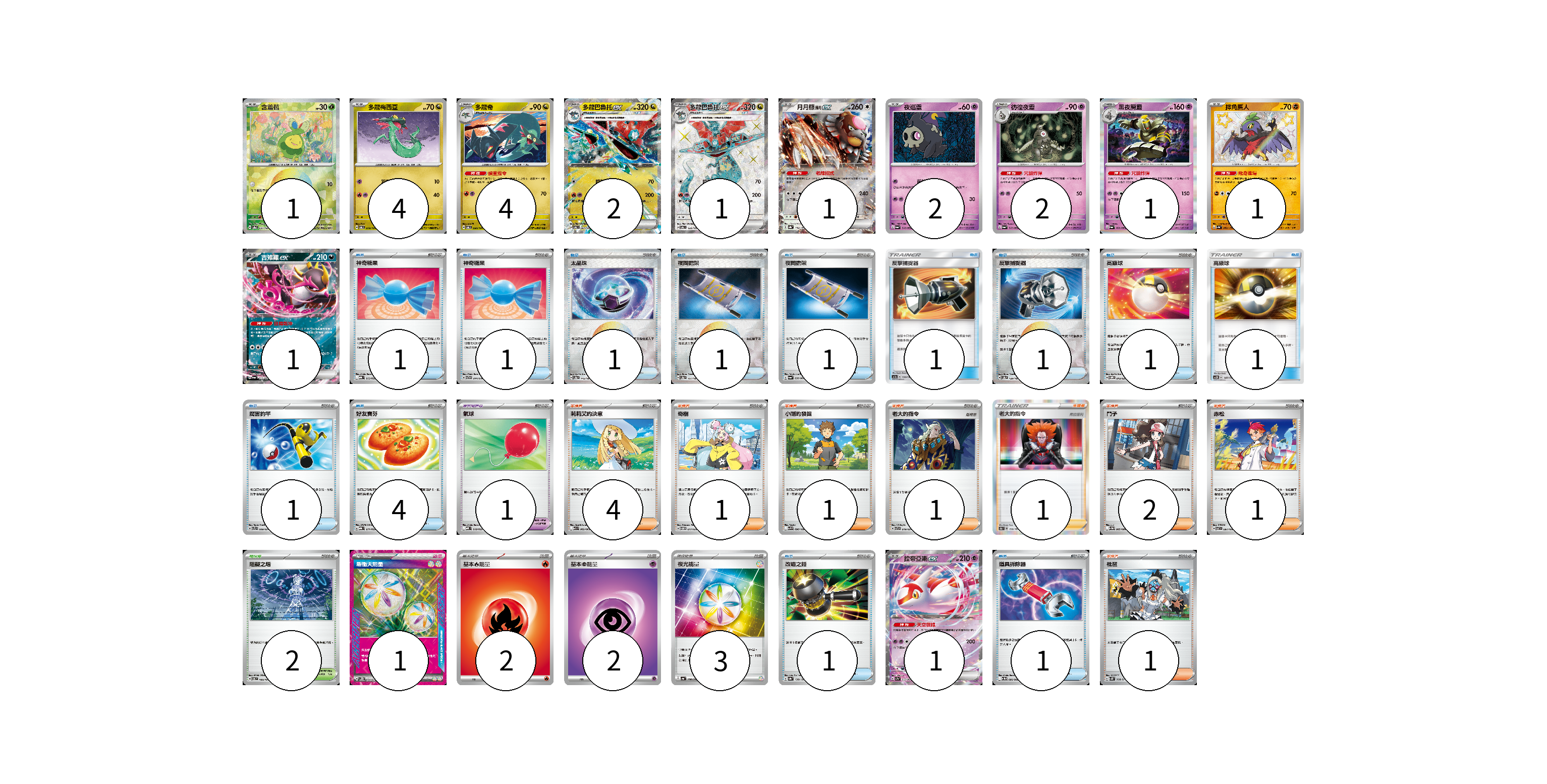 牌組構築方案 以此牌組為基礎新構築牌組 顯示卡面 顯示列表 寶可夢卡(21) 1 4 4 2 1 1 2 2 1 1 1 1 寶可夢道具(1) 1 物品卡(16) 1 1 1 1 1 1 1 1 1 1 4 1 1 支援者卡(12) 4 1 1 1 1 2 1 1 競技場卡(2) 2 能量卡(8) 1 2 2 3 寶可夢卡(21) 卡牌名稱 張數 卡牌名稱 張數 含羞苞 SV8a 001/187 01 多龍梅西亞 SV6 079/101 04 多龍奇 SV6 080/101 04 多龍巴魯托ex SV6 081/101 02 多龍巴魯托ex SV6 120/101 01 月月熊 赫月ex SV8a 134/187 01 夜巡靈 SV6a 018/064 02 彷徨夜靈 SV6a 019/064 02 黑夜魔靈 SV6a 020/064 01 摔角鷹人 SV4a 282/190 01 吉雉雞ex SV6a 038/064 01 拉帝亞斯ex SV7a 019/064 01 寶可夢道具(1) 卡牌名稱 張數 卡牌名稱 張數 氣球 MBD 018/022 01 物品卡(16) 卡牌名稱 張數 卡牌名稱 張數 神奇糖果 MBG 013/022 01 神奇糖果 SVTG 014/019 01 太晶珠 SV8a 145/187 01 夜間擔架 SV8a 151/187 01 夜間擔架 SV6a 056/064 01 反擊捕捉器 AC1a 130/158 01 反擊捕捉器 SV8a 139/187 01 高級球 SVOM 013/021 01 高級球 AC2D 147/176 01 厲害釣竿 SVTL 009/021 01 好友寶芬 MBG 011/022 04 改造之錘 SV8a 138/187 01 道具拆除器 SV11W 080/086 01 支援者卡(12) 卡牌名稱 張數 卡牌名稱 張數 莉莉艾的決意 M1L 062/063 04 奇樹 SVTM 017/022 01 小剛的發掘 SV9 096/100 01 老大的指令 SVTR 019/021 01 老大的指令(弗拉達利) S8b 158/184 01 鬥子 SV11W 085/086 02 赤松 SV7 097/102 01 枇琶 SV5K 068/071 01 競技場卡(2) 卡牌名稱 張數 卡牌名稱 張數 阻礙之塔 SV6 100/101 02 能量卡(8) 卡牌名稱 張數 卡牌名稱 張數 新衝天能量 SV5K 071/071 01 基本火能量 sv-p FIR 02 基本超能量 sv-p PSY 02 夜光能量 SV4a 190/190 03 以此牌組為基礎新構築牌組 牌組編碼 cwvUbV-YPRBeQ-tEvmle copy 列印牌組單 牌組編碼已複製 分享至SNS