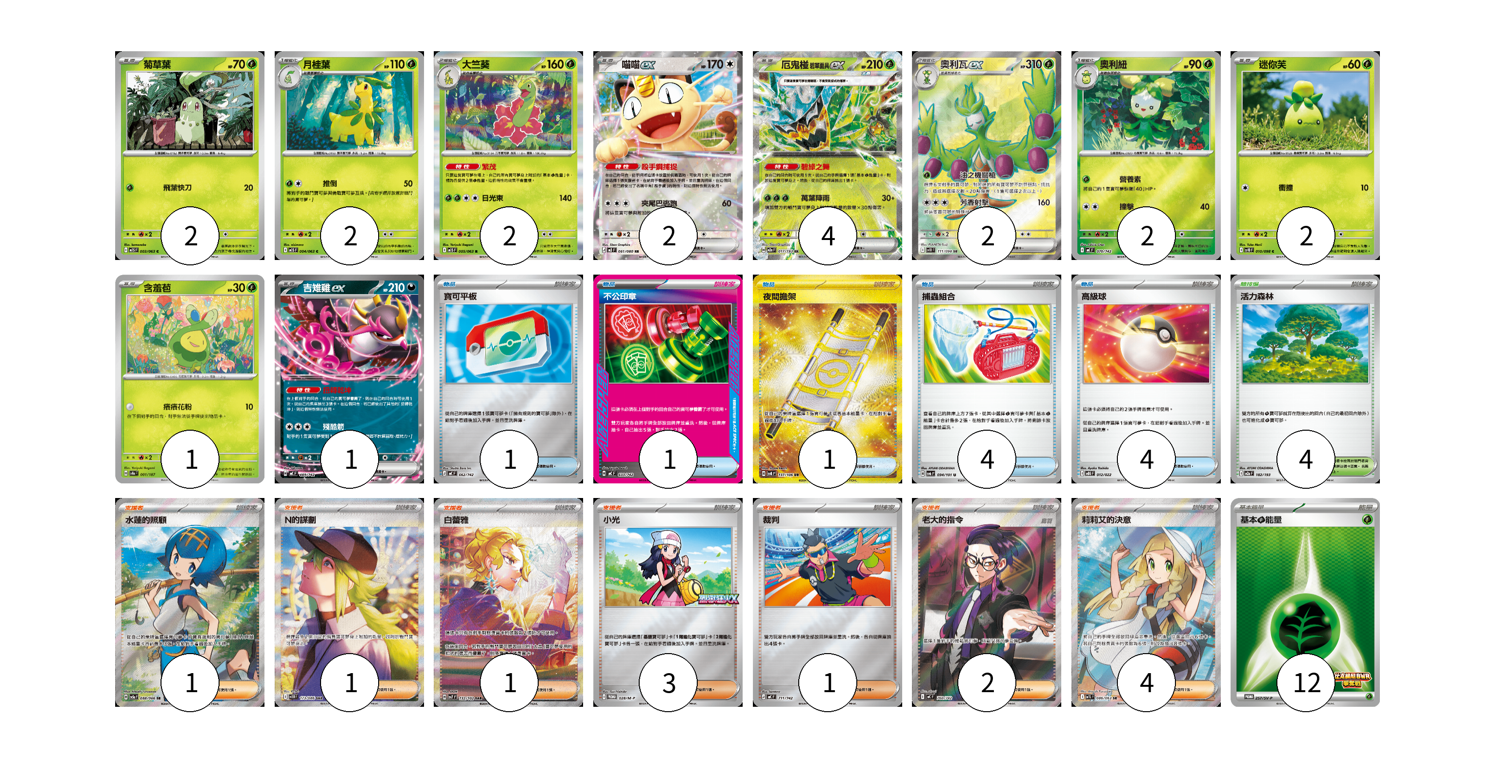 牌組構築方案 以此牌組為基礎新構築牌組 顯示卡面 顯示列表 寶可夢卡(20) 2 2 2 2 4 2 2 2 1 1 物品卡(11) 1 1 1 4 4 支援者卡(13) 1 1 1 3 1 2 4 競技場卡(4) 4 能量卡(12) 12 寶可夢卡(20) 卡牌名稱 張數 卡牌名稱 張數 菊草葉 M1S 003/063 02 月桂葉 M1S 004/063 02 大竺葵 M1S 005/063 02 喵喵ex M3 061/080 02 厄鬼椪 碧草面具ex M2a 017/193 04 奧利瓦ex SV10 111/098 02 奧利紐 MC 070/742 02 迷你芙 SV10 010/098 02 含羞苞 SV8a 001/187 01 吉雉雞ex MC 489/742 01 物品卡(11) 卡牌名稱 張數 卡牌名稱 張數 寶可平板 MC 662/742 01 不公印章 MC 633/742 01 夜間擔架 SV8 137/106 01 捕蟲組合 SV6 094/101 04 高級球 MBG 012/022 04 支援者卡(13) 卡牌名稱 張數 卡牌名稱 張數 水蓮的照顧 SV5a 088/066 01 N的謀劃 SV11B 173/086 01 白蕾雅 SV7 132/102 01 小光 M-P 028/M-P 03 裁判 MC 711/742 01 老大的指令(烏羽) MC 760/742 02 莉莉艾的決意 M1L 086/063 04 競技場卡(4) 卡牌名稱 張數 卡牌名稱 張數 活力森林 M2a 182/193 04 能量卡(12) 卡牌名稱 張數 卡牌名稱 張數 基本【草】能量 SV-P 257/SV-P 12 以此牌組為基礎新構築牌組 牌組編碼 cxZEyQ-PONjBj-WGFpAw copy 列印牌組單 牌組編碼已複製 分享至SNS