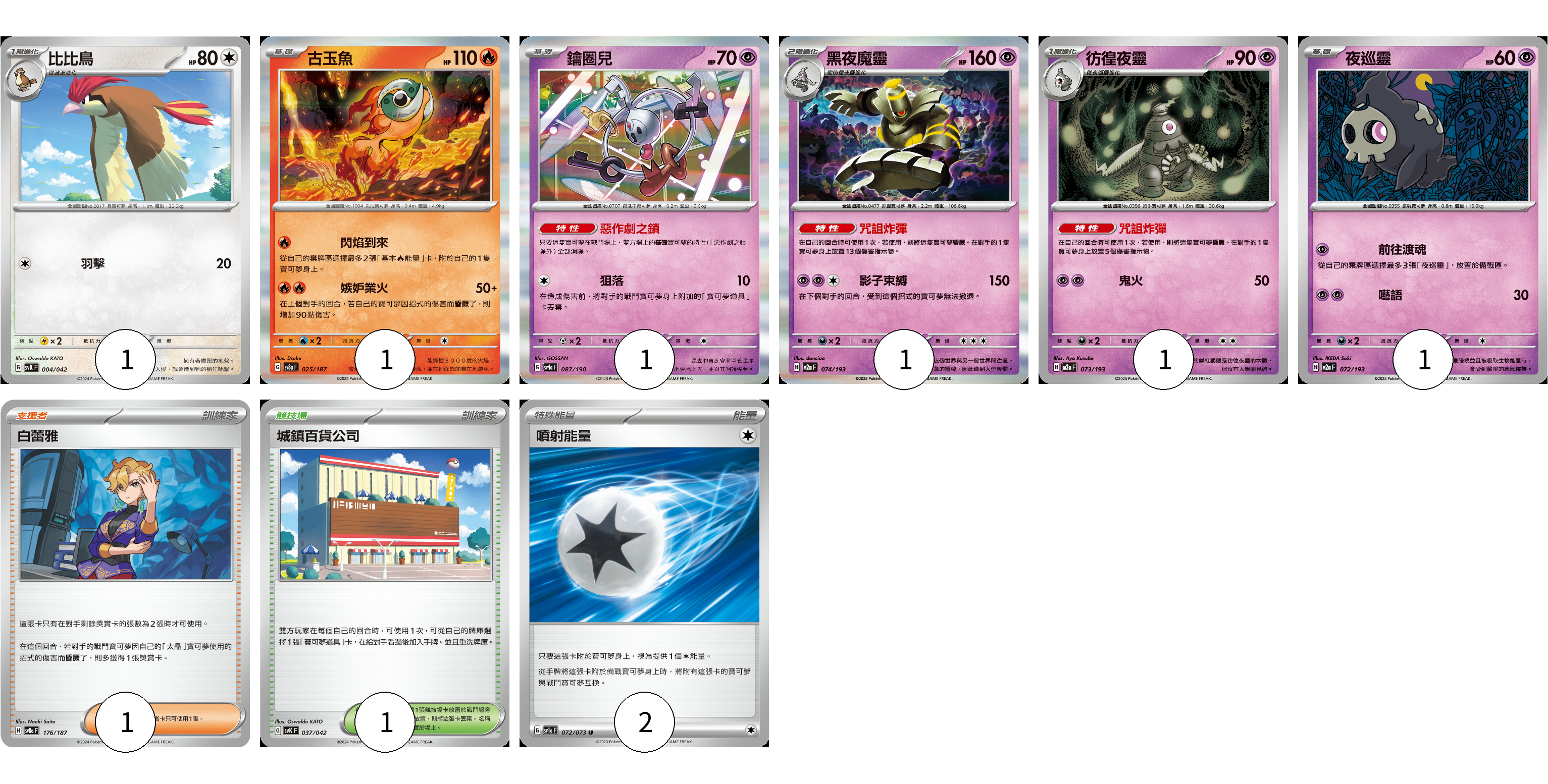 牌組構築方案 以此牌組為基礎新構築牌組 顯示卡面 顯示列表 寶可夢卡(6) 1 1 1 1 1 1 支援者卡(1) 1 競技場卡(1) 1 能量卡(2) 2 寶可夢卡(6) 卡牌名稱 張數 卡牌名稱 張數 比比鳥 SVK 004/042 01 古玉魚 SV8a 025/187 01 鑰圈兒 SV4a 087/190 01 黑夜魔靈 M2a 074/193 01 彷徨夜靈 M2a 073/193 01 夜巡靈 M2a 072/193 01 支援者卡(1) 卡牌名稱 張數 卡牌名稱 張數 白蕾雅 SV8a 176/187 01 競技場卡(1) 卡牌名稱 張數 卡牌名稱 張數 城鎮百貨公司 SVK 037/042 01 能量卡(2) 卡牌名稱 張數 卡牌名稱 張數 噴射能量 SV1a 072/073 02 以此牌組為基礎新構築牌組 牌組編碼 cyvNYU-lElOZO-PAfUBi copy 列印牌組單 牌組編碼已複製 分享至SNS