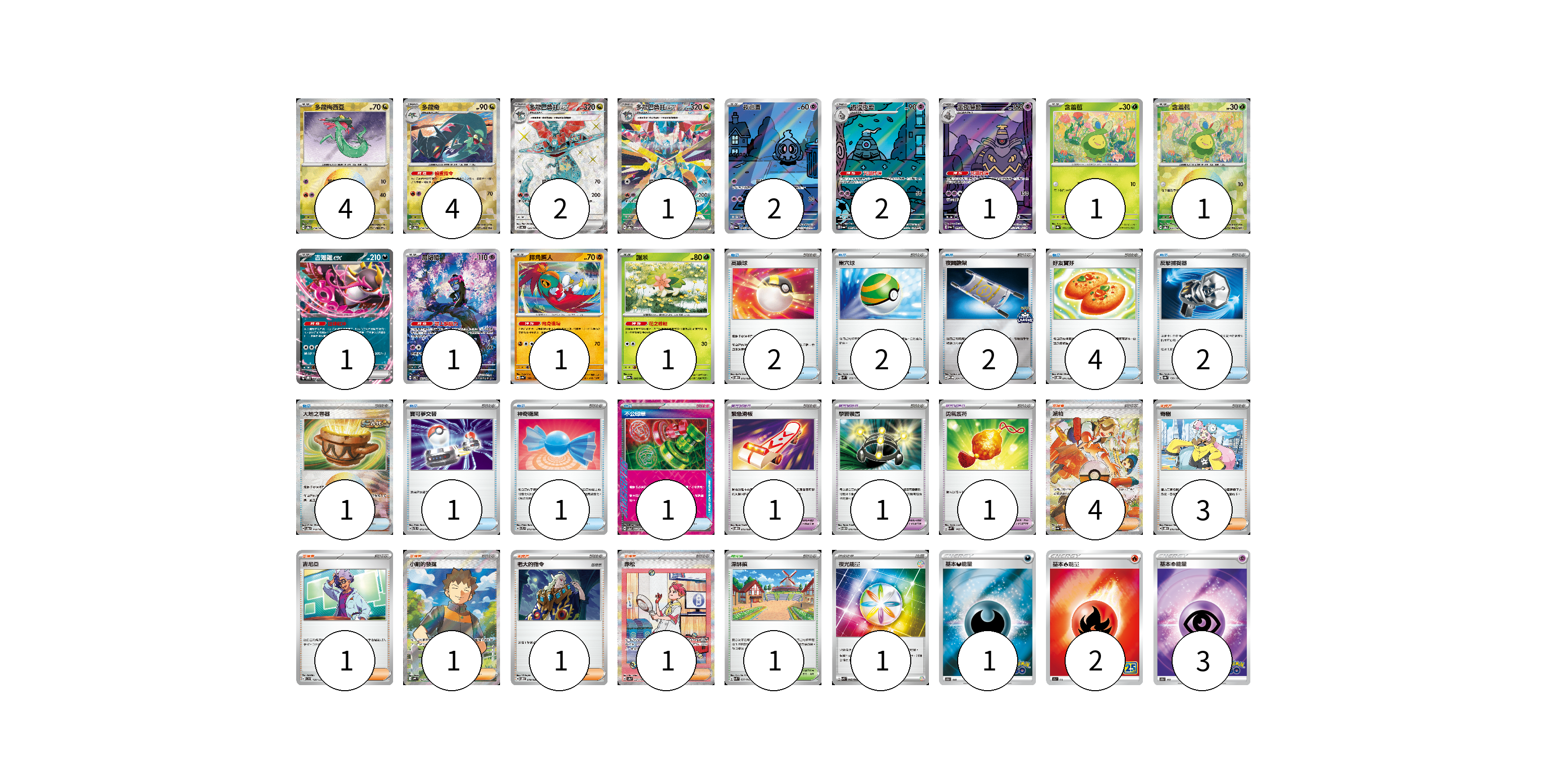 牌組構築方案 以此牌組為基礎新構築牌組 顯示卡面 顯示列表 寶可夢卡(22) 4 4 2 1 2 2 1 1 1 1 1 1 1 寶可夢道具(3) 1 1 1 物品卡(16) 2 2 2 4 2 1 1 1 1 支援者卡(11) 4 3 1 1 1 1 競技場卡(1) 1 能量卡(7) 1 1 2 3 寶可夢卡(22) 卡牌名稱 張數 卡牌名稱 張數 多龍梅西亞 SV8a 118/187 04 多龍奇 SV8a 119/187 04 多龍巴魯托ex SV6 120/101 02 多龍巴魯托ex SV8a 221/187 01 夜巡靈 SV6a 068/064 02 彷徨夜靈 SV6a 069/064 02 黑夜魔靈 SV6a 070/064 01 含羞苞 SV8a 001/187 01 含羞苞 SV8a 001/187 01 吉雉雞ex SVOD 004/020 01 願增猿 SV6 107/101 01 摔角鷹人 SV4a 106/190 01 謝米 SV9a 006/063 01 寶可夢道具(3) 卡牌名稱 張數 卡牌名稱 張數 緊急滑板 SVOD 015/020 01 學習裝置 SVTM 016/022 01 勇氣護符 SVM 142/175 01 物品卡(16) 卡牌名稱 張數 卡牌名稱 張數 高級球 SVOD 012/020 02 巢穴球 SVM 133/175 02 夜間擔架 SV-P 204/SV-P 02 好友寶芬 SVOD 011/020 04 反擊捕捉器 SV8a 139/187 02 大地之容器 SV8a 143/187 01 寶可夢交替 SVTL 015/021 01 神奇糖果 SVTL 013/021 01 不公印章 SV5a 053/066 01 支援者卡(11) 卡牌名稱 張數 卡牌名稱 張數 派帕 SV4a 353/190 04 奇樹 SVOD 016/020 03 吉尼亞 SVD 129/139 01 小剛的發掘 SV9 123/100 01 老大的指令 SVOD 019/020 01 赤松 SV8a 227/187 01 競技場卡(1) 卡牌名稱 張數 卡牌名稱 張數 深缽鎮 SVK 039/042 01 能量卡(7) 卡牌名稱 張數 卡牌名稱 張數 夜光能量 SVK 042/042 01 基本惡能量 S10b DAR 01 基本火能量 S8a FIR 02 基本超能量 S10b PSY 03 以此牌組為基礎新構築牌組 牌組編碼 dApAQM-WBOyrL-OmSoue copy 列印牌組單 牌組編碼已複製 分享至SNS