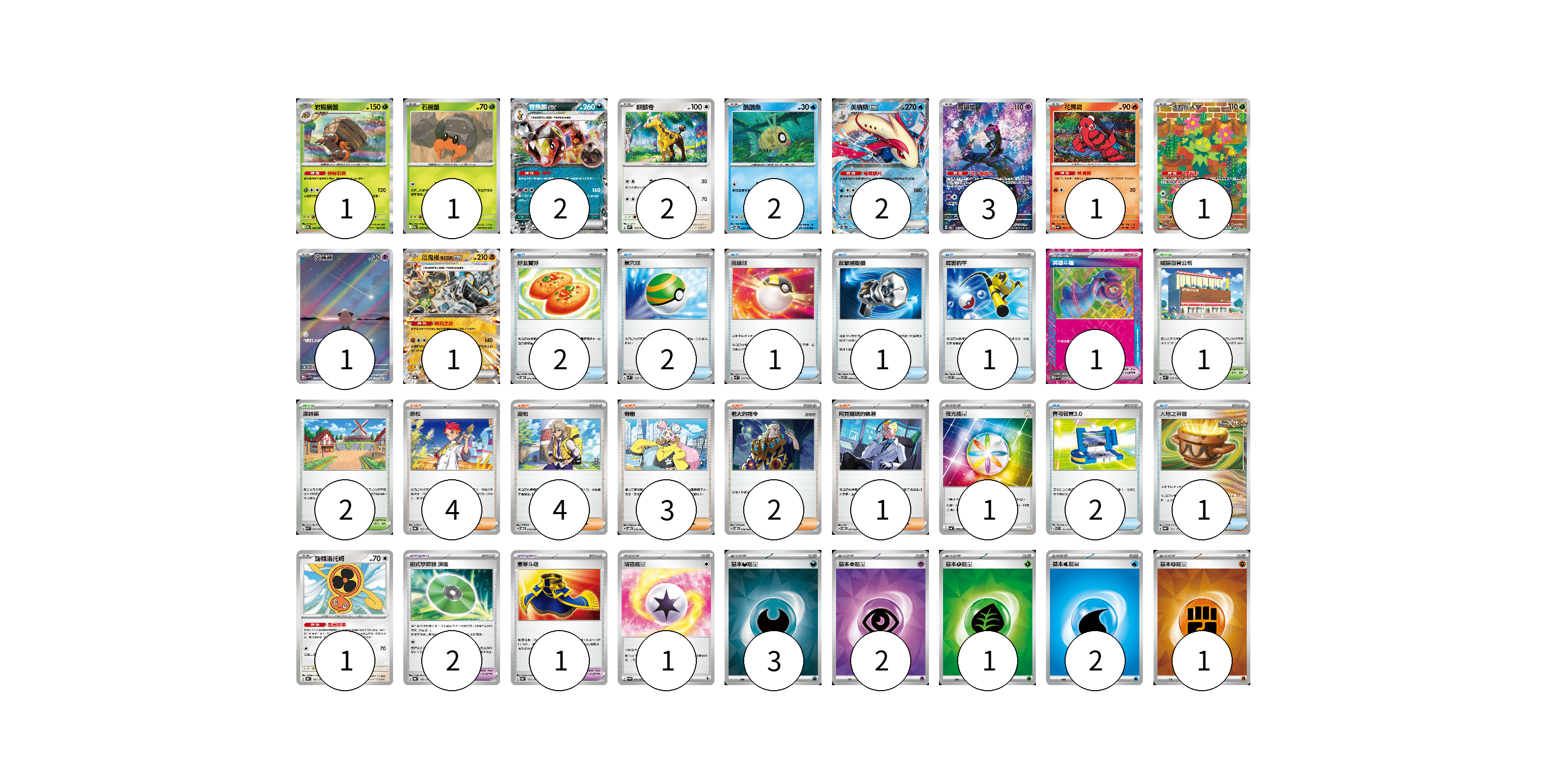 牌組構築方案 以此牌組為基礎新構築牌組 顯示卡面 顯示列表 寶可夢卡(18) 1 1 2 2 2 2 3 1 1 1 1 1 寶可夢道具(4) 1 2 1 物品卡(10) 2 2 1 1 1 2 1 支援者卡(14) 4 4 3 2 1 競技場卡(3) 1 2 能量卡(11) 1 1 3 2 1 2 1 寶可夢卡(18) 卡牌名稱 張數 卡牌名稱 張數 岩殿居蟹 SV9a 008/063 01 石居蟹 SV9a 007/063 01 奇麒麟ex SV5M 042/071 02 麒麟奇 SV2D 059/071 02 醜醜魚 SV8 025/106 02 美納斯ex SV8 026/106 02 願增猿 SV6 107/101 03 花舞鳥 SV4a 029/190 01 沙鈴仙人掌 SV9 101/100 01 皮寶寶 SV3 113/108 01 厄鬼椪 礎石面具ex SV8a 091/187 01 旋轉洛托姆 SV8a 131/187 01 寶可夢道具(4) 卡牌名稱 張數 卡牌名稱 張數 英雄斗篷 SV5M 064/071 01 招式學習器 演進 SV8a 160/187 02 豪華斗篷 SV8a 155/187 01 物品卡(10) 卡牌名稱 張數 卡牌名稱 張數 好友寶芬 SVOD 011/020 02 巢穴球 SVM 133/175 02 高級球 SVK 018/042 01 反擊捕捉器 SVTS 009/022 01 厲害釣竿 SVTS 010/022 01 寶可裝置3.0 SVEL 014/020 02 大地之容器 SV8a 143/187 01 支援者卡(14) 卡牌名稱 張數 卡牌名稱 張數 赤松 SV8a 163/187 04 派帕 SVOD 018/020 04 奇樹 SVOD 016/020 03 老大的指令 SVOD 019/020 02 阿克羅瑪的執著 SVOM 017/021 01 競技場卡(3) 卡牌名稱 張數 卡牌名稱 張數 城鎮百貨公司 SVK 037/042 01 深缽鎮 SVK 039/042 02 能量卡(11) 卡牌名稱 張數 卡牌名稱 張數 夜光能量 SV4a 190/190 01 薄霧能量 SV5M 071/071 01 基本【惡】能量 SVOM DAR 03 基本【超】能量 SVOD PSY 02 基本【草】能量 SVK GRA 01 基本【水】能量 SVD WAT 02 基本【鬥】能量 SVK FIG 01 以此牌組為基礎新構築牌組 牌組編碼 dChtFX-MBpIAK-PtLugS copy 列印牌組單 牌組編碼已複製 分享至SNS