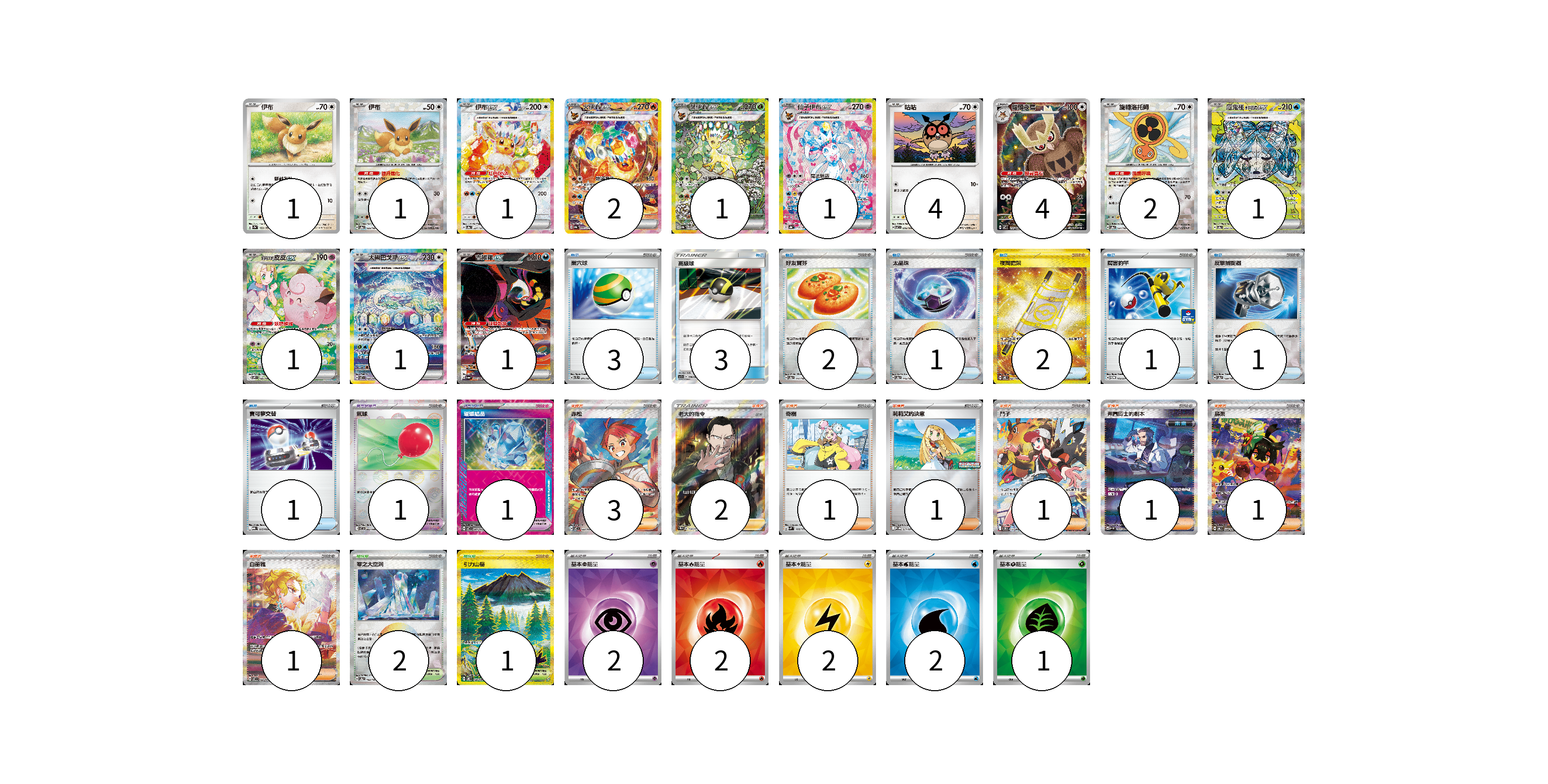 牌組構築方案 以此牌組為基礎新構築牌組 顯示卡面 顯示列表 寶可夢卡(21) 1 1 1 2 1 1 4 4 2 1 1 1 1 寶可夢道具(2) 1 1 物品卡(14) 3 3 2 1 2 1 1 1 支援者卡(11) 3 2 1 1 1 1 1 1 競技場卡(3) 2 1 能量卡(9) 2 2 2 2 1 寶可夢卡(21) 卡牌名稱 張數 卡牌名稱 張數 伊布 SV2a 133/165 01 伊布 SV8a 125/187 01 伊布ex SV8a 224/187 01 火伊布ex SV8a 202/187 02 葉伊布ex SV8a 200/187 01 仙子伊布ex SV8a 212/187 01 咕咕 SV7 076/102 04 貓頭夜鷹 SV7 114/102 04 旋轉洛托姆 SV8a 131/187 02 厄鬼椪 水井面具ex SV8a 208/187 01 莉莉艾的皮皮ex SV9 126/100 01 太樂巴戈斯ex SV7 130/102 01 吉雉雞ex SV6a 089/064 01 寶可夢道具(2) 卡牌名稱 張數 卡牌名稱 張數 氣球 SV11B 082/086 01 璀璨結晶 SV7 094/102 01 物品卡(14) 卡牌名稱 張數 卡牌名稱 張數 巢穴球 SVTL 011/021 03 高級球 AS5b 178/186 03 好友寶芬 SV8a 147/187 02 太晶珠 SV8a 145/187 01 夜間擔架 SV8 137/106 02 厲害釣竿 SV-P 112/SV-P 01 反擊捕捉器 SV8a 139/187 01 寶可夢交替 MBG 015/022 01 支援者卡(11) 卡牌名稱 張數 卡牌名稱 張數 赤松 SV7 123/102 03 老大的指令(坂木) SC1b 170/153 02 奇樹 SVM 160/175 01 莉莉艾的決意 M-P 011/M-P 01 鬥子 SV11W 173/086 01 弗圖博士的劇本 SV4M 091/066 01 烏栗 SV6 129/101 01 白蕾雅 SV7 132/102 01 競技場卡(3) 卡牌名稱 張數 卡牌名稱 張數 零之大空洞 SV8a 182/187 02 引力山岳 SV8 138/106 01 能量卡(9) 卡牌名稱 張數 卡牌名稱 張數 基本【超】能量 SVK PSY 02 基本【火】能量 SVQL FIR 02 基本【雷】能量 SVM LIG 02 基本【水】能量 SVK WAT 02 基本【草】能量 SVK GRA 01 以此牌組為基礎新構築牌組 牌組編碼 dDjRuA-PCwlrK-XUDowZ copy 列印牌組單 牌組編碼已複製 分享至SNS