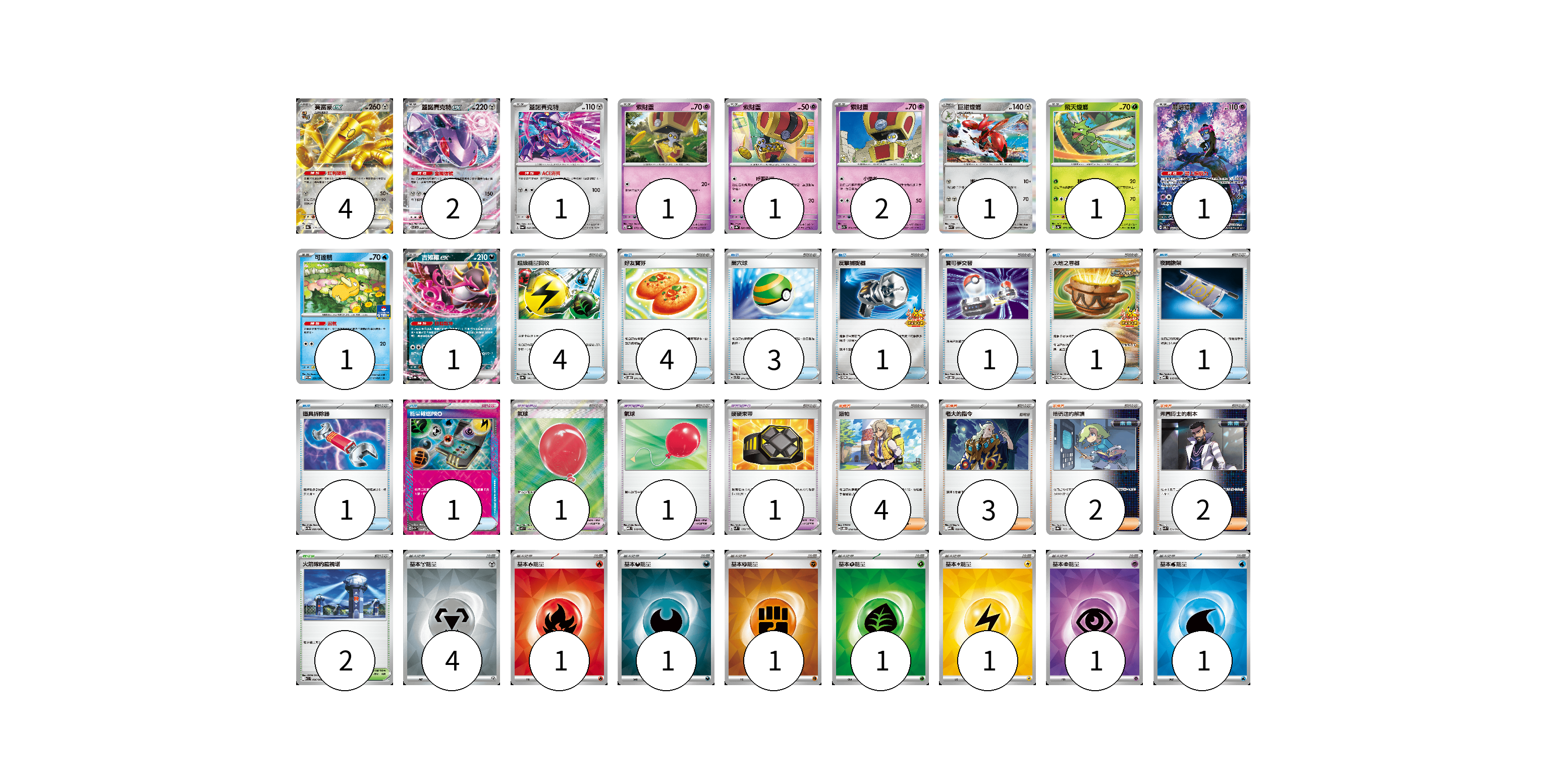 牌組構築方案 以此牌組為基礎新構築牌組 顯示卡面 顯示列表 寶可夢卡(16) 4 2 1 1 1 2 1 1 1 1 1 寶可夢道具(3) 1 1 1 物品卡(17) 4 4 3 1 1 1 1 1 1 支援者卡(11) 4 3 2 2 競技場卡(2) 2 能量卡(11) 4 1 1 1 1 1 1 1 寶可夢卡(16) 卡牌名稱 張數 卡牌名稱 張數 賽富豪ex SV8a 117/187 04 蓋諾賽克特ex SV11B 069/086 02 蓋諾賽克特 SV6a 040/064 01 索財靈 SV8a 073/187 01 索財靈 SV3a 020/062 01 索財靈 SV7a 024/064 02 巨鉗螳螂 SV3 077/108 01 飛天螳螂 SV2a 123/165 01 願增猿 SV6 107/101 01 可達鴨 SV-P 220/SV-P 01 吉雉雞ex SV8a 104/187 01 寶可夢道具(3) 卡牌名稱 張數 卡牌名稱 張數 氣球 M1L 084/063 01 氣球 MBD 018/022 01 硬硬束帶 SVM 139/175 01 物品卡(17) 卡牌名稱 張數 卡牌名稱 張數 超級能量回收 SV8a 141/187 04 好友寶芬 SVOD 011/020 04 巢穴球 SVTL 011/021 03 反擊捕捉器 SV-P 083/SV-P 01 寶可夢交替 SVOD 014/020 01 大地之容器 SV-P 084/SV-P 01 夜間擔架 MBD 016/022 01 道具拆除器 SV11W 080/086 01 能量輸送PRO SV7a 052/064 01 支援者卡(11) 卡牌名稱 張數 卡牌名稱 張數 派帕 SVOD 018/020 04 老大的指令 MBD 020/022 03 暗碼迷的解讀 SV8a 165/187 02 弗圖博士的劇本 SVK 034/042 02 競技場卡(2) 卡牌名稱 張數 卡牌名稱 張數 火箭隊的監視塔 SV10 096/098 02 能量卡(11) 卡牌名稱 張數 卡牌名稱 張數 基本【鋼】能量 SVOD MET 04 基本【火】能量 SVQL FIR 01 基本【惡】能量 SVK DAR 01 基本【鬥】能量 SVK FIG 01 基本【草】能量 SVK GRA 01 基本【雷】能量 SVK LIG 01 基本【超】能量 SVK PSY 01 基本【水】能量 SVK WAT 01 以此牌組為基礎新構築牌組 牌組編碼 dDnrHW-xOZAav-NIXRMK copy 列印牌組單 牌組編碼已複製 分享至SNS