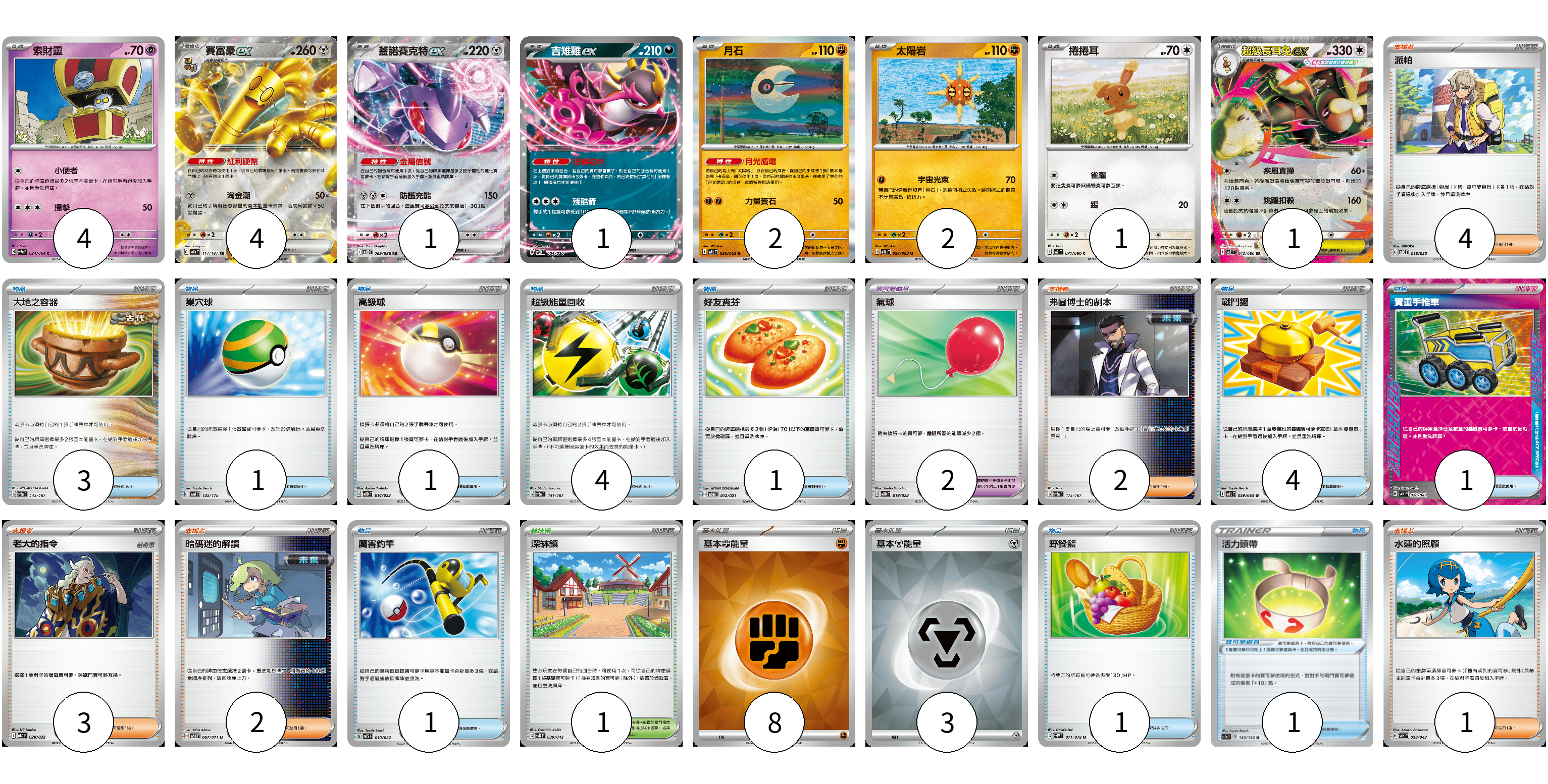 牌組構築方案 以此牌組為基礎新構築牌組 顯示卡面 顯示列表 寶可夢卡(16) 4 4 1 1 2 2 1 1 寶可夢道具(3) 2 1 物品卡(17) 3 1 1 4 1 4 1 1 1 支援者卡(12) 4 2 3 2 1 競技場卡(1) 1 能量卡(11) 8 3 寶可夢卡(16) 卡牌名稱 張數 卡牌名稱 張數 索財靈 SV7a 024/064 04 賽富豪ex SV8a 117/187 04 蓋諾賽克特ex SV11B 069/086 01 吉雉雞ex SVOD 004/020 01 月石 M1L 026/063 02 太陽岩 M1L 027/063 02 捲捲耳 M2 071/080 01 超級長耳兔ex M2 072/080 01 寶可夢道具(3) 卡牌名稱 張數 卡牌名稱 張數 氣球 MBD 018/022 02 活力頭帶 SC1a 143/154 01 物品卡(17) 卡牌名稱 張數 卡牌名稱 張數 大地之容器 SV8a 143/187 03 巢穴球 SVM 133/175 01 高級球 MBD 014/022 01 超級能量回收 SV8a 141/187 04 好友寶芬 SVOM 012/021 01 戰鬥鑼 M1L 059/063 04 貴重手推車 SVK 020/042 01 厲害釣竿 SVTS 010/022 01 野餐籃 SV1V 071/078 01 支援者卡(12) 卡牌名稱 張數 卡牌名稱 張數 派帕 SVOD 018/020 04 弗圖博士的劇本 SV8a 175/187 02 老大的指令 MBD 020/022 03 暗碼迷的解讀 SV5M 067/071 02 水蓮的照顧 SVK 028/042 01 競技場卡(1) 卡牌名稱 張數 卡牌名稱 張數 深缽鎮 SVK 039/042 01 能量卡(11) 卡牌名稱 張數 卡牌名稱 張數 基本【鬥】能量 SVM FIG 08 基本【鋼】能量 SVOD MET 03 以此牌組為基礎新構築牌組 牌組編碼 dDtLRA-SmJrGU-AtXJVy copy 列印牌組單 牌組編碼已複製 分享至SNS