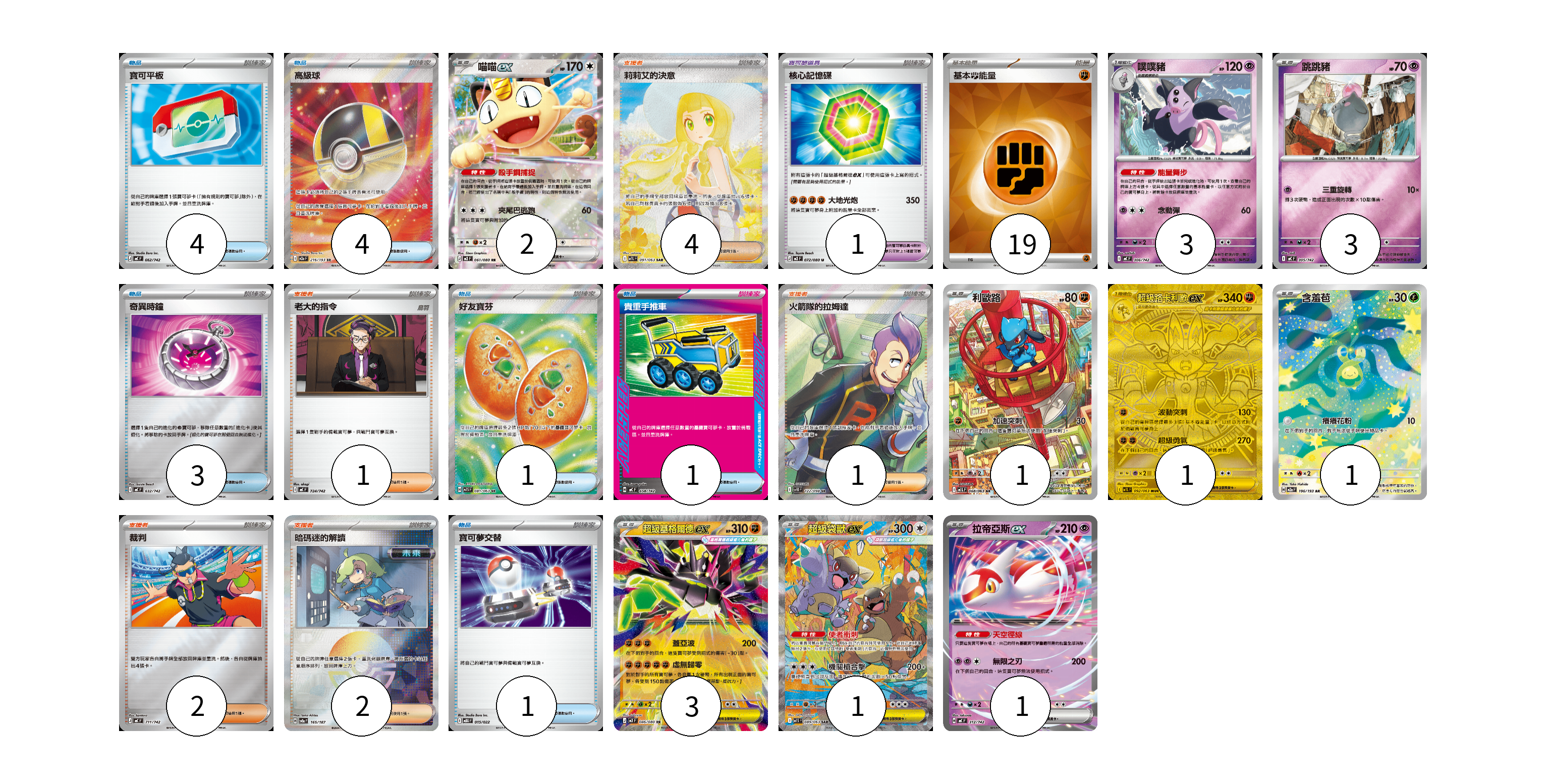 牌組構築方案 以此牌組為基礎新構築牌組 顯示卡面 顯示列表 寶可夢卡(16) 2 3 3 1 1 1 3 1 1 寶可夢道具(1) 1 物品卡(14) 4 4 3 1 1 1 支援者卡(10) 4 1 1 2 2 能量卡(19) 19 寶可夢卡(16) 卡牌名稱 張數 卡牌名稱 張數 喵喵ex M3 061/080 02 噗噗豬 MC 306/742 03 跳跳豬 MC 305/742 03 利歐路 M1L 068/063 01 超級路卡利歐ex M1L 092/063 01 含羞苞 M2a 196/193 01 超級基格爾德ex M3 046/080 03 超級袋獸ex M1S 089/063 01 拉帝亞斯ex MC 312/742 01 寶可夢道具(1) 卡牌名稱 張數 卡牌名稱 張數 核心記憶碟 M3 072/080 01 物品卡(14) 卡牌名稱 張數 卡牌名稱 張數 寶可平板 MC 662/742 04 高級球 M2a 216/193 04 奇異時鐘 MC 632/742 03 好友寶芬 M1S 081/063 01 貴重手推車 MC 658/742 01 寶可夢交替 MBG 015/022 01 支援者卡(10) 卡牌名稱 張數 卡牌名稱 張數 莉莉艾的決意 M1L 091/063 04 老大的指令 MC 724/742 01 火箭隊的拉姆達 SV10 122/098 01 裁判 MC 711/742 02 暗碼迷的解讀 SV8a 165/187 02 能量卡(19) 卡牌名稱 張數 卡牌名稱 張數 基本【鬥】能量 SVM FIG 19 以此牌組為基礎新構築牌組 牌組編碼 dEhXft-yUZtJq-xfPBJq copy 列印牌組單 牌組編碼已複製 分享至SNS
