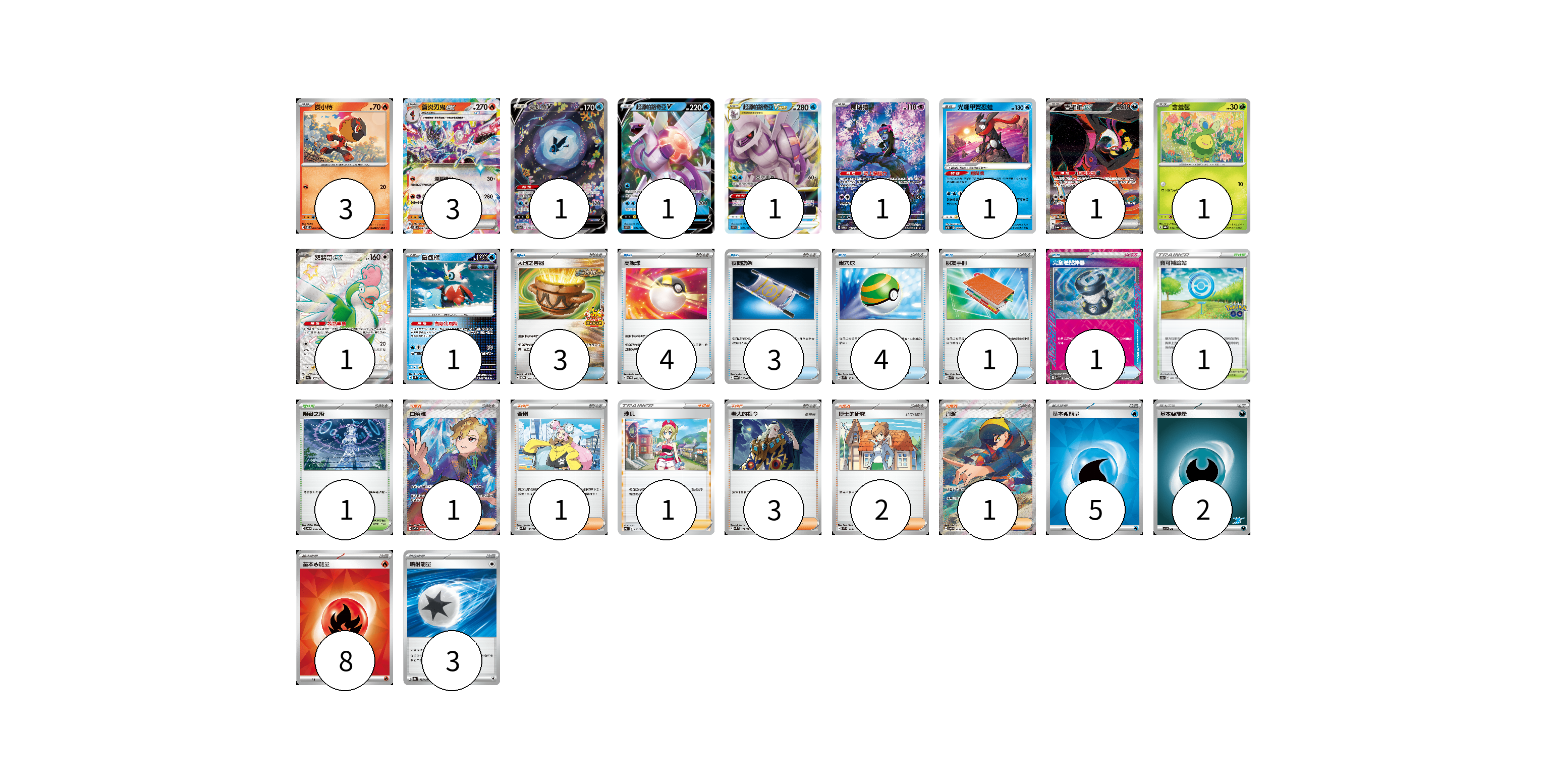 牌組構築方案 以此牌組為基礎新構築牌組 顯示卡面 顯示列表 寶可夢卡(15) 3 3 1 1 1 1 1 1 1 1 1 物品卡(16) 3 4 3 4 1 1 支援者卡(9) 1 1 1 3 2 1 競技場卡(2) 1 1 能量卡(18) 5 2 8 3 寶可夢卡(15) 卡牌名稱 張數 卡牌名稱 張數 炭小侍 SVPS 005/008 03 蒼炎刃鬼ex SVPS 006/008 03 霓虹魚V S12a 216/172 01 起源帕路奇亞V S10P 022/067 01 起源帕路奇亞VSTAR S10P 023/067 01 願增猿 SV6 107/101 01 光輝甲賀忍蛙 SVTG 002/019 01 吉雉雞ex SV6a 089/064 01 含羞苞 SV8a 001/187 01 怒鸚哥ex SV4a 337/190 01 鐵包袱 SV4M 020/066 01 物品卡(16) 卡牌名稱 張數 卡牌名稱 張數 大地之容器 SV-P 084/SV-P 03 高級球 SVTG 013/019 04 夜間擔架 SV6a 056/064 03 巢穴球 SVM 133/175 04 朋友手冊 SVK 014/042 01 完全體攪拌器 SVK 017/042 01 支援者卡(9) 卡牌名稱 張數 卡牌名稱 張數 白蕾雅 SV7 126/102 01 奇樹 SVM 160/175 01 珠貝 SVF 025/038 01 老大的指令 SVM 172/175 03 博士的研究 SVM 166/175 02 丹瑜 SV6 123/101 01 競技場卡(2) 卡牌名稱 張數 卡牌名稱 張數 寶可補給站 S10b 071/071 01 阻礙之塔 SV6 100/101 01 能量卡(18) 卡牌名稱 張數 卡牌名稱 張數 基本【水】能量 SVK WAT 05 基本【惡】能量 SVI DAR 02 基本【火】能量 SVK FIR 08 噴射能量 SV8a 185/187 03 以此牌組為基礎新構築牌組 牌組編碼 dFOmba-ghhfYx-kIzzWN copy 列印牌組單 牌組編碼已複製 分享至SNS