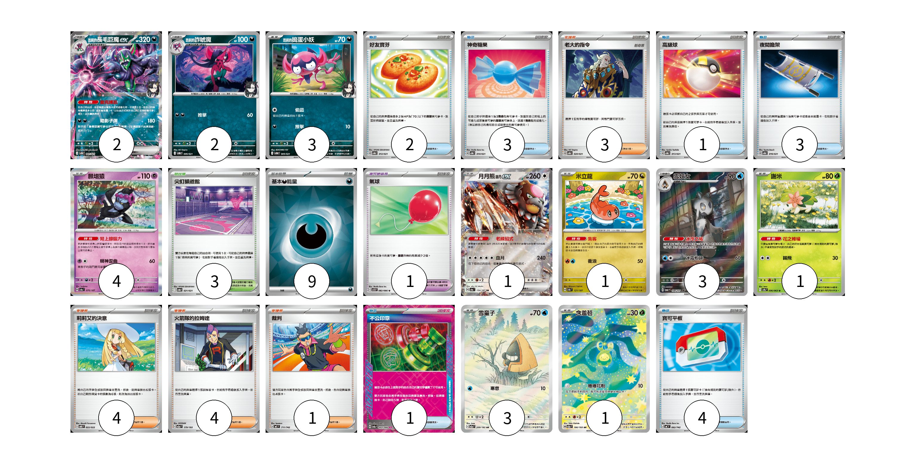 牌組構築方案 以此牌組為基礎新構築牌組 顯示卡面 顯示列表 寶可夢卡(21) 2 2 3 4 1 1 3 1 3 1 寶可夢道具(1) 1 物品卡(14) 2 3 1 3 1 4 支援者卡(12) 3 4 4 1 競技場卡(3) 3 能量卡(9) 9 寶可夢卡(21) 卡牌名稱 張數 卡牌名稱 張數 <瑪俐的>長毛巨魔ex SVOM 007/021 02 <瑪俐的>詐唬魔 SVOM 006/021 02 <瑪俐的>搗蛋小妖 SVOM 005/021 03 願增猿 SV8a 075/187 04 月月熊 赫月ex SV8a 134/187 01 米立龍 SV8a 121/187 01 雪妖女 SV6 104/101 03 謝米 SV9a 006/063 01 雪童子 M2a 200/193 03 含羞苞 M2a 196/193 01 寶可夢道具(1) 卡牌名稱 張數 卡牌名稱 張數 氣球 SV11B 082/086 01 物品卡(14) 卡牌名稱 張數 卡牌名稱 張數 好友寶芬 SVOM 012/021 02 神奇糖果 SVOM 014/021 03 高級球 SVOM 013/021 01 夜間擔架 SVOM 016/021 03 不公印章 SV5a 053/066 01 寶可平板 MC 662/742 04 支援者卡(12) 卡牌名稱 張數 卡牌名稱 張數 老大的指令 SVOM 020/021 03 莉莉艾的決意 MBG 022/022 04 火箭隊的拉姆達 M2a 179/193 04 裁判 MC 711/742 01 競技場卡(3) 卡牌名稱 張數 卡牌名稱 張數 尖釘鎮道館 SVOM 021/021 03 能量卡(9) 卡牌名稱 張數 卡牌名稱 張數 基本【惡】能量 SVK DAR 09 以此牌組為基礎新構築牌組 牌組編碼 dHxwZp-vBxZTg-OBCeiF copy 列印牌組單 牌組編碼已複製 分享至SNS