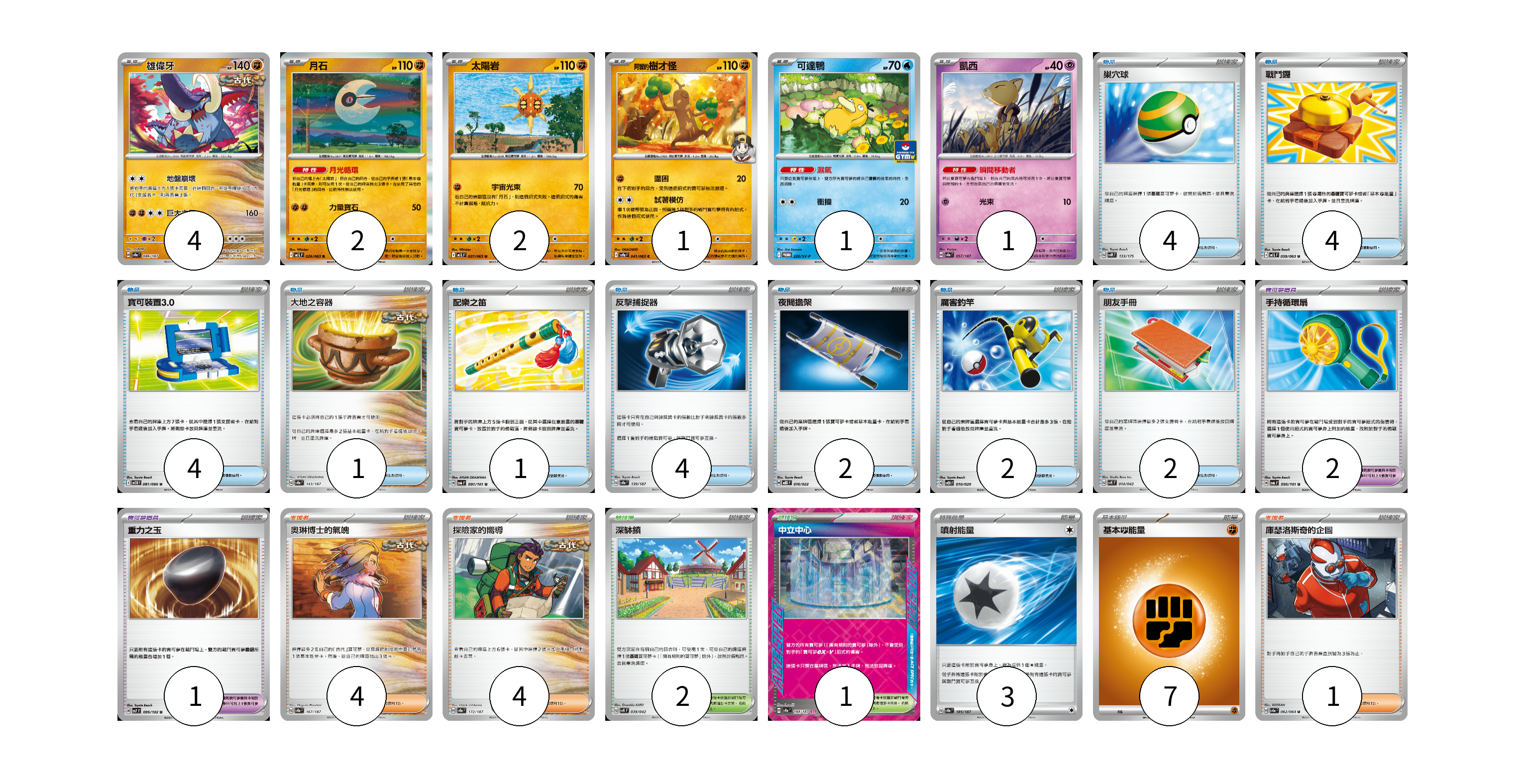 牌組構築方案 以此牌組為基礎新構築牌組 顯示卡面 顯示列表 寶可夢卡(11) 4 2 2 1 1 1 寶可夢道具(3) 2 1 物品卡(24) 4 4 4 1 1 4 2 2 2 支援者卡(9) 4 4 1 競技場卡(3) 2 1 能量卡(10) 3 7 寶可夢卡(11) 卡牌名稱 張數 卡牌名稱 張數 雄偉牙 SV8a 086/187 04 月石 M1L 026/063 02 太陽岩 M1L 027/063 02 <阿響的>樹才怪 SV9a 041/063 01 可達鴨 SV-P 220/SV-P 01 凱西 SV8a 057/187 01 寶可夢道具(3) 卡牌名稱 張數 卡牌名稱 張數 手持循環扇 SV6 095/101 02 重力之玉 SV7 095/102 01 物品卡(24) 卡牌名稱 張數 卡牌名稱 張數 巢穴球 SVM 133/175 04 戰鬥鑼 M1L 059/063 04 寶可裝置3.0 SV11B 081/086 04 大地之容器 SV8a 143/187 01 配樂之笛 SV6 091/101 01 反擊捕捉器 SV8a 139/187 04 夜間擔架 MBD 016/022 02 厲害釣竿 SVOD 010/020 02 朋友手冊 SVK 014/042 02 支援者卡(9) 卡牌名稱 張數 卡牌名稱 張數 奧琳博士的氣魄 SV8a 167/187 04 探險家的嚮導 SV8a 172/187 04 庫瑟洛斯奇的企圖 SV6a 062/064 01 競技場卡(3) 卡牌名稱 張數 卡牌名稱 張數 深缽鎮 SVK 039/042 02 中立中心 SV8a 184/187 01 能量卡(10) 卡牌名稱 張數 卡牌名稱 張數 噴射能量 SV8a 185/187 03 基本【鬥】能量 M-P FIG 07 以此牌組為基礎新構築牌組 牌組編碼 dJDowx-BZfHZO-SqxiJB copy 列印牌組單 牌組編碼已複製 分享至SNS