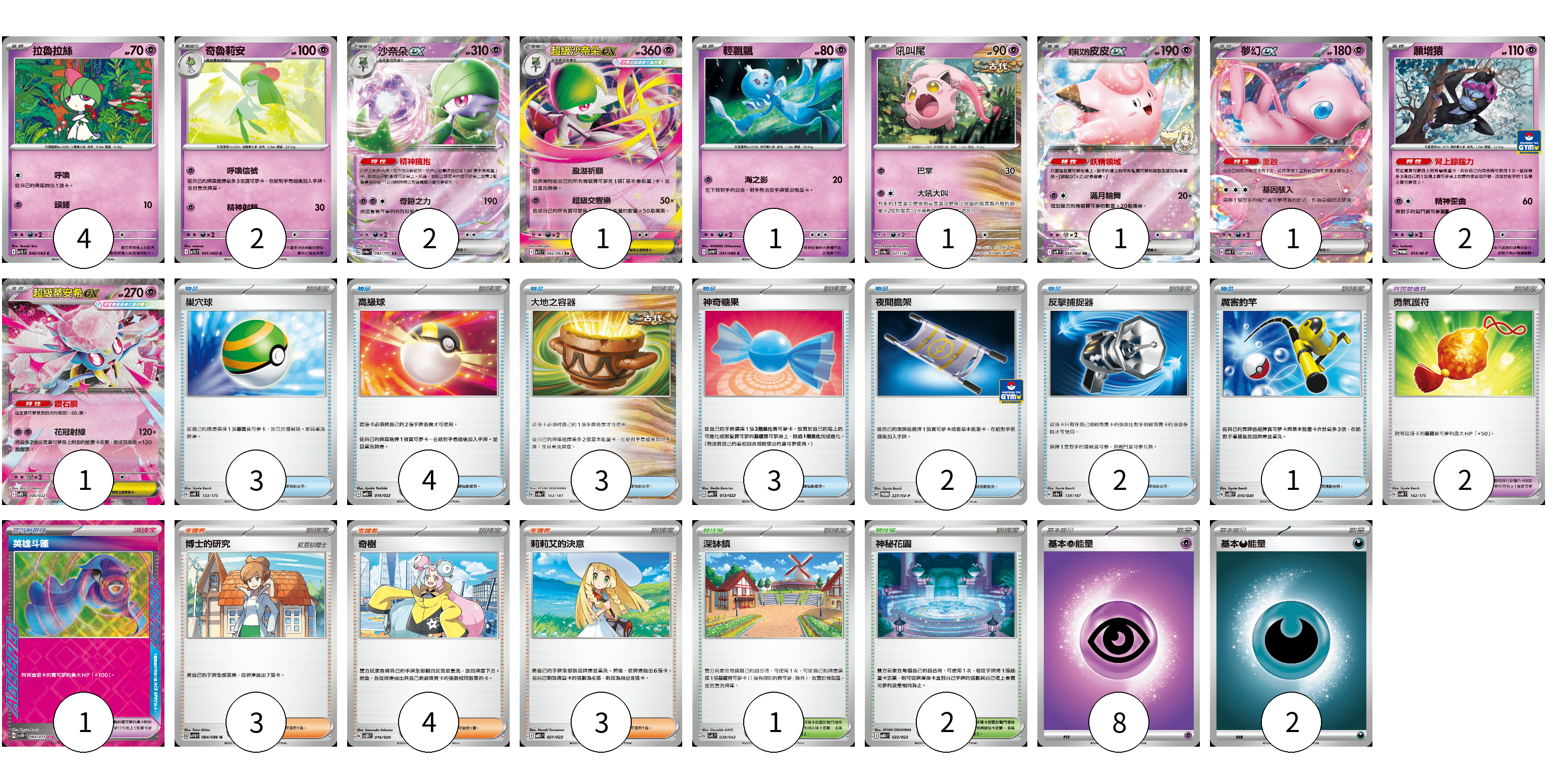 牌組構築方案 以此牌組為基礎新構築牌組 顯示卡面 顯示列表 寶可夢卡(16) 4 2 2 1 1 1 1 1 2 1 寶可夢道具(3) 2 1 物品卡(18) 3 4 3 3 2 2 1 支援者卡(10) 3 4 3 競技場卡(3) 1 2 能量卡(10) 8 2 寶可夢卡(16) 卡牌名稱 張數 卡牌名稱 張數 拉魯拉絲 M1S 040/063 04 奇魯莉安 M1S 041/063 02 沙奈朵ex SV4a 082/190 02 超級沙奈朵ex M1S 042/063 01 輕飄飄 SV11W 041/086 01 吼叫尾 SV8a 071/187 01 莉莉艾的皮皮ex SV9 033/100 01 夢幻ex SVK 001/042 01 願增猿 M-P 014/M-P 02 超級蒂安希ex MBD 006/022 01 寶可夢道具(3) 卡牌名稱 張數 卡牌名稱 張數 勇氣護符 SVM 142/175 02 英雄斗篷 SV5M 064/071 01 物品卡(18) 卡牌名稱 張數 卡牌名稱 張數 巢穴球 SVM 133/175 03 高級球 MBD 014/022 04 大地之容器 SV8a 143/187 03 神奇糖果 MBG 013/022 03 夜間擔架 SV-P 227/SV-P 02 反擊捕捉器 SV8a 139/187 02 厲害釣竿 SVOD 010/020 01 支援者卡(10) 卡牌名稱 張數 卡牌名稱 張數 博士的研究 SV11B 084/086 03 奇樹 SVOD 016/020 04 莉莉艾的決意 MBD 021/022 03 競技場卡(3) 卡牌名稱 張數 卡牌名稱 張數 深缽鎮 SVK 039/042 01 神秘花園 MBD 022/022 02 能量卡(10) 卡牌名稱 張數 卡牌名稱 張數 基本【超】能量 MBD PSY 08 基本【惡】能量 M-P DAR 02 以此牌組為基礎新構築牌組 牌組編碼 dKWBvr-EsYBQG-ouyyiI copy 列印牌組單 牌組編碼已複製 分享至SNS