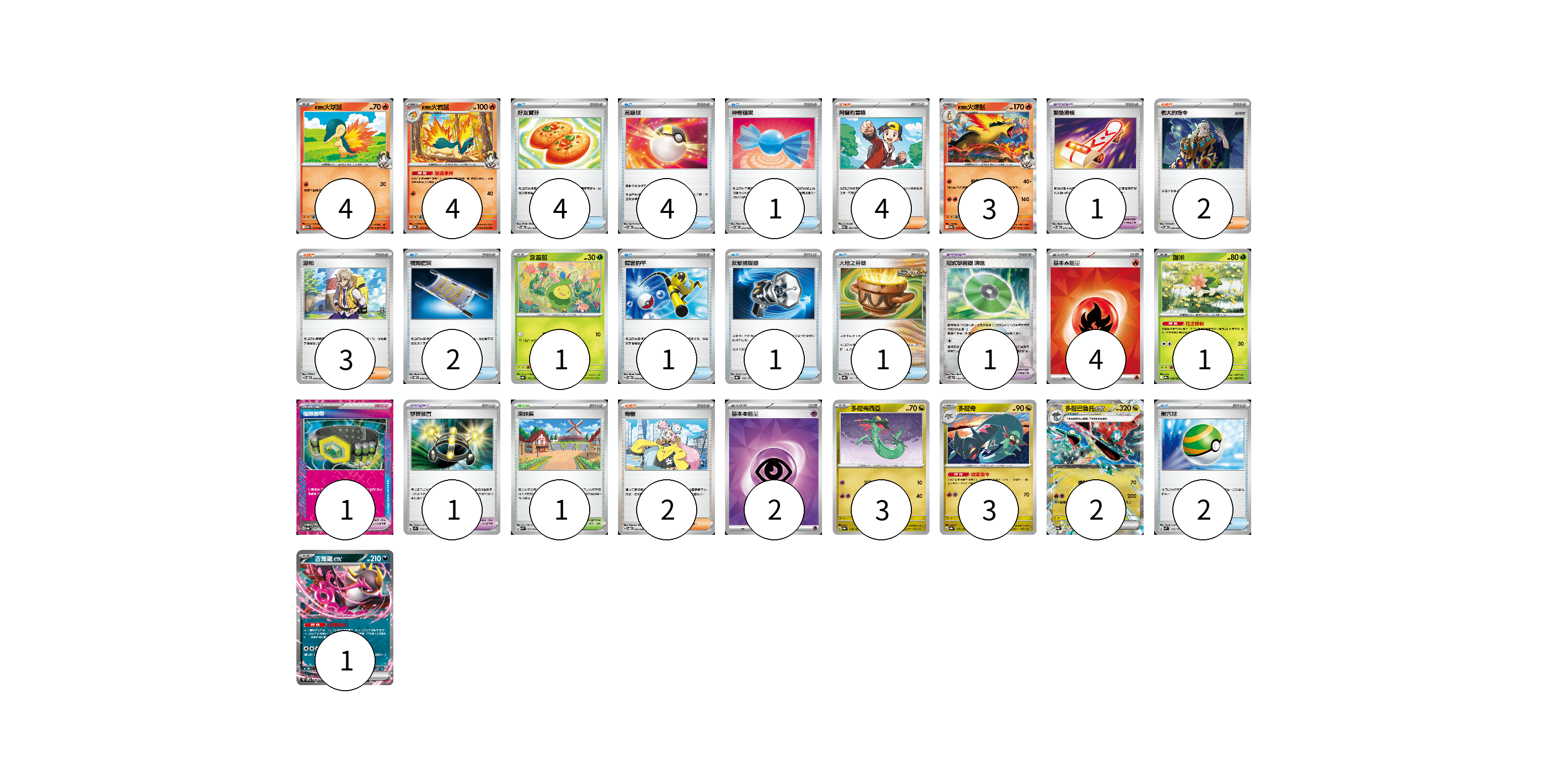 牌組構築方案 以此牌組為基礎新構築牌組 顯示卡面 顯示列表 寶可夢卡(22) 4 4 3 1 1 3 3 2 1 寶可夢道具(4) 1 1 1 1 物品卡(16) 4 4 1 2 1 1 1 2 支援者卡(11) 4 2 3 2 競技場卡(1) 1 能量卡(6) 4 2 寶可夢卡(22) 卡牌名稱 張數 卡牌名稱 張數 <阿響的>火球鼠 SV9a 015/063 04 <阿響的>火岩鼠 SV9a 016/063 04 <阿響的>火爆獸 SV9a 017/063 03 含羞苞 SV8a 001/187 01 謝米 SV9a 006/063 01 多龍梅西亞 SV8a 118/187 03 多龍奇 SV8a 119/187 03 多龍巴魯托ex SV8a 120/187 02 吉雉雞ex SVOM 009/021 01 寶可夢道具(4) 卡牌名稱 張數 卡牌名稱 張數 緊急滑板 SVOD 015/020 01 招式學習器 演進 SV8a 160/187 01 極限腰帶 SV8a 159/187 01 學習裝置 SV1S 072/078 01 物品卡(16) 卡牌名稱 張數 卡牌名稱 張數 好友寶芬 SVOD 011/020 04 高級球 SVOD 012/020 04 神奇糖果 SVOD 013/020 01 夜間擔架 SVOM 016/021 02 厲害釣竿 SVOD 010/020 01 反擊捕捉器 SV8a 139/187 01 大地之容器 SV8a 143/187 01 巢穴球 SVM 133/175 02 支援者卡(11) 卡牌名稱 張數 卡牌名稱 張數 阿響的冒險 SV9a 063/063 04 老大的指令 SVOD 019/020 02 派帕 SVOD 018/020 03 奇樹 SVOD 016/020 02 競技場卡(1) 卡牌名稱 張數 卡牌名稱 張數 深缽鎮 SVK 039/042 01 能量卡(6) 卡牌名稱 張數 卡牌名稱 張數 基本【火】能量 SVK FIR 04 基本【超】能量 SVOD PSY 02 以此牌組為基礎新構築牌組 牌組編碼 dLCpUx-XwddqB-HaKJDY copy 列印牌組單 牌組編碼已複製 分享至SNS