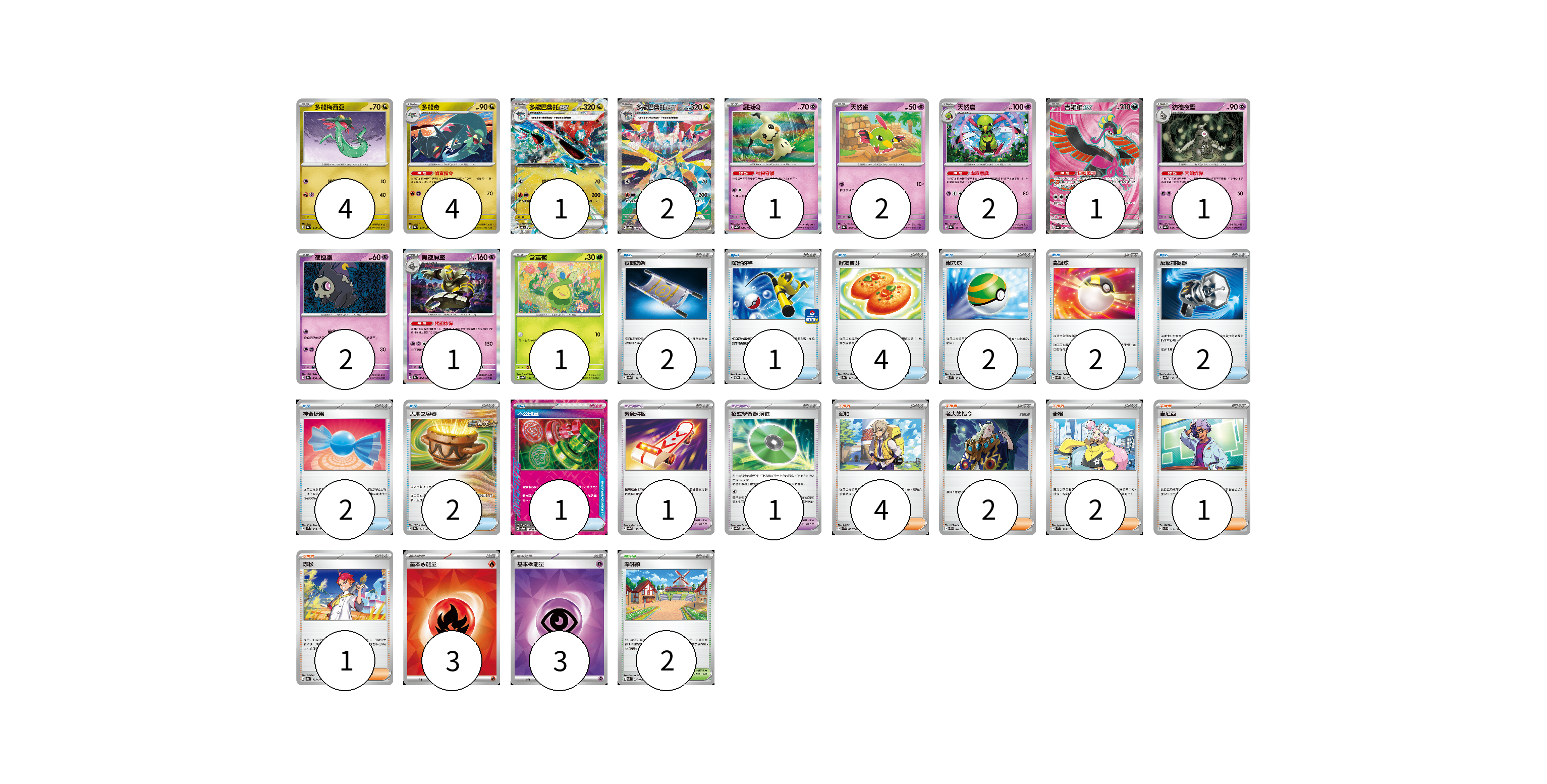 牌組構築方案 以此牌組為基礎新構築牌組 顯示卡面 顯示列表 寶可夢卡(22) 4 4 1 2 1 2 2 1 1 2 1 1 寶可夢道具(2) 1 1 物品卡(18) 2 1 4 2 2 2 2 2 1 支援者卡(10) 4 2 2 1 1 競技場卡(2) 2 能量卡(6) 3 3 寶可夢卡(22) 卡牌名稱 張數 卡牌名稱 張數 多龍梅西亞 SV8a 118/187 04 多龍奇 SV8a 119/187 04 多龍巴魯托ex SV6 081/101 01 多龍巴魯托ex SV8a 221/187 02 謎擬Q SV4a 088/190 01 天然雀 SV8a 060/187 02 天然鳥 SV8a 061/187 02 吉雉雞ex SV6a 081/064 01 彷徨夜靈 SV8a 065/187 01 夜巡靈 SV8a 064/187 02 黑夜魔靈 SV8a 066/187 01 含羞苞 SV8a 001/187 01 寶可夢道具(2) 卡牌名稱 張數 卡牌名稱 張數 緊急滑板 SV8a 153/187 01 招式學習器 演進 SV8a 160/187 01 物品卡(18) 卡牌名稱 張數 卡牌名稱 張數 夜間擔架 SV8a 151/187 02 厲害釣竿 SV-P 112/SV-P 01 好友寶芬 SV8a 147/187 04 巢穴球 SVM 133/175 02 高級球 SVAL 013/021 02 反擊捕捉器 SV8a 139/187 02 神奇糖果 SVM 135/175 02 大地之容器 SV8a 143/187 02 不公印章 SV5a 053/066 01 支援者卡(10) 卡牌名稱 張數 卡牌名稱 張數 派帕 SVK 035/042 04 老大的指令 SVEL 019/020 02 奇樹 SVM 160/175 02 吉尼亞 SVD 129/139 01 赤松 SV8a 163/187 01 競技場卡(2) 卡牌名稱 張數 卡牌名稱 張數 深缽鎮 SVK 039/042 02 能量卡(6) 卡牌名稱 張數 卡牌名稱 張數 基本【火】能量 SVK FIR 03 基本【超】能量 SVK PSY 03 以此牌組為基礎新構築牌組 牌組編碼 dOHrpD-olerem-ghLilp copy 列印牌組單 牌組編碼已複製 分享至SNS
