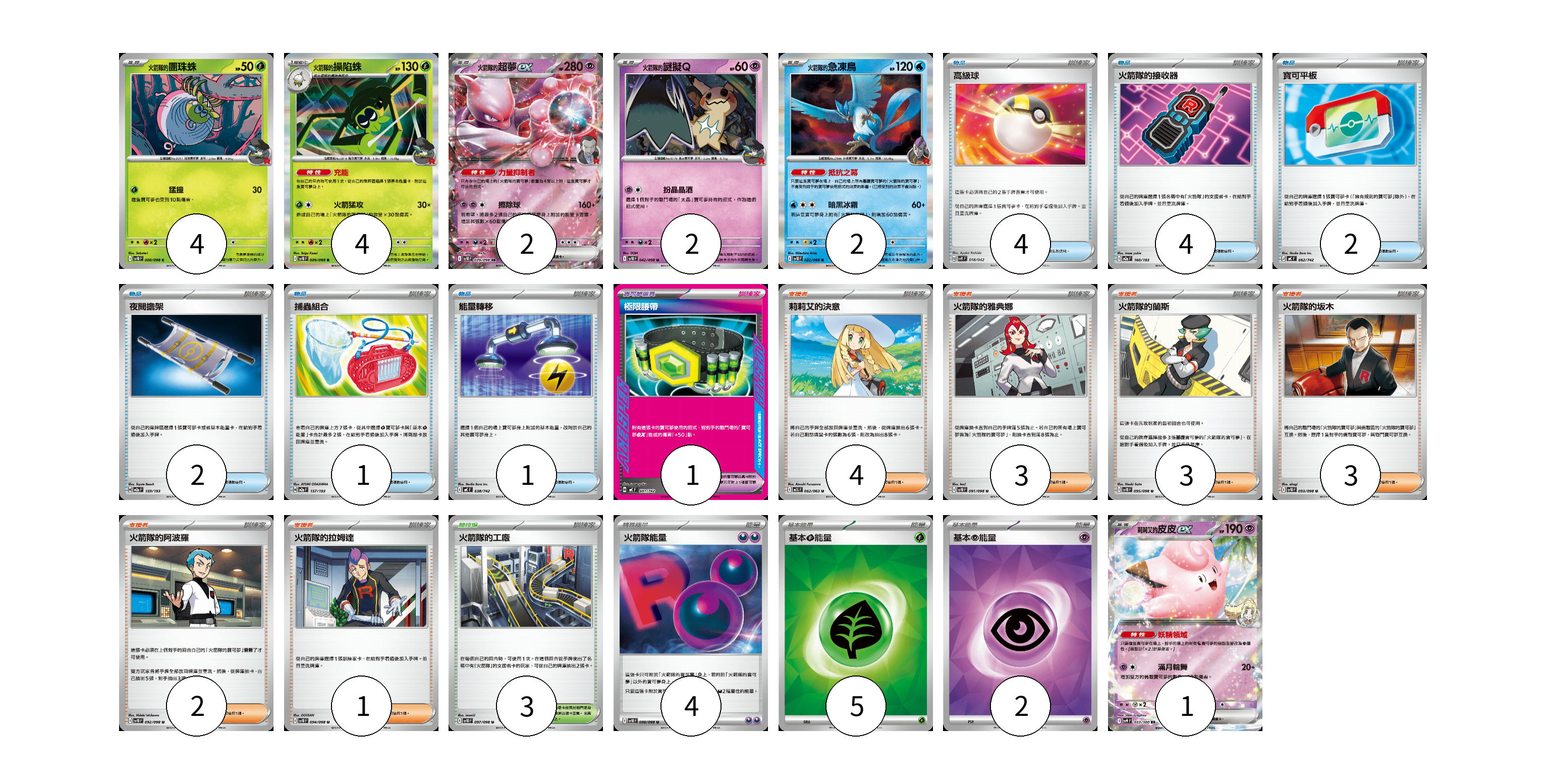 牌組構築方案 以此牌組為基礎新構築牌組 顯示卡面 顯示列表 寶可夢卡(15) 4 4 2 2 2 1 寶可夢道具(1) 1 物品卡(14) 4 4 2 2 1 1 支援者卡(16) 4 3 3 3 2 1 競技場卡(3) 3 能量卡(11) 4 5 2 寶可夢卡(15) 卡牌名稱 張數 卡牌名稱 張數 <火箭隊的>團珠蛛 SV10 008/098 04 <火箭隊的>操陷蛛 SV10 009/098 04 <火箭隊的>超夢ex SV10 039/098 02 <火箭隊的>謎擬Q SV10 042/098 02 <火箭隊的>急凍鳥 SV10 022/098 02 莉莉艾的皮皮ex SV9 033/100 01 寶可夢道具(1) 卡牌名稱 張數 卡牌名稱 張數 極限腰帶 MC 691/742 01 物品卡(14) 卡牌名稱 張數 卡牌名稱 張數 高級球 SVK 018/042 04 火箭隊的接收器 M2a 160/193 04 寶可平板 MC 662/742 02 夜間擔架 M2a 159/193 02 捕蟲組合 M2a 157/193 01 能量轉移 MC 638/742 01 支援者卡(16) 卡牌名稱 張數 卡牌名稱 張數 莉莉艾的決意 M1L 062/063 04 火箭隊的雅典娜 SV10 091/098 03 火箭隊的蘭斯 SV10 095/098 03 火箭隊的坂木 SV10 093/098 03 火箭隊的阿波羅 SV10 092/098 02 火箭隊的拉姆達 SV10 094/098 01 競技場卡(3) 卡牌名稱 張數 卡牌名稱 張數 火箭隊的工廠 SV10 097/098 03 能量卡(11) 卡牌名稱 張數 卡牌名稱 張數 火箭隊能量 SV10 098/098 04 基本【草】能量 SVK GRA 05 基本【超】能量 SVK PSY 02 以此牌組為基礎新構築牌組 牌組編碼 dSskGL-HbjHcN-SnINgL copy 列印牌組單 牌組編碼已複製 分享至SNS